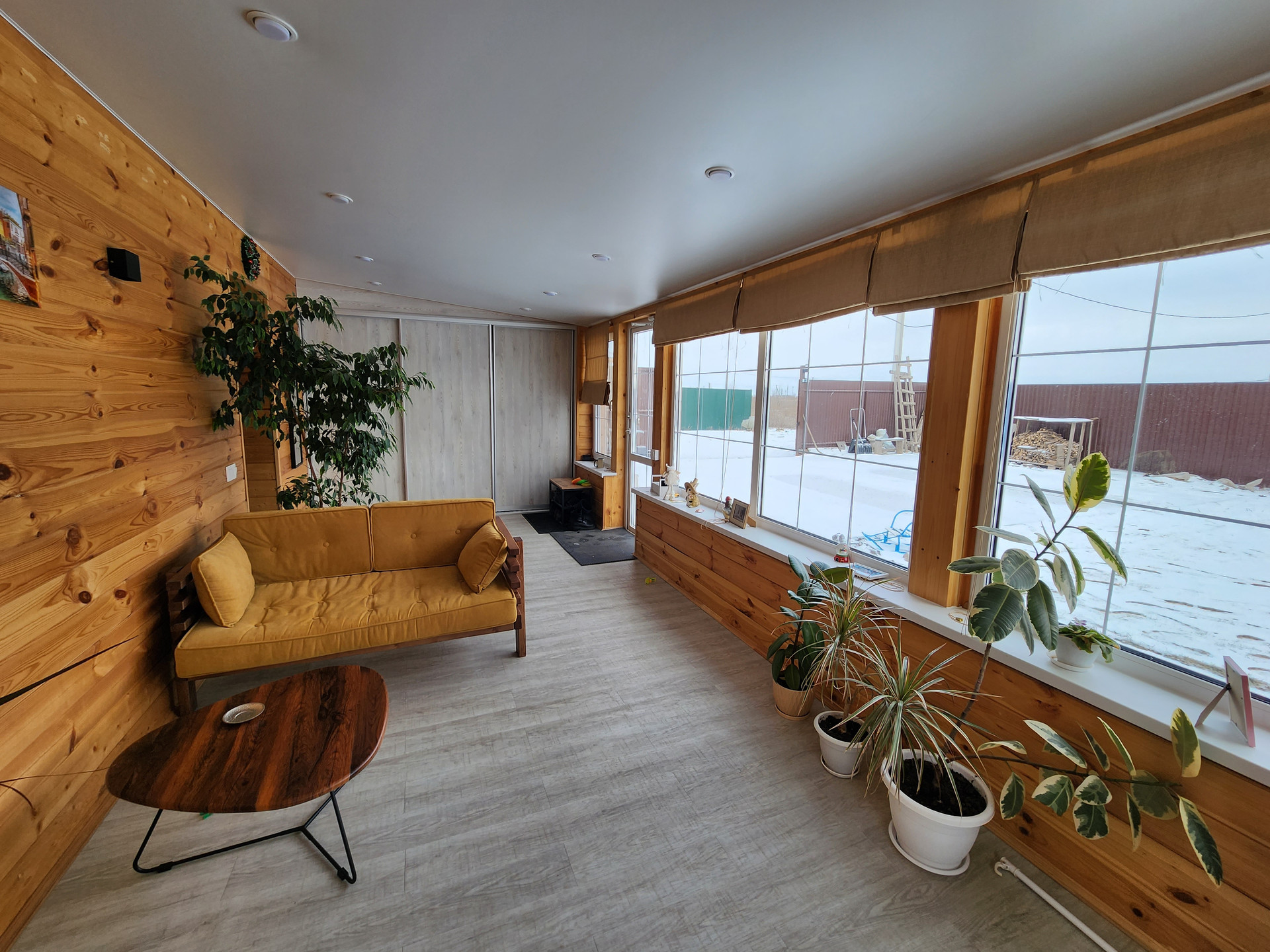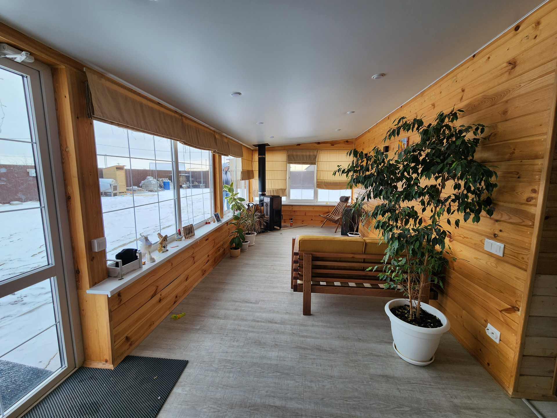 - веранда с витражными окнами и камином