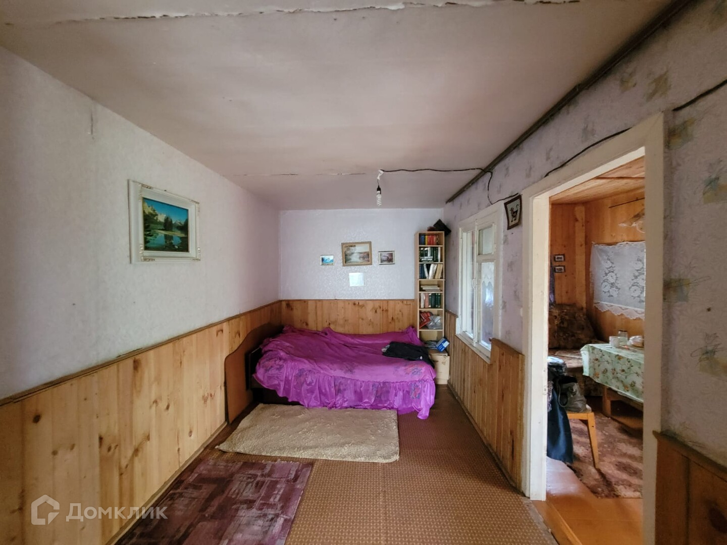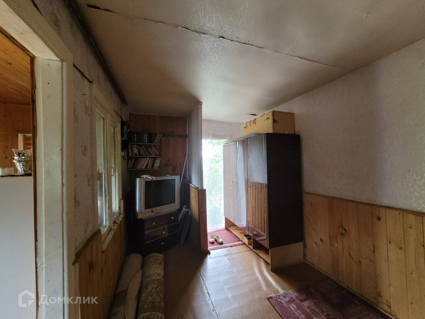 На участке одноэтажный щитовой дом ~ 25 кв.м. одна большая комната, пристрой кухня, веранда.