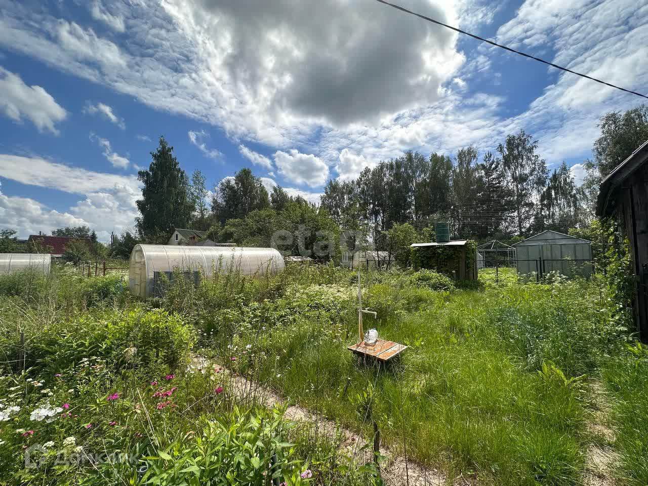 На участке есть хозпостройки. На участке посажены плодовые деревья и кусты, есть три теплицы и грядки.