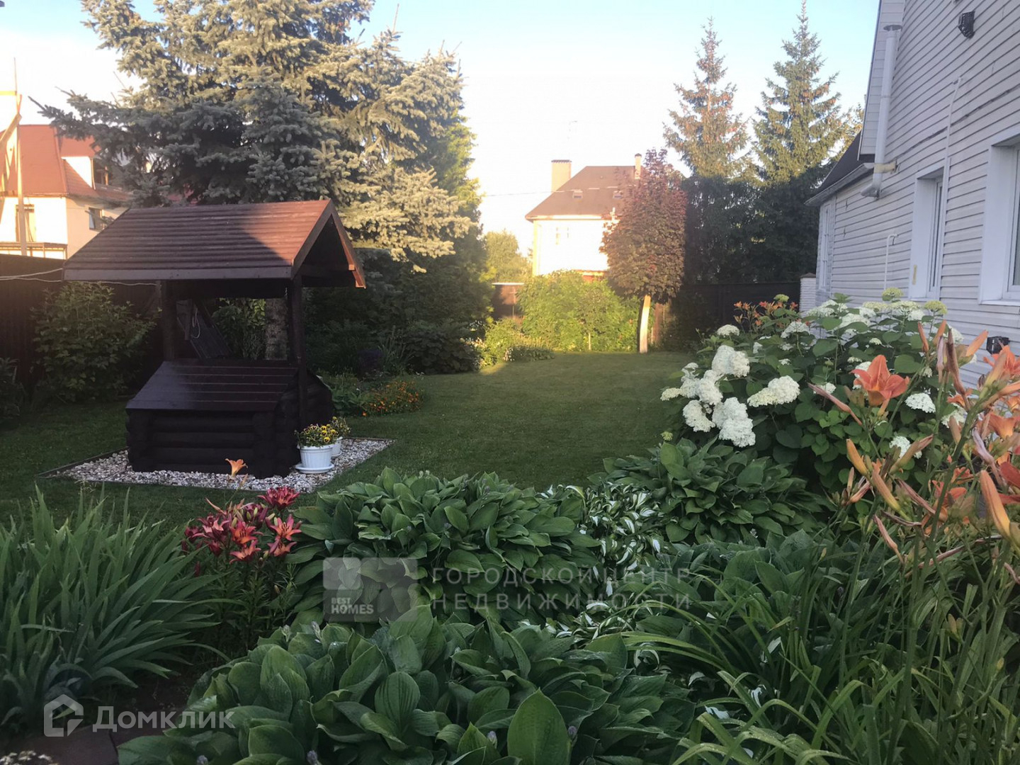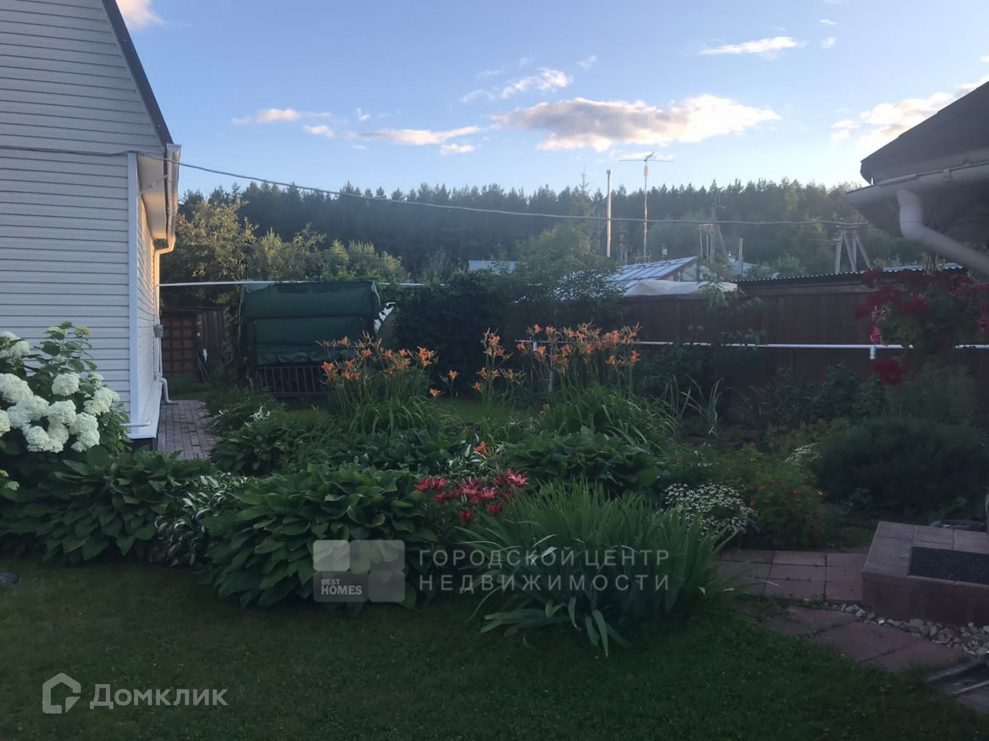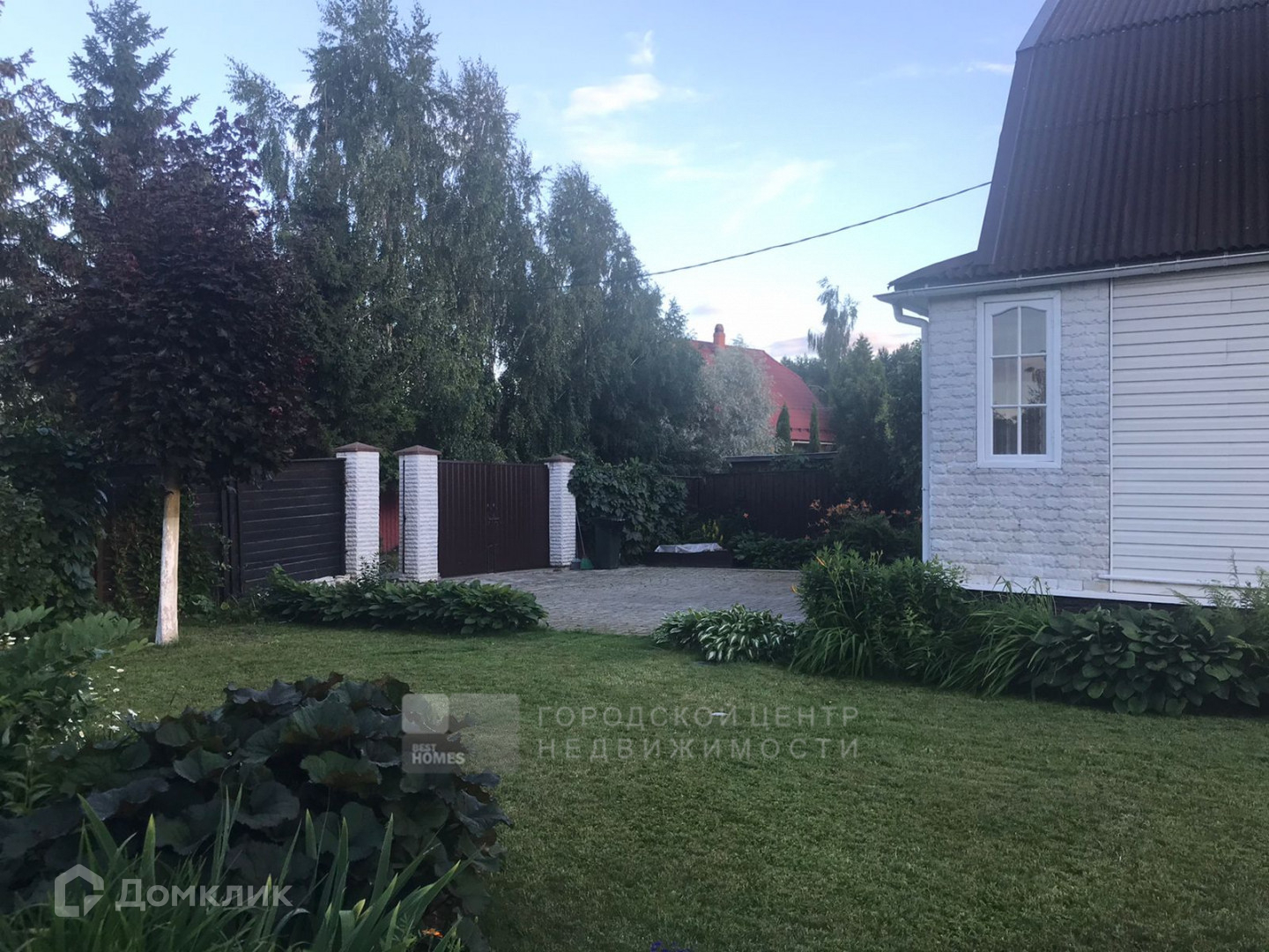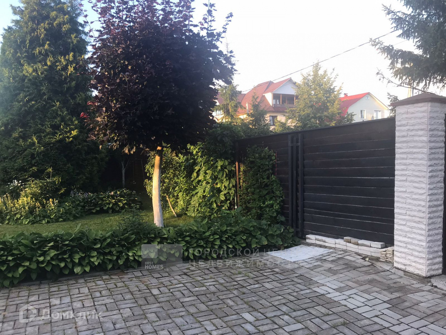 На ровном, ухоженном участке в 6,4 сотки есть беседка, теплица, лесные и садовые деревья, кустарники, парковочное место выполнено брусчаткой.