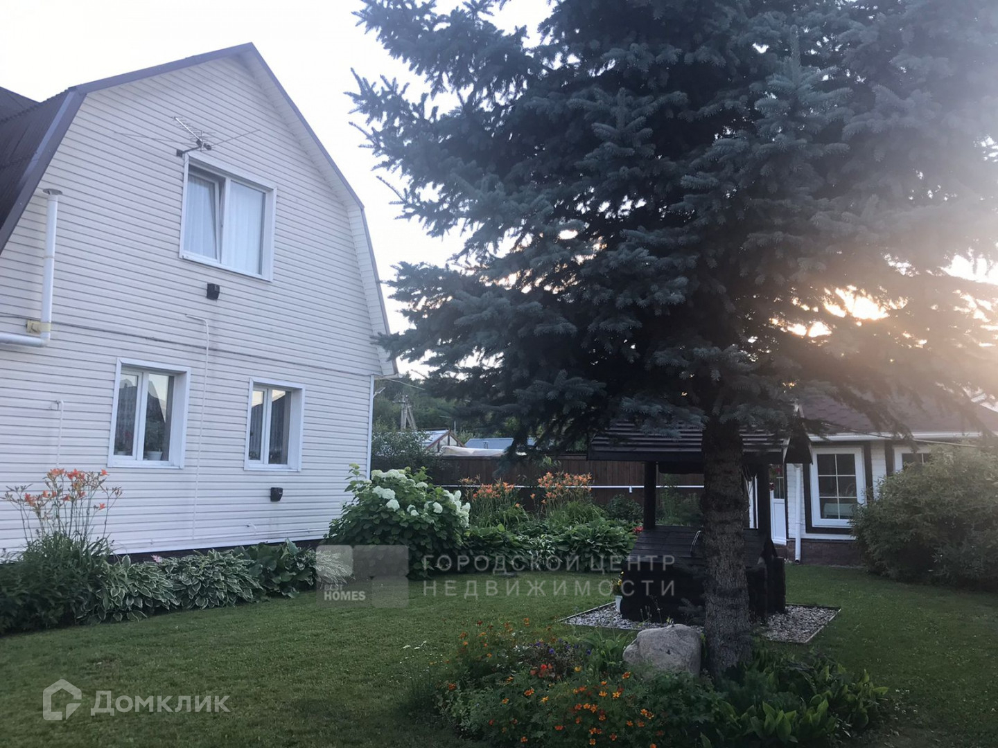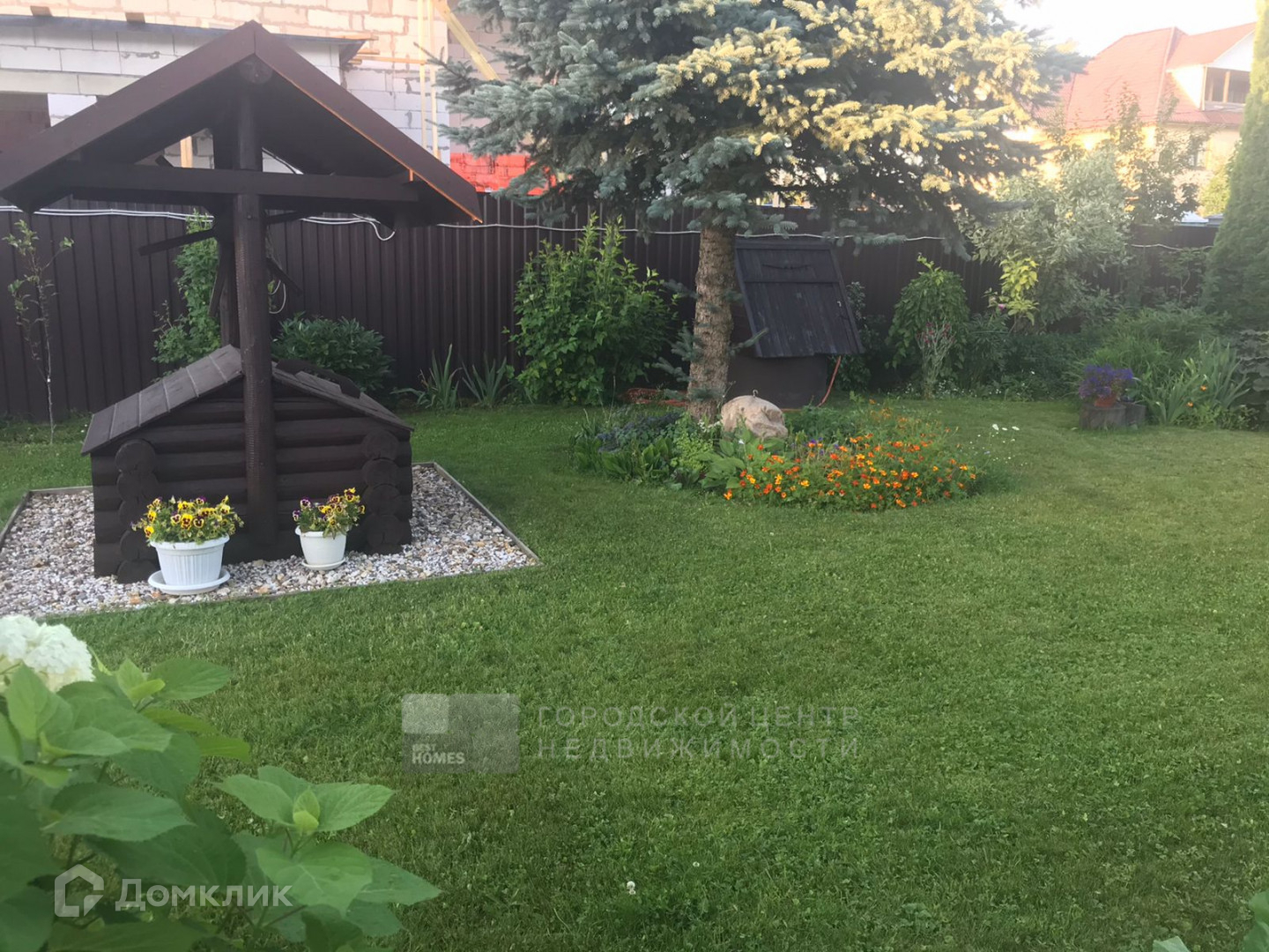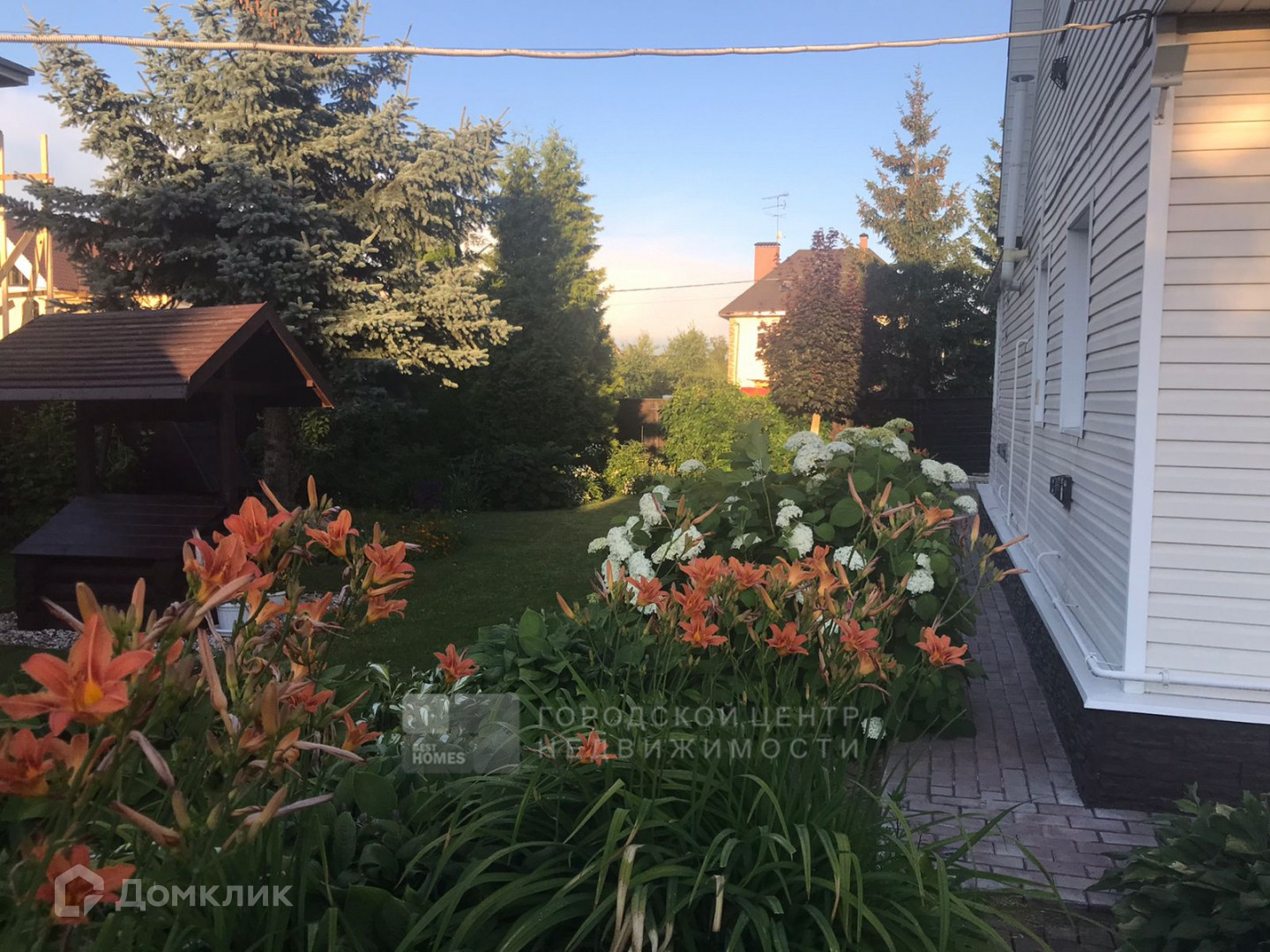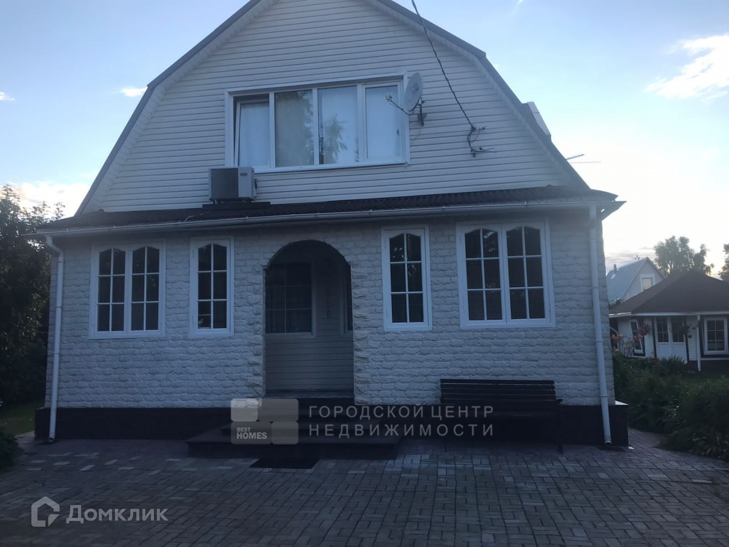 На ровном, ухоженном участке в 6,4 сотки есть беседка, теплица, лесные и садовые деревья, кустарники, парковочное место выполнено брусчаткой.