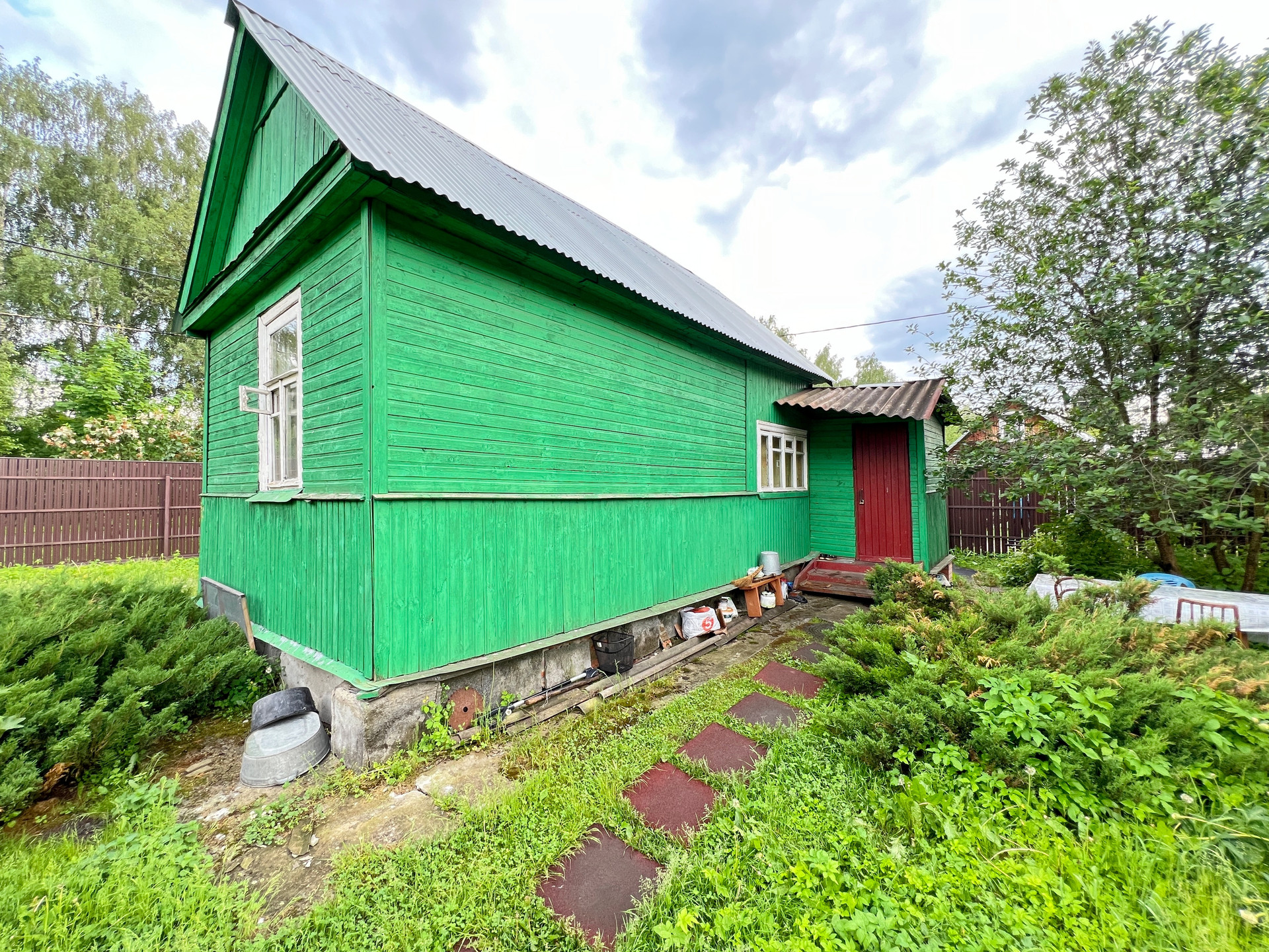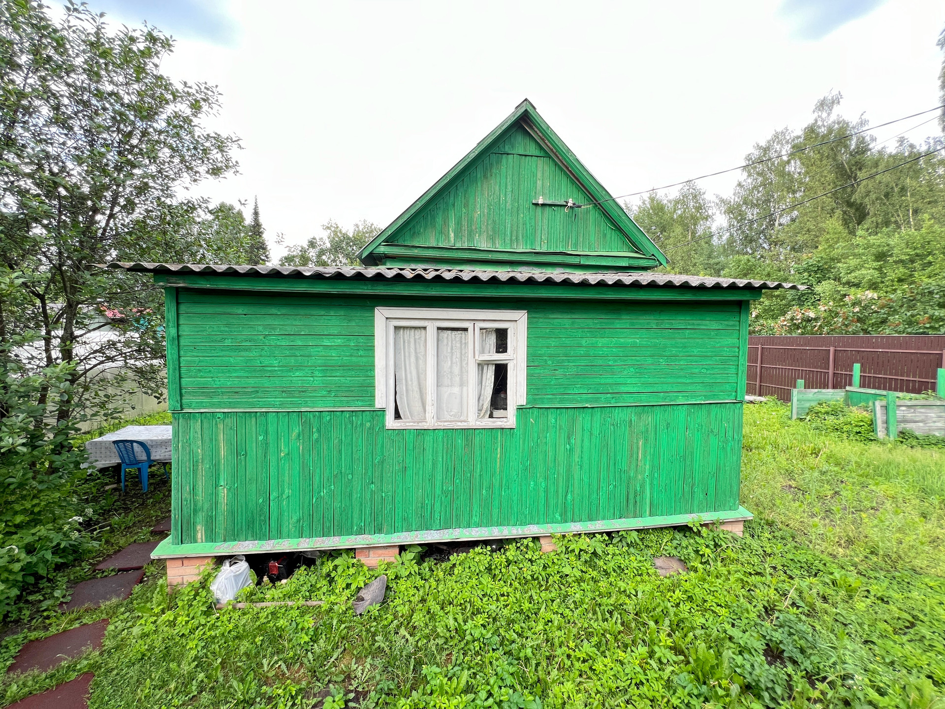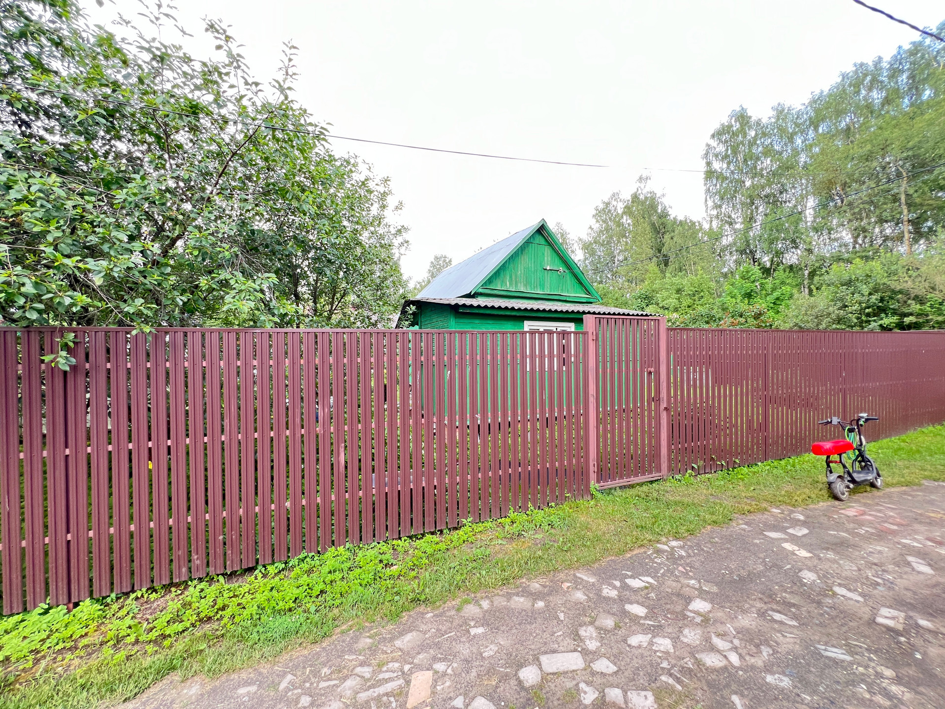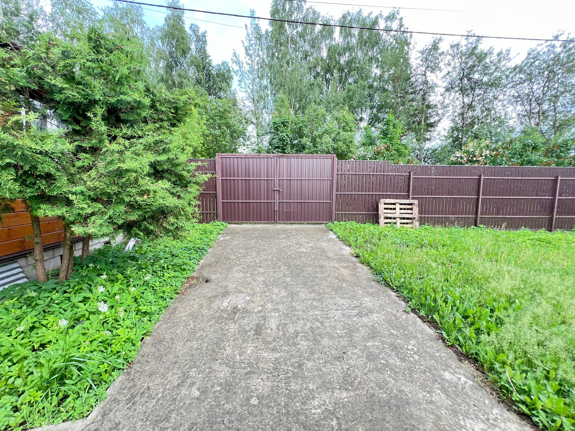 Участок 6.7 соток правильной формы, межевание проведено, весной не затапливает. По периметру огорожен забором, есть ворота для въезда автомобиля, забетонированная площадка.