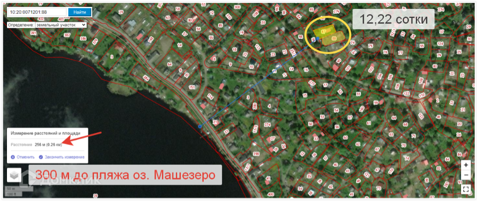 Участок ровный, сухой, расположен в центре деревни на возвышенности, откуда открывается шикарный вид на озеро Машезеро. Заезд на участок возможен с двух сторон. Состоит из двух смежных участков. Сделано межевание.