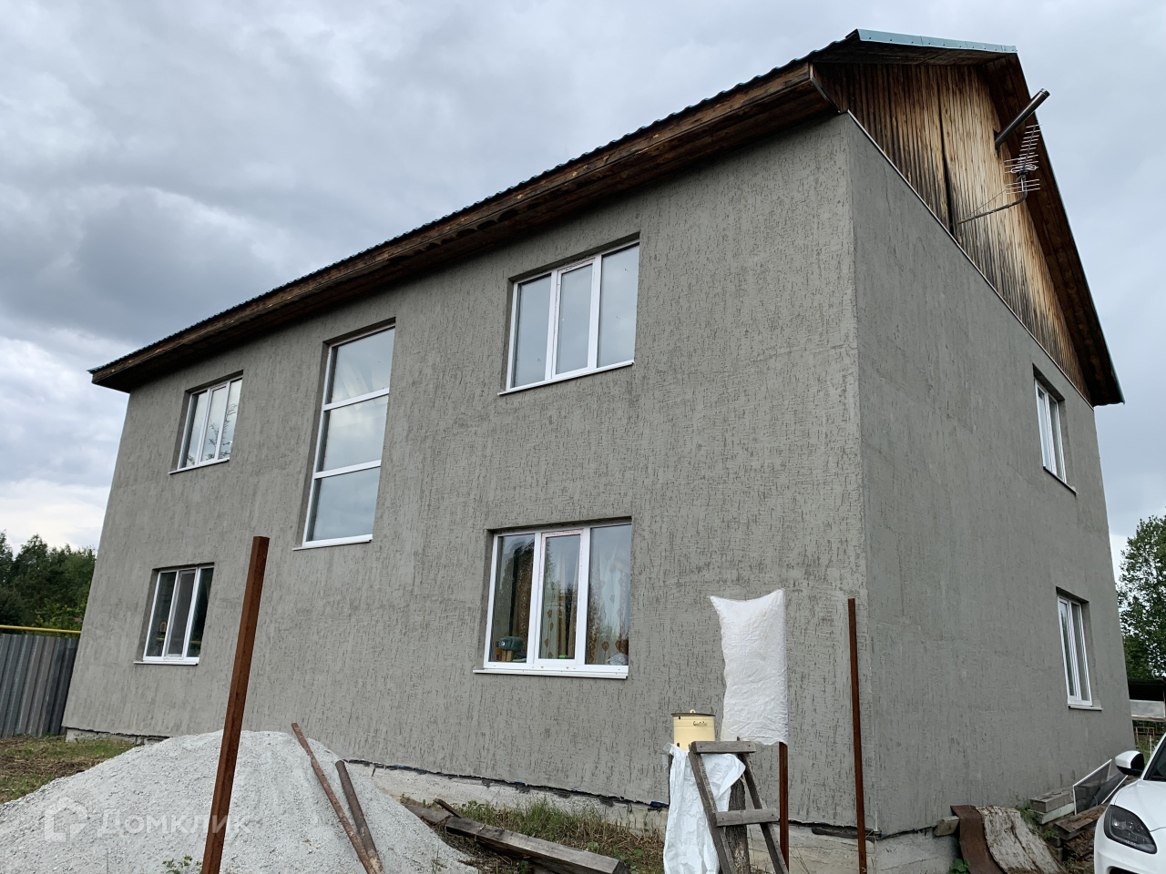 Дом построен из твин блока, фасад - с отделкой, крыша – метало черепица, пластиковые стеклопакеты везде, внутренняя отделка частичная.