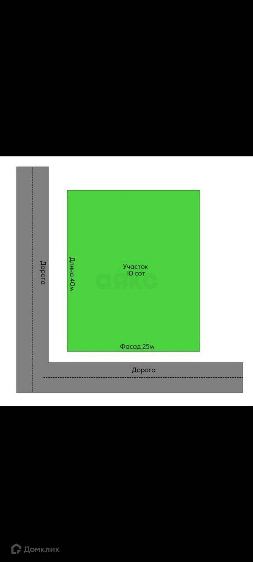 Площадь 10 соток. Участок ровный, правильной формы, угловой! Фасад 25-40 метра.