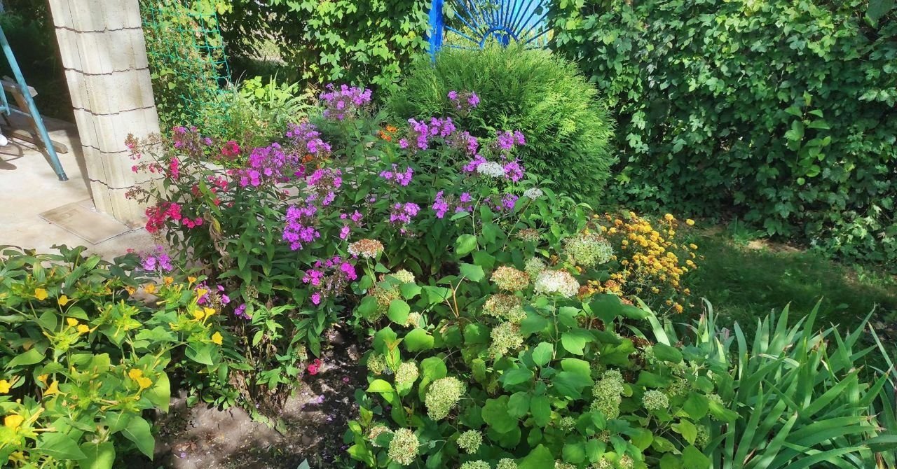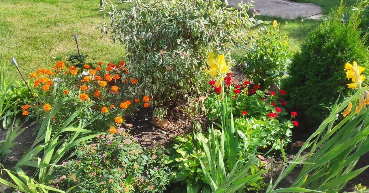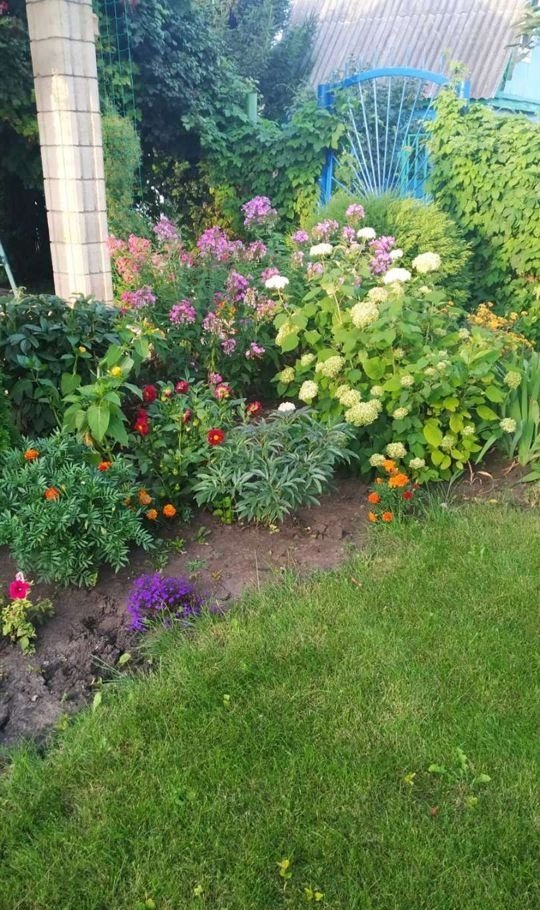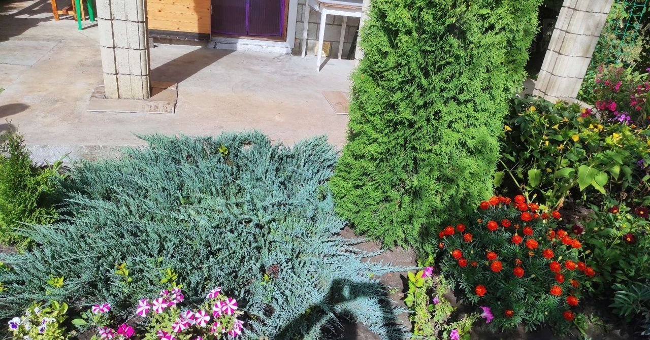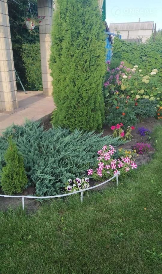 Участок 5 соток, часть занимает газон, выделено место под бассейн. Так же есть небольшой огород. Как раз для не напряжного огородства. Много хвойников и цветников.