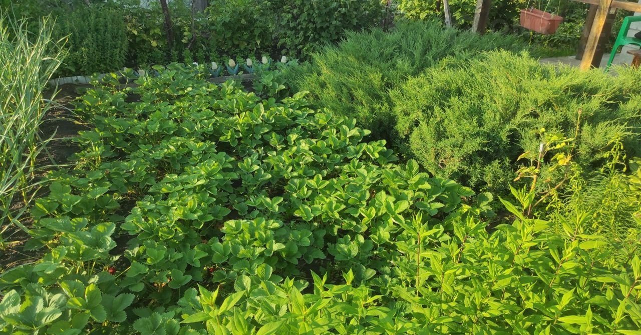 Посадки: малина, клубника, смородина, вишня, черешня, яблоня, калина. Все сорта очень вкусные, плодоносят.