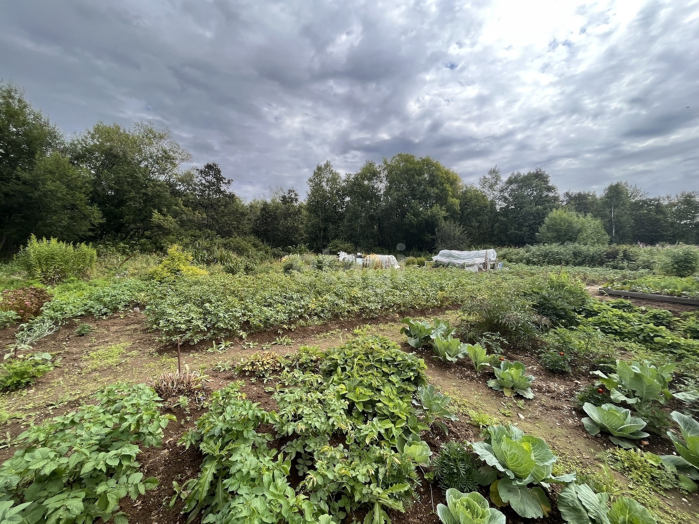 Участок ровный разбит на две части первая часть зелёное поле с низкой травой, вторая часть берёзы.