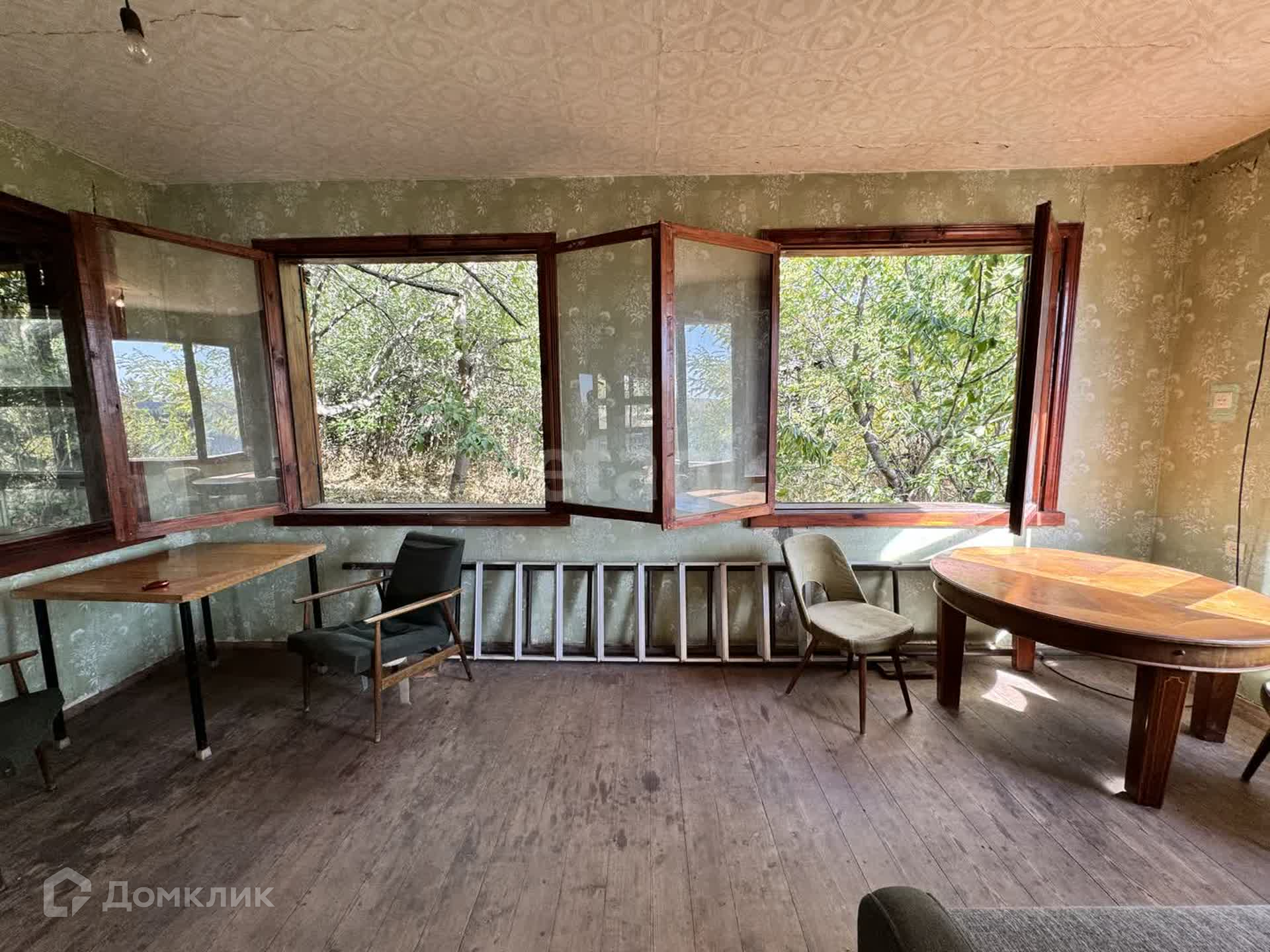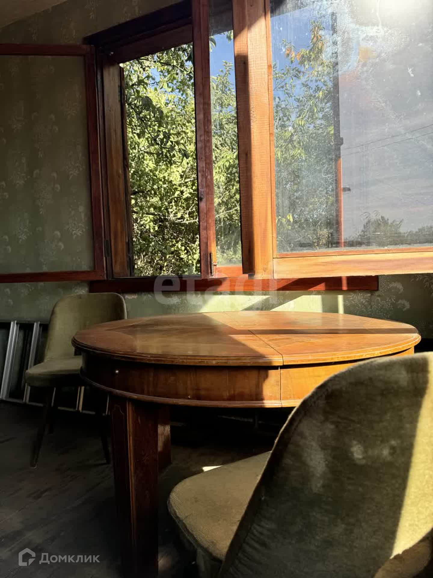 Застекленная веранда, она же кухня, остекленная в пол, в тени деревьев.