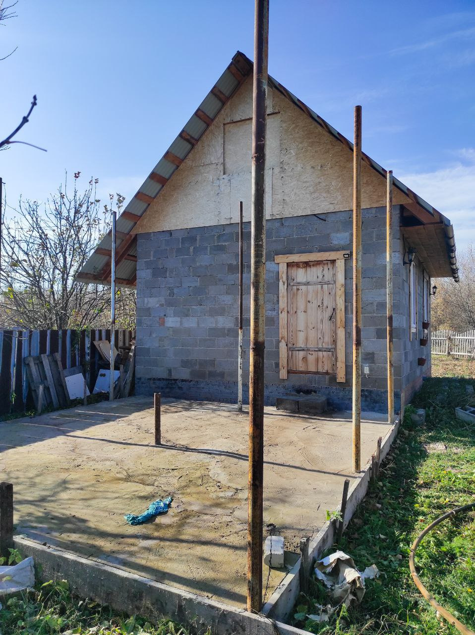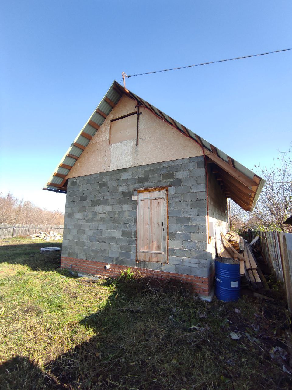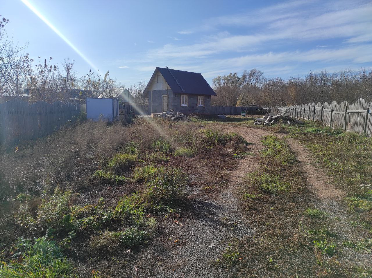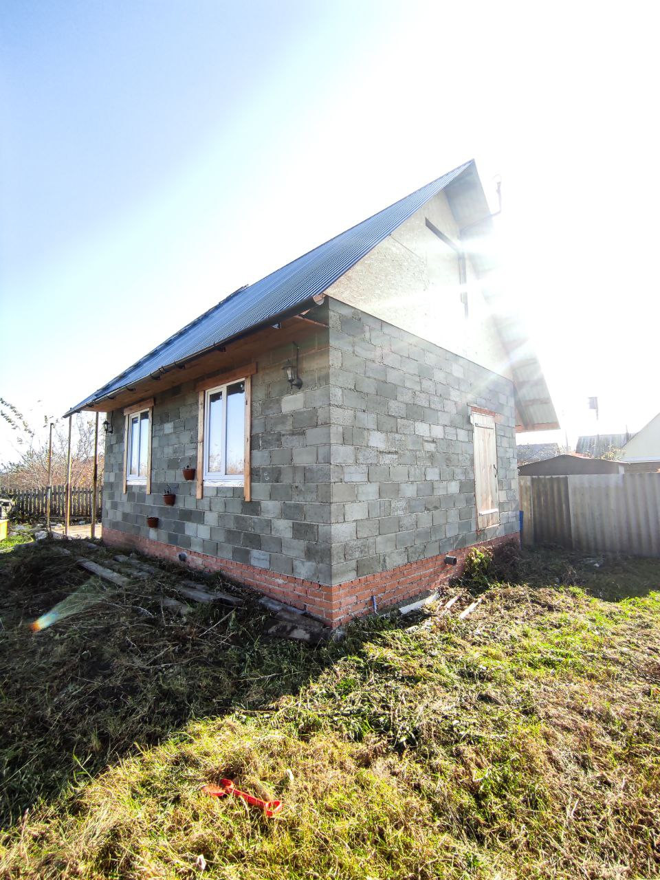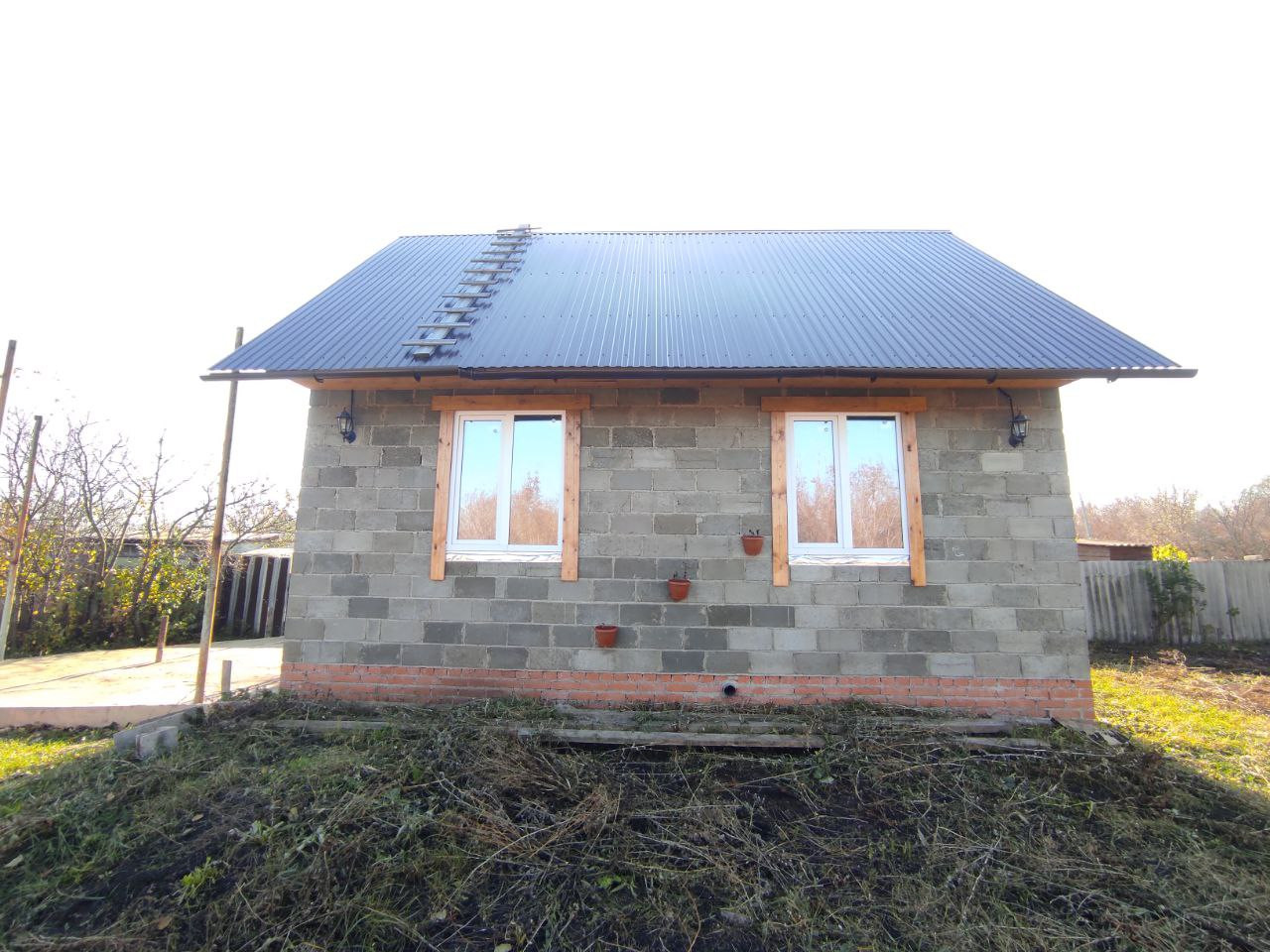 На участке возведен дом из шлакоблока, подведено электричество, водопровод и даже канализация.