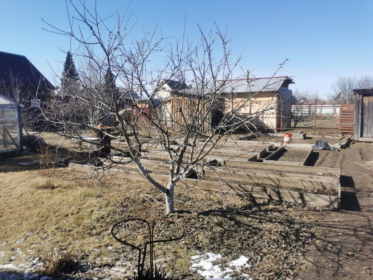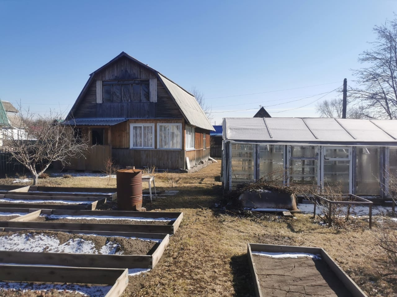 На участке плодово-ягодные деревья кустарники: жимолость,яблоня,слива,груша,смородина,малина.Есть теплица 3×8.Участок не топит.