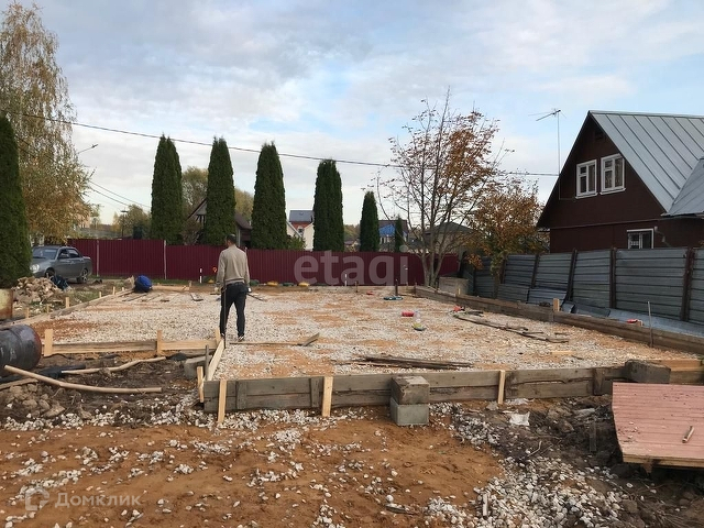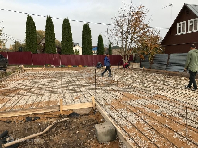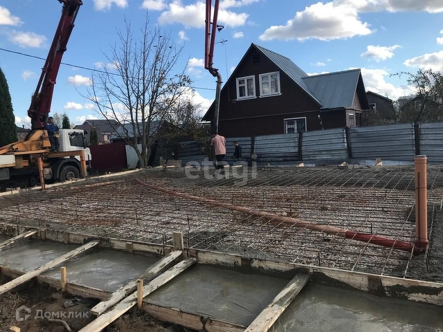 На участке залит фундамент (плита) размером 9 на 12 и веранда 5 на 3 с отмосткой. В фундамент заложена канализация. Все расстояния от границ участка выдержаны верно. Сделана гидроизоляция, участок огорожен рабицей. При необходимости можно сделать демонтаж фундамента если он не подойдет под проект вашего дома.