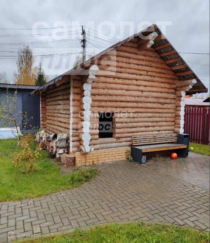 Участок огорожен забором, во дворе баня из бруса и мангальная зона из металла с крышей.