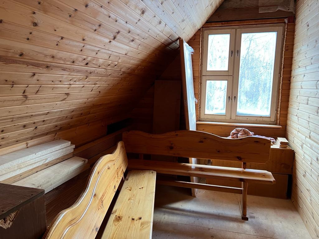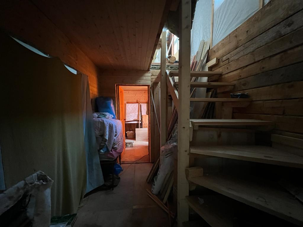 Основной дом из бруса и готов для проживания летом, отопление электрическое ИК- обогреватели, вода не заведена.  На втором этаже готова одна комната, соседняя занята материалом. Площадь