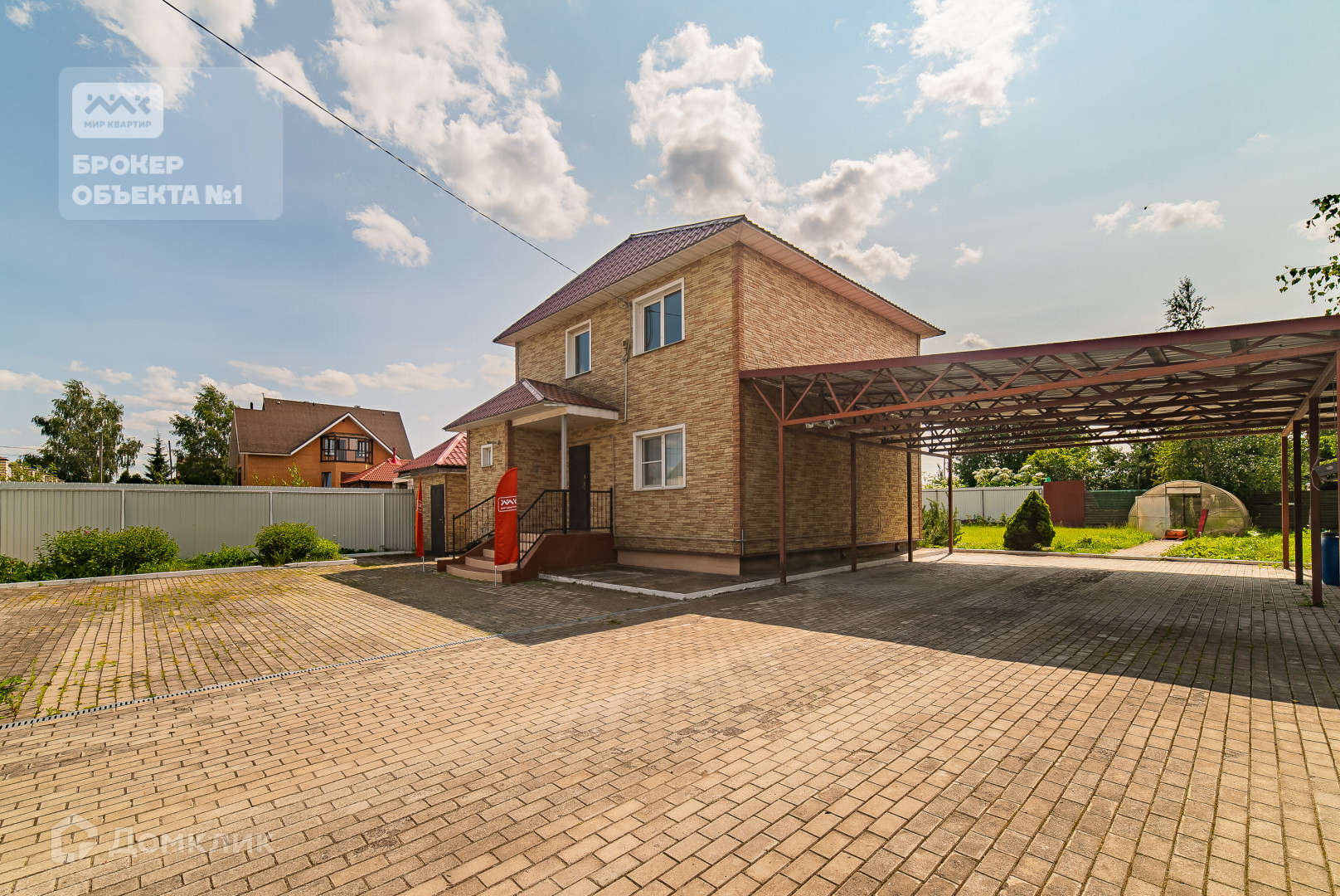 На территории участка расположен навес на 2 автомобиля. Большая часть участка вымощена плиткой, также оставлена зеленая зона для отдыха. По всему периметру забор, ворота электрические откатные.
