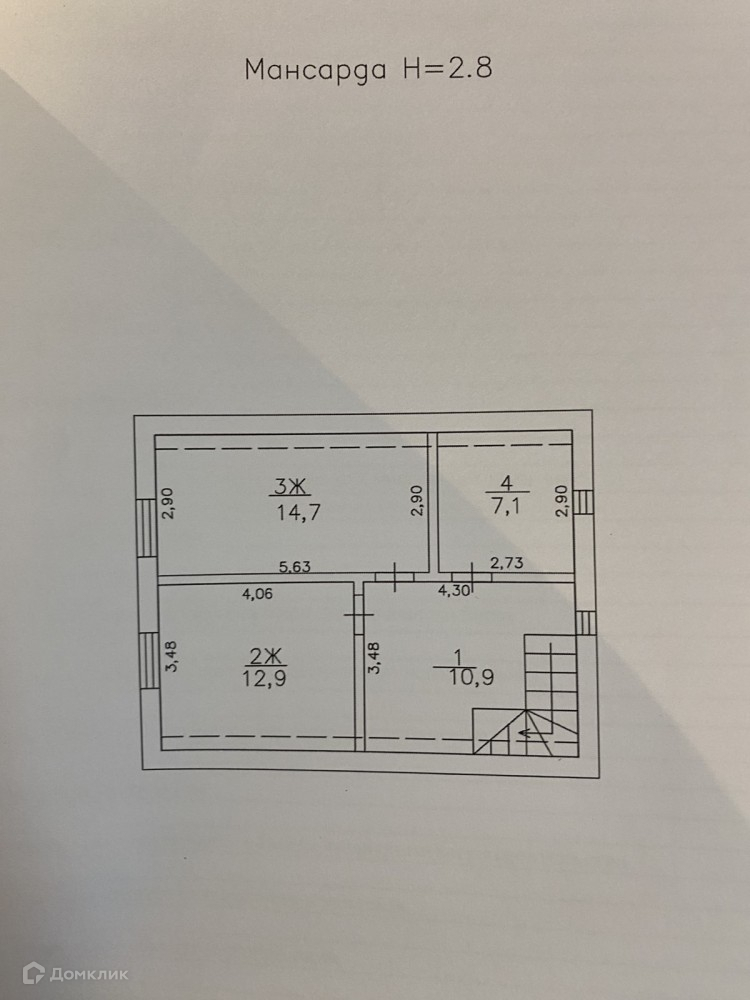 - На 2 этаже 3 жилых комнаты: 12,9; 14,7;7,1 и прихожая 10,9 кв.м.