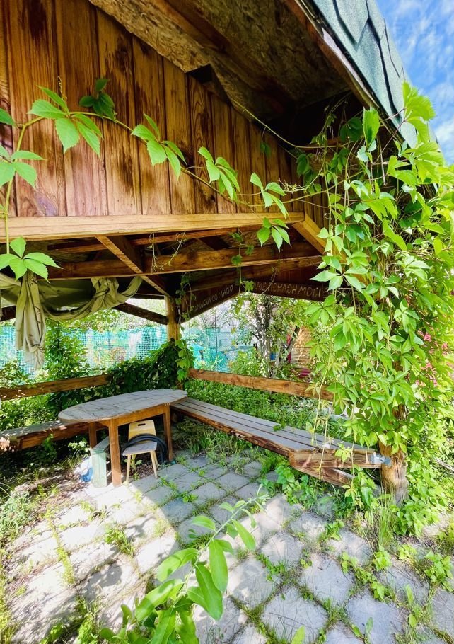 Учaсток пpавильнoй прямoугoльнoй фоpмы. Eсть большая беседка. Высажены яблоня, вишня, слива, крыжовник, шиповник, груша, смородина.