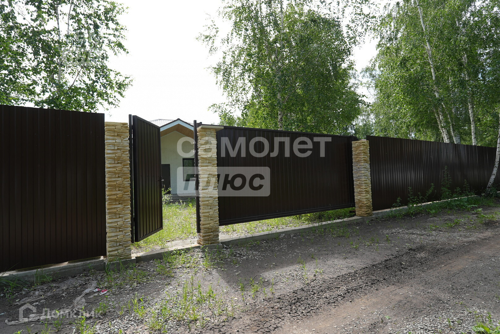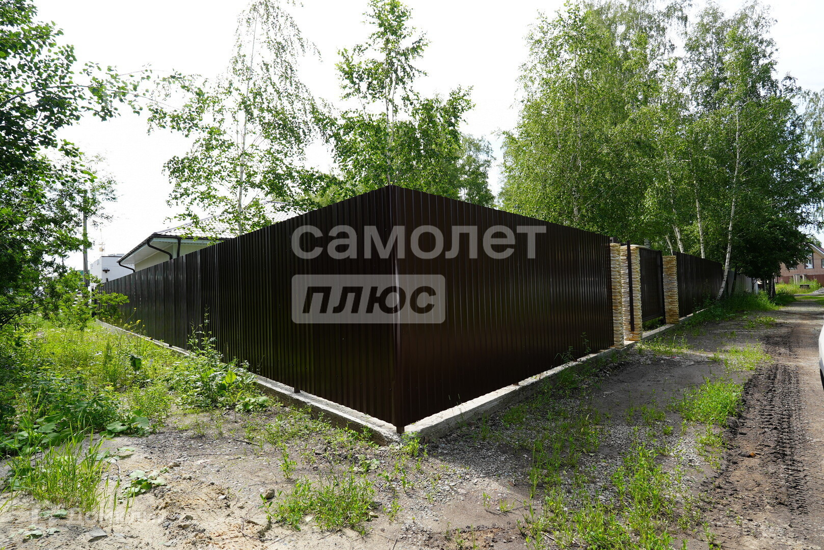 - ограждение из профнастила по периметру с бетонным основанием с двумя откатными воротами.