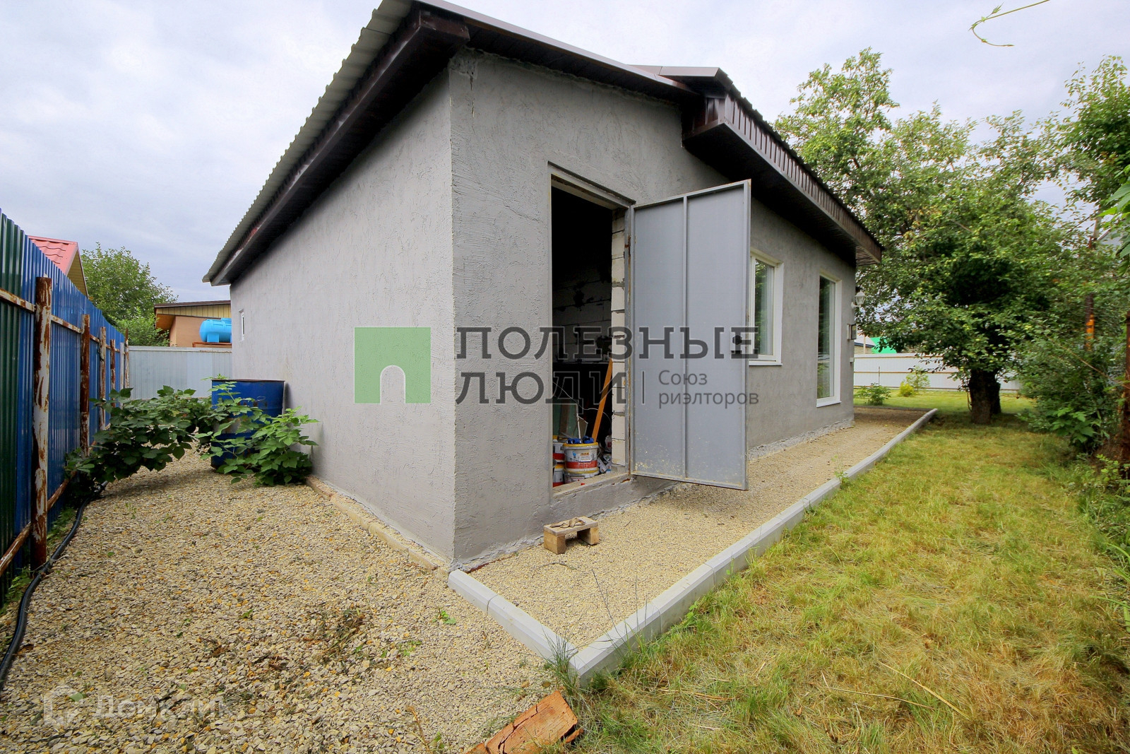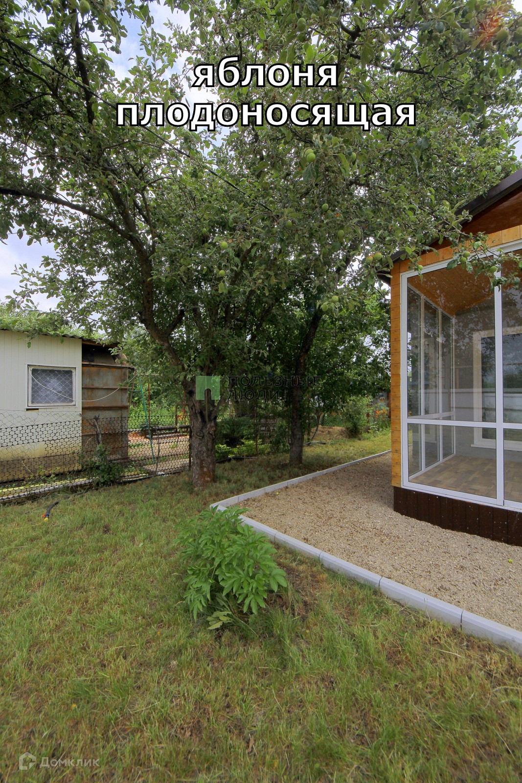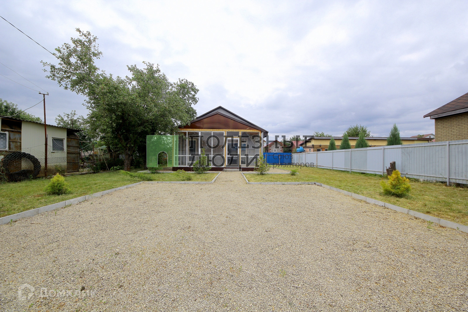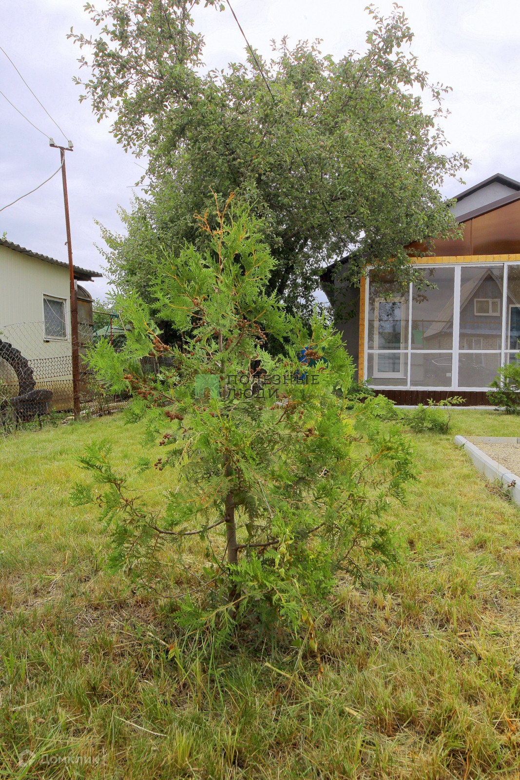 Дом обставлен стильными обоями на стенах и качественным ламинатом на полу. В нем также имеется туалет с душем и раковиной для вашего комфорта. Участок имеет ровную прямоугольную форму, покрыт газоном и украшен хвойными деревьями и плодовыми кустарниками. На территории есть забор с воротами, обеспечивающий уединение и безопасность.
