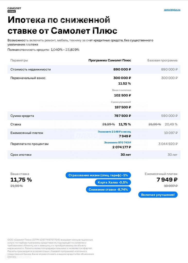 Расчет на ипотечном калькуляторе ONREALT.RU приблизительный, он не учитывает возможных дополнительных платежей. Точный расчет, условия ипотечных программ, срок, процентную ставку, график выплат и прочие особенности предоставляет банк при заключении договора об ипотечном кредитовании.