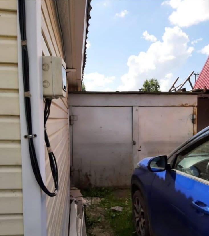 Гараж железный, к гаражу приделан большой бак под воду, бак настолько большой, что его можно использовать как мини-бассейн после бани. При необходимости на участке можно разместить две машины.