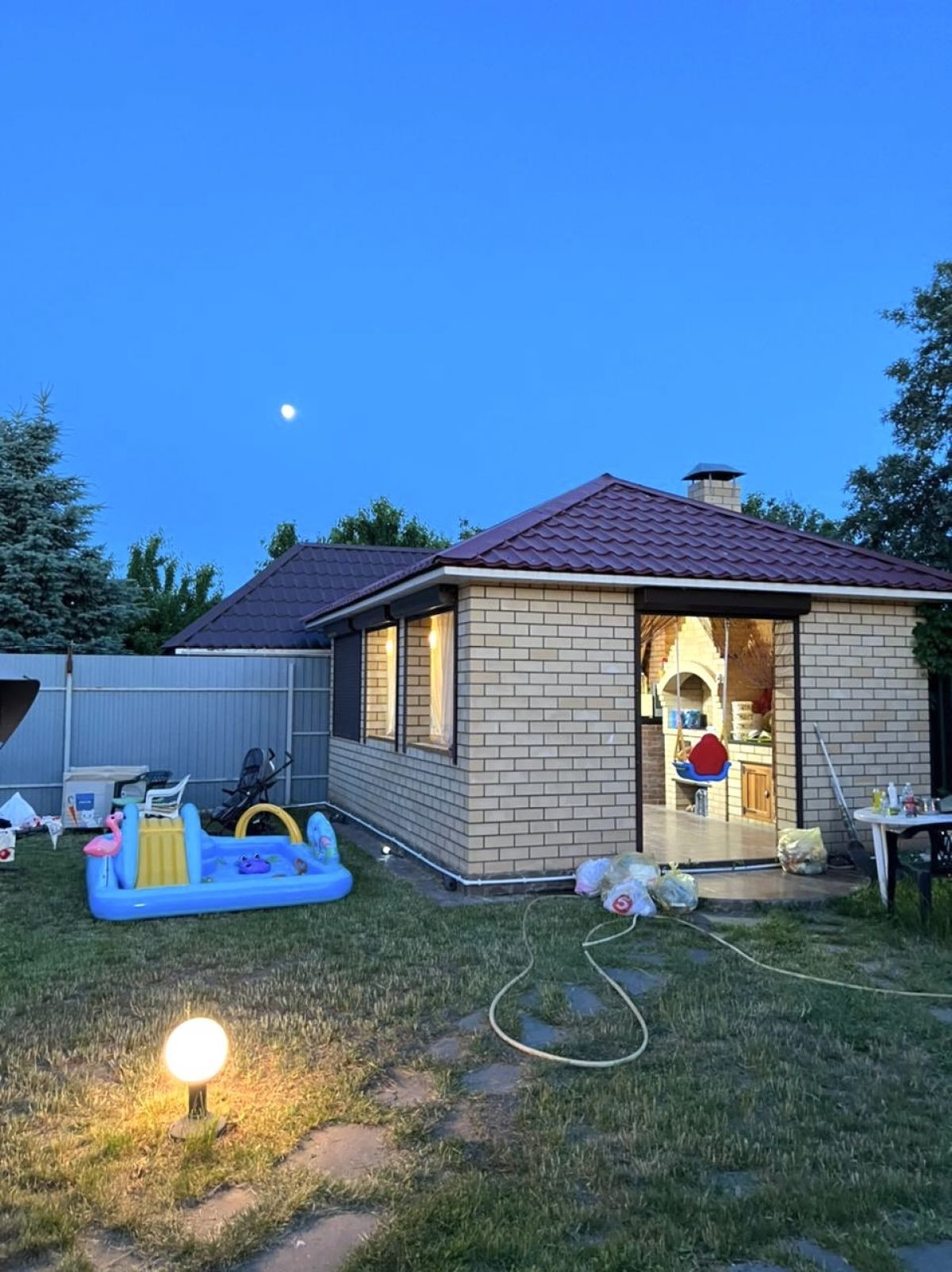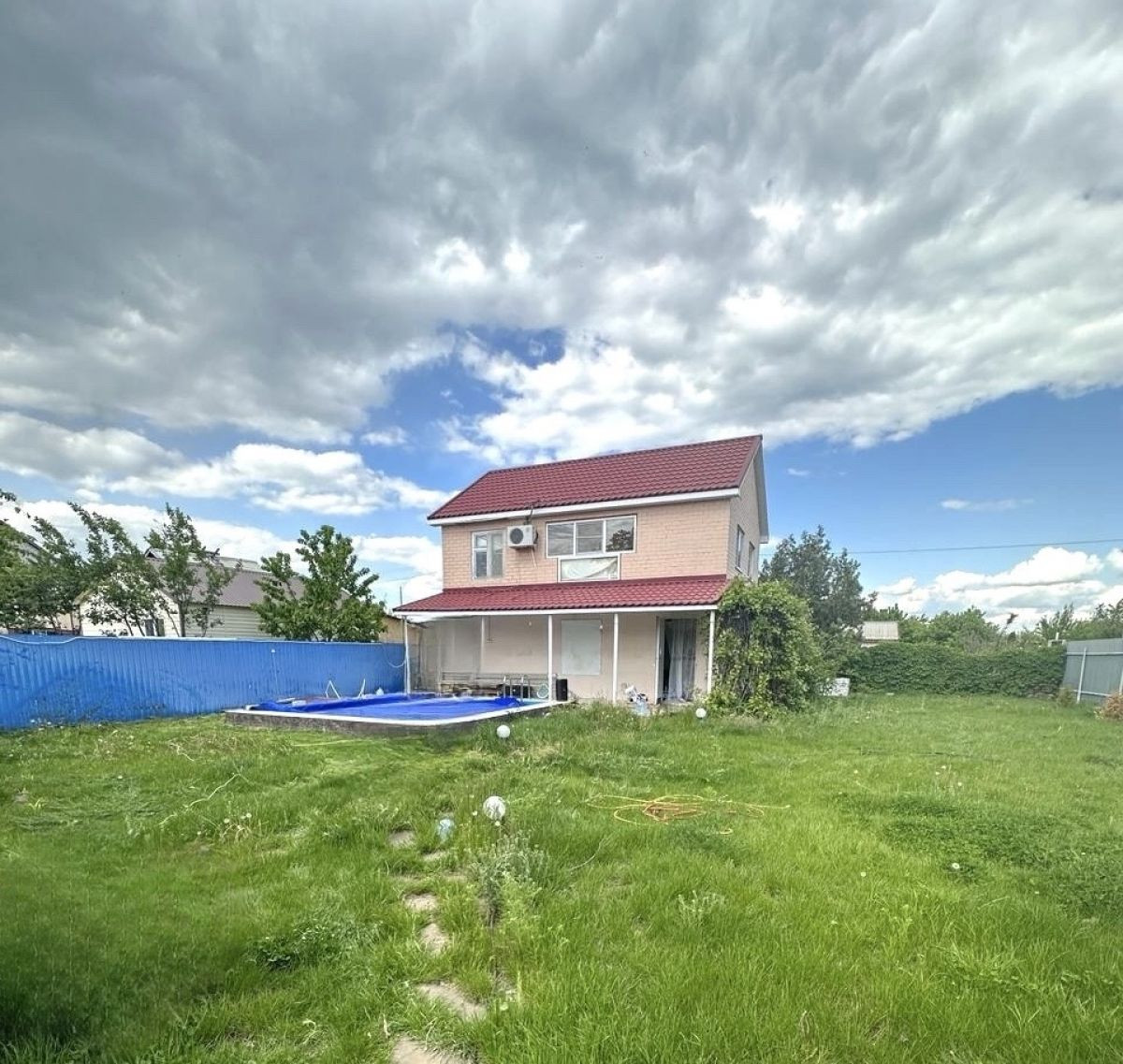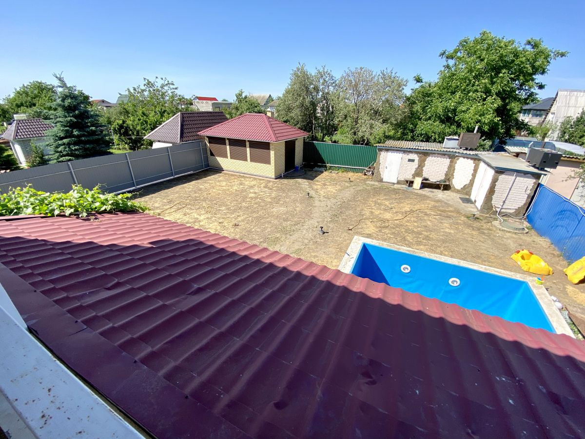 Просторный двухэтажный кирпичный дом, ухоженная территория. Ровный земельный участок размером 5,91 соток, на территории хоз. блок с баней и душевой, бассейн с подогревом, отдельная летняя кухня.