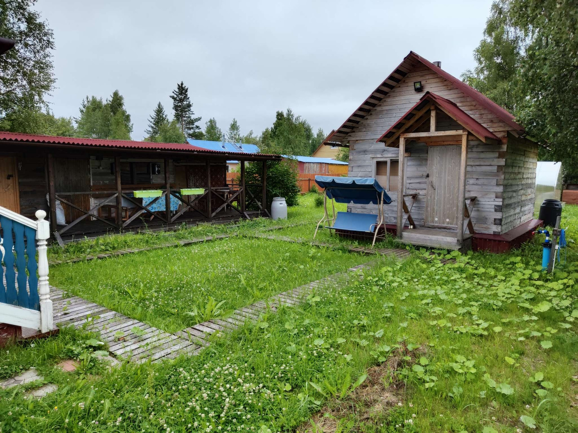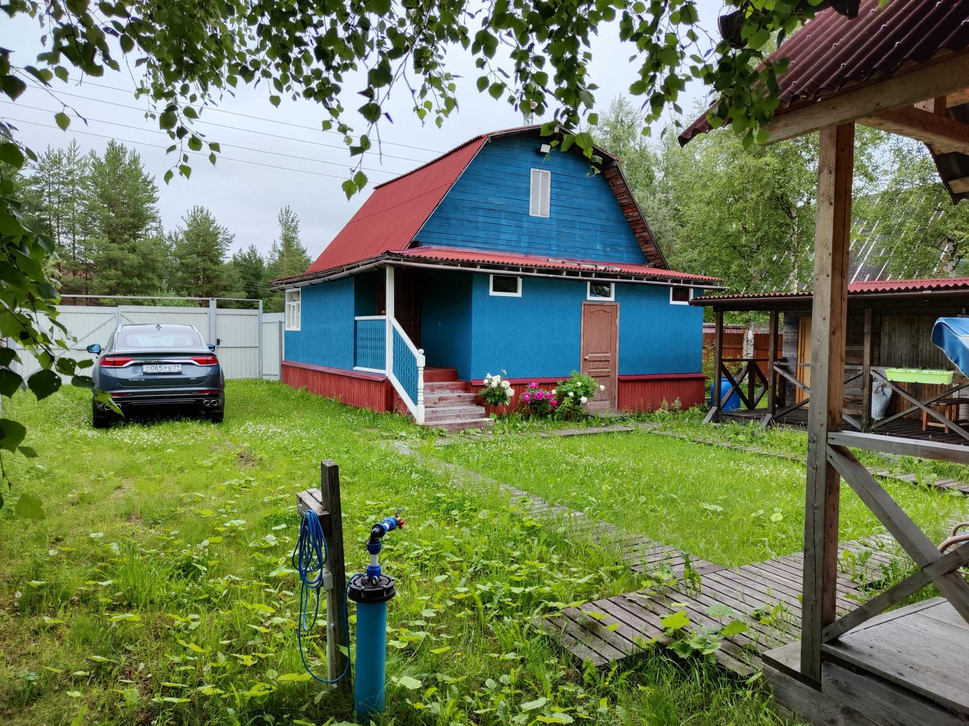 Участок в собственности, частично разработан. Три грядки, кусты черной и красной смородины, крыжовник, голубика, вишня, яблоня. Есть теплица и парник.