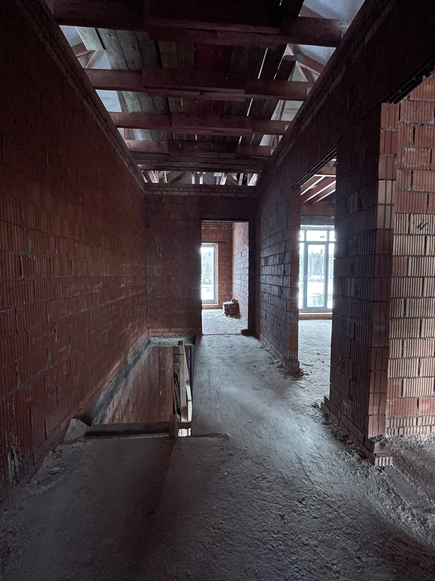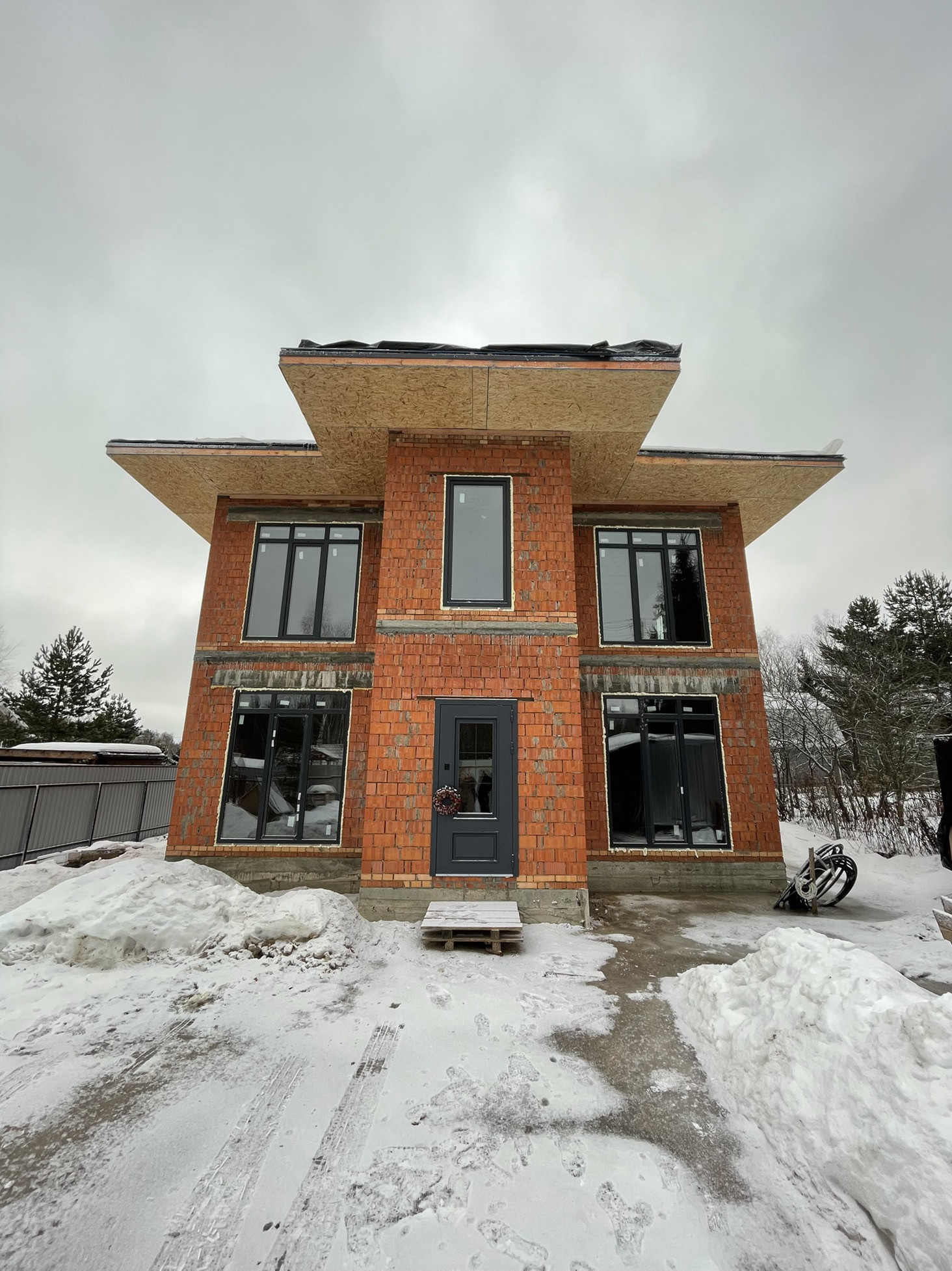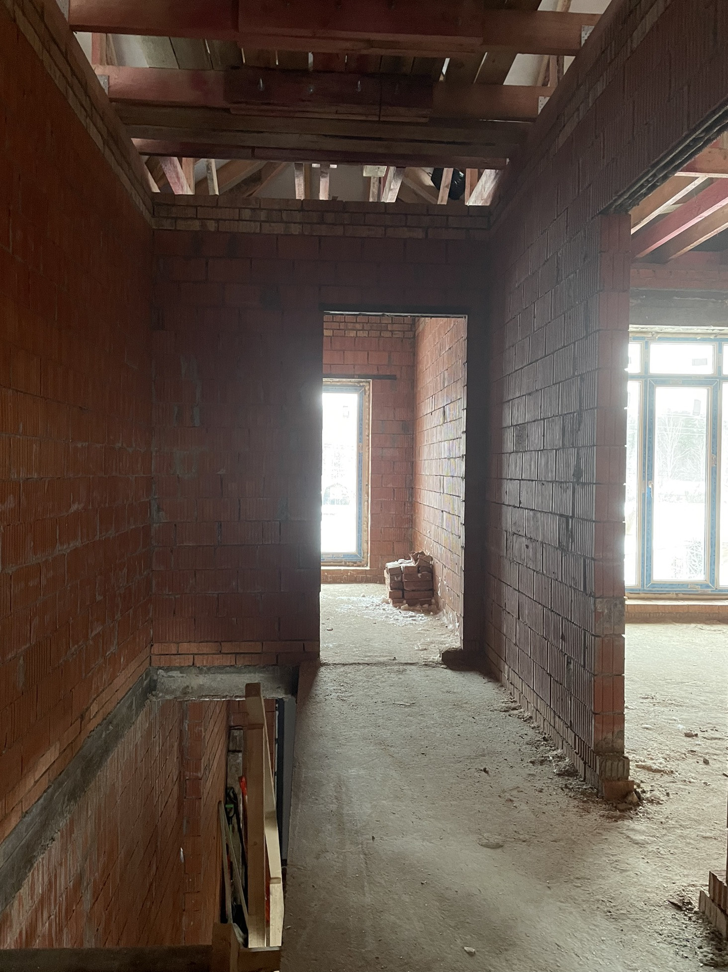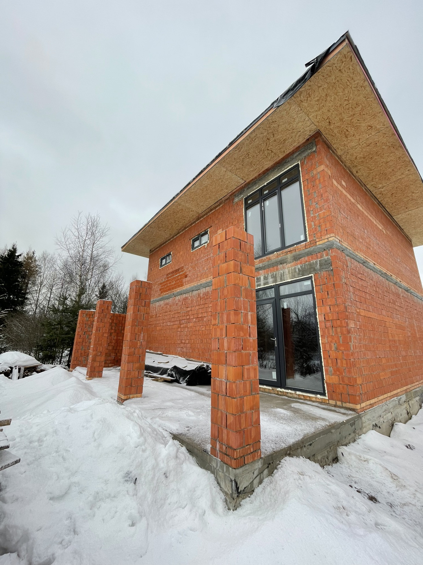 Дом стоит на тёплой плите, которая опирается на ростверк с забуренными сваями на 3 м, под плитой заведены и разведены коммуникации: вода, канализация и электричество (15 кВт) коробка сложена из керамического кирпича пустотелого ( протерм) 38 см, над окнами залиты несущие перемычки с усилением, меж этажное перекрытие - плита 22 см с усилениями и с предусмотренными тех отверстиями для коммуникаций и для дымохода будущего камина.
