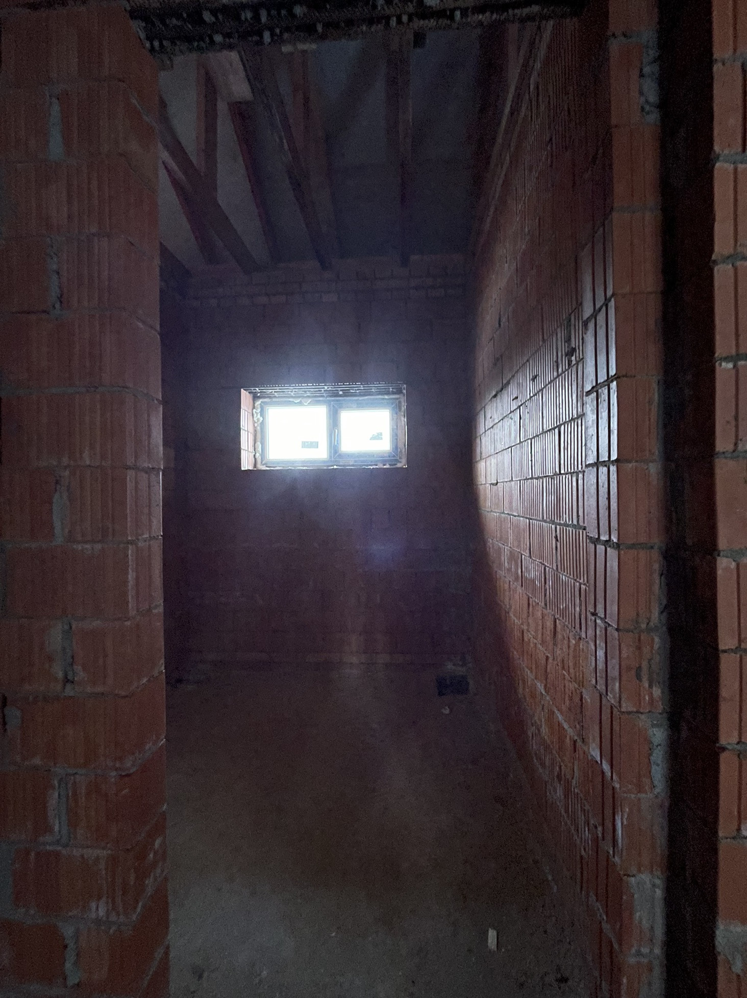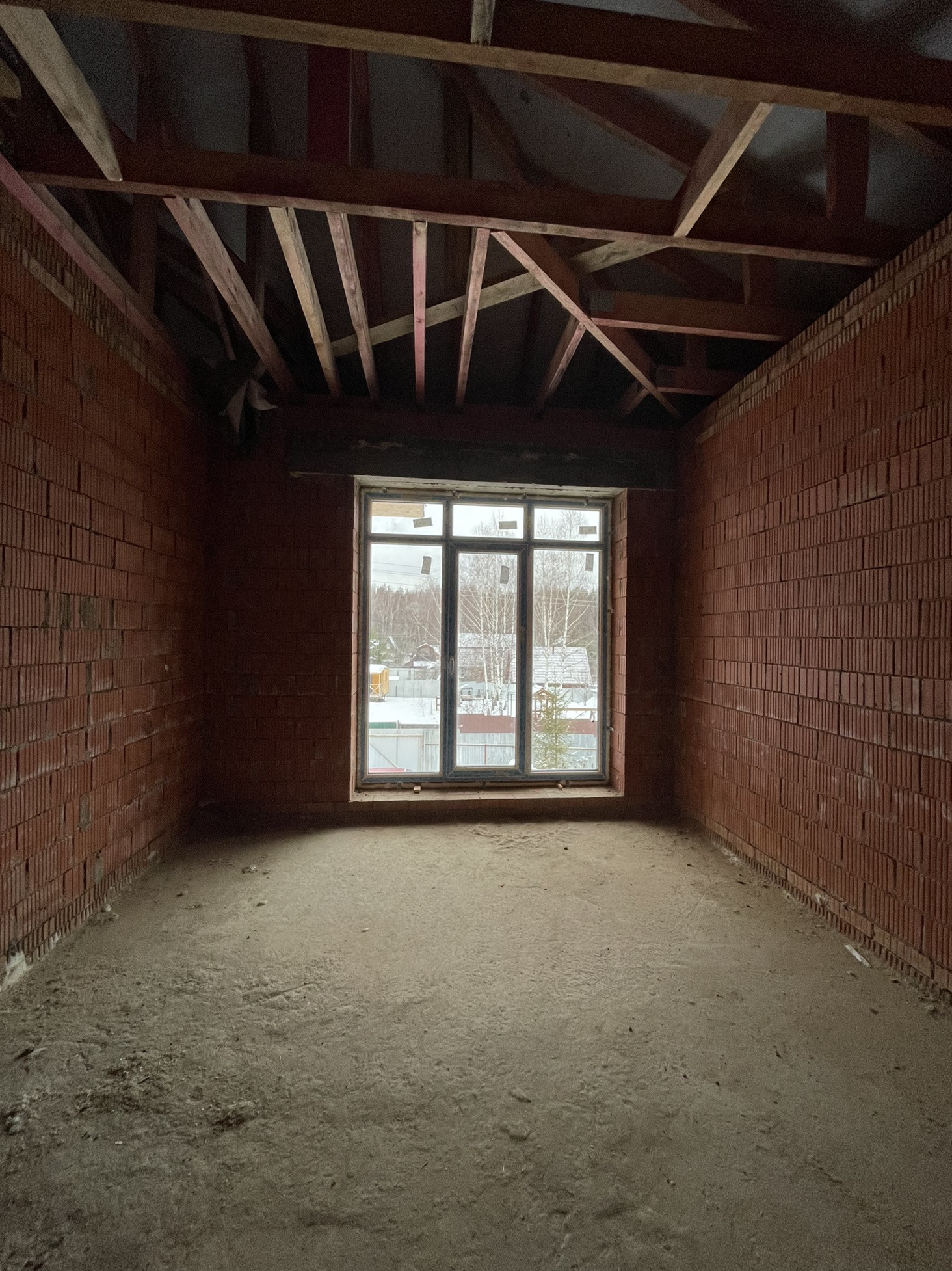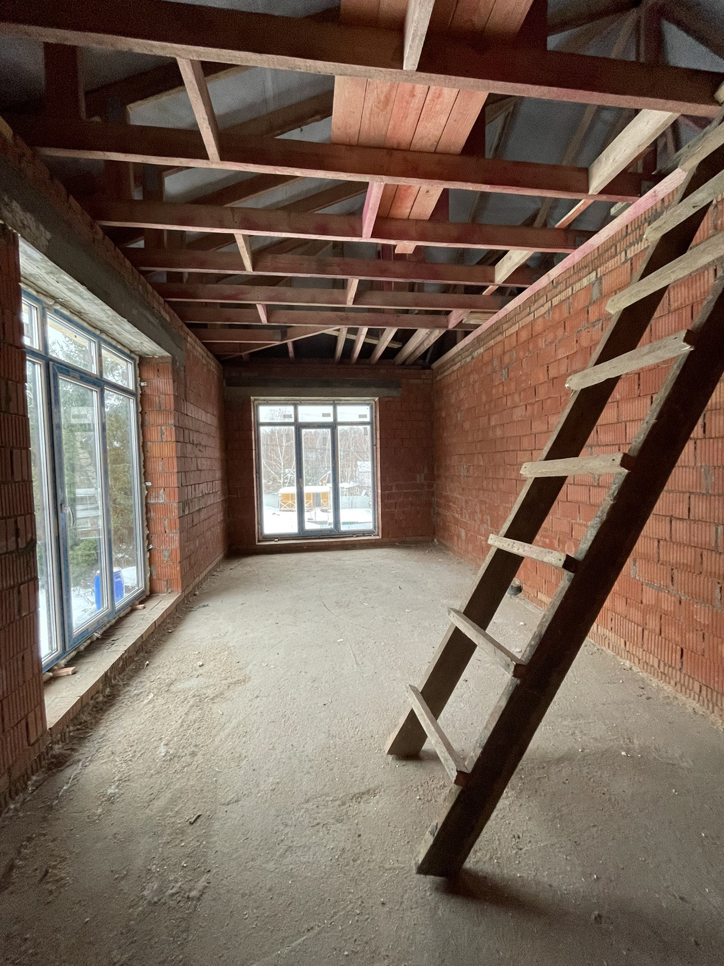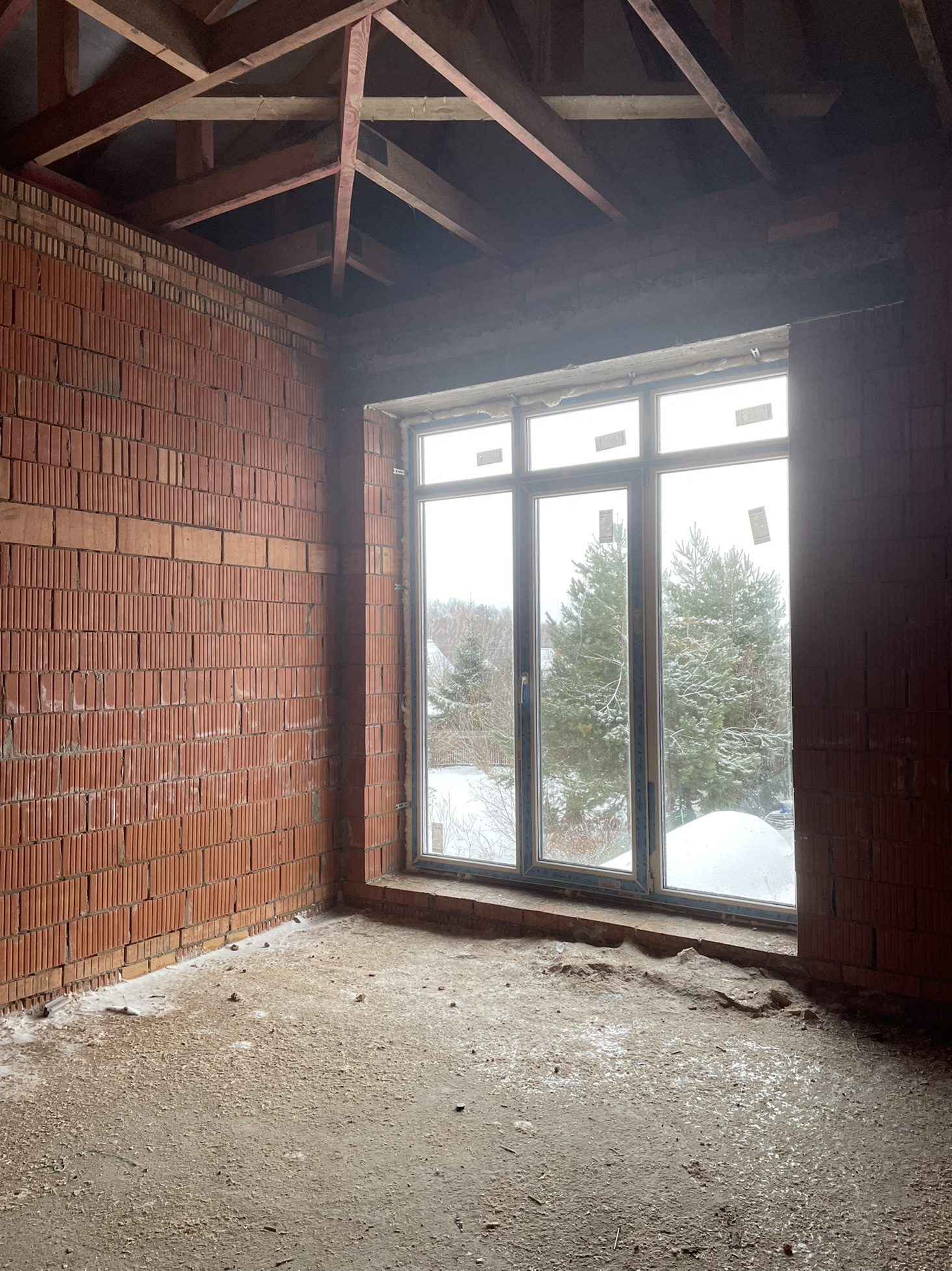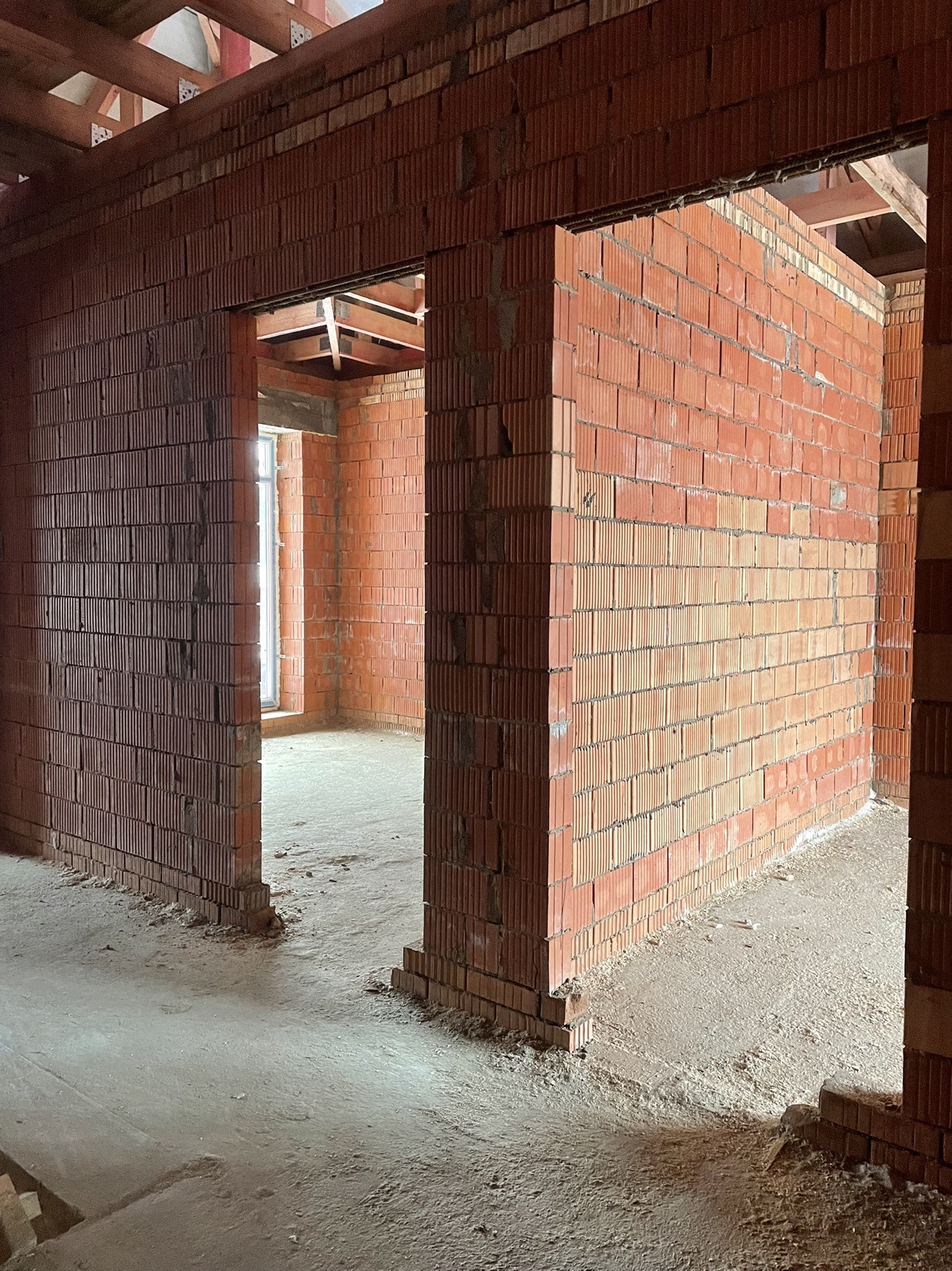 Дом стоит на тёплой плите, которая опирается на ростверк с забуренными сваями на 3 м, под плитой заведены и разведены коммуникации: вода, канализация и электричество (15 кВт) коробка сложена из керамического кирпича пустотелого ( протерм) 38 см, над окнами залиты несущие перемычки с усилением, меж этажное перекрытие - плита 22 см с усилениями и с предусмотренными тех отверстиями для коммуникаций и для дымохода будущего камина.