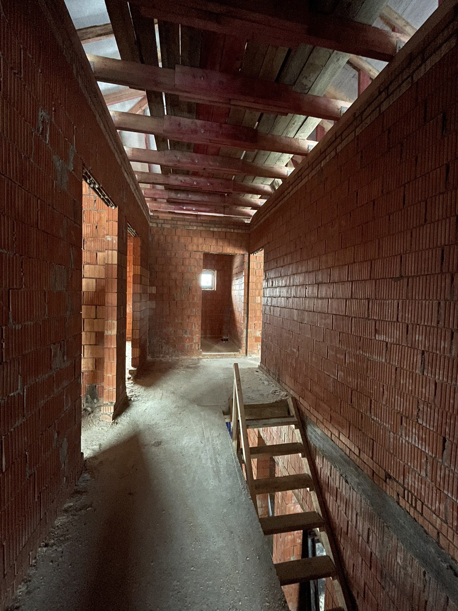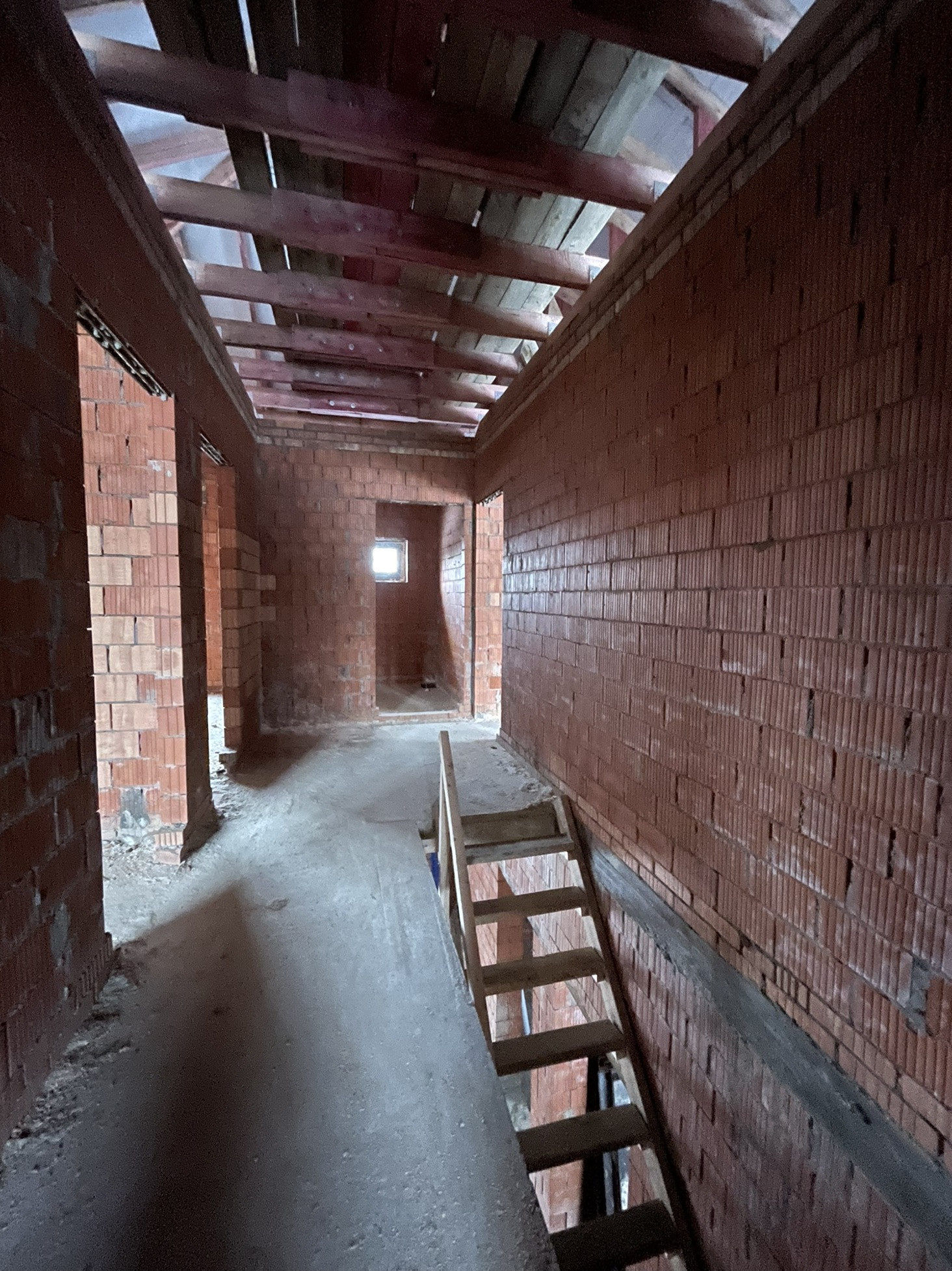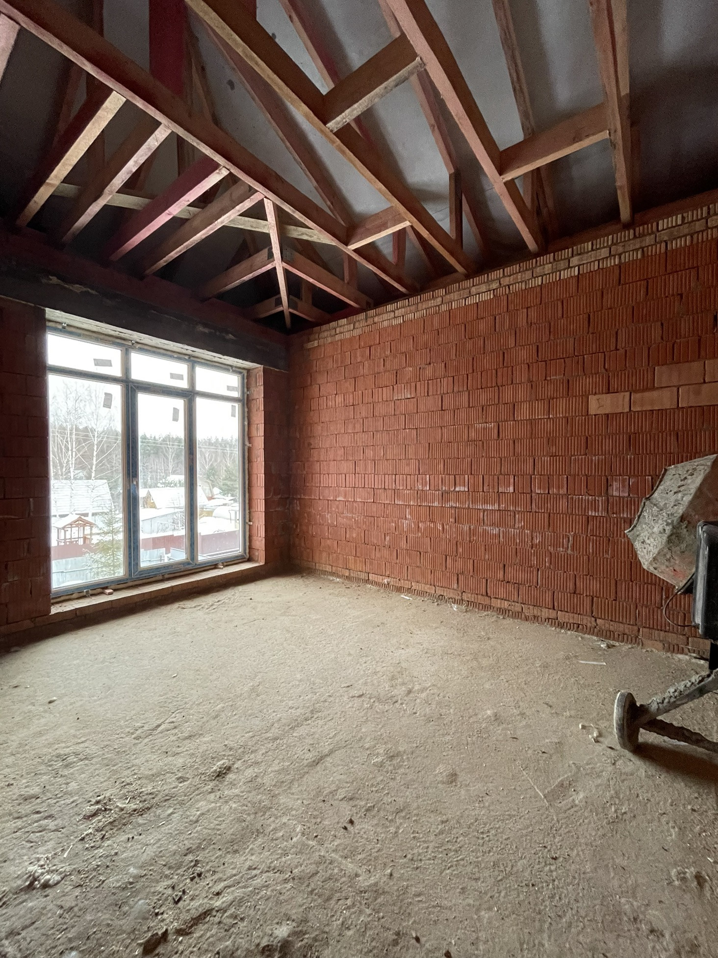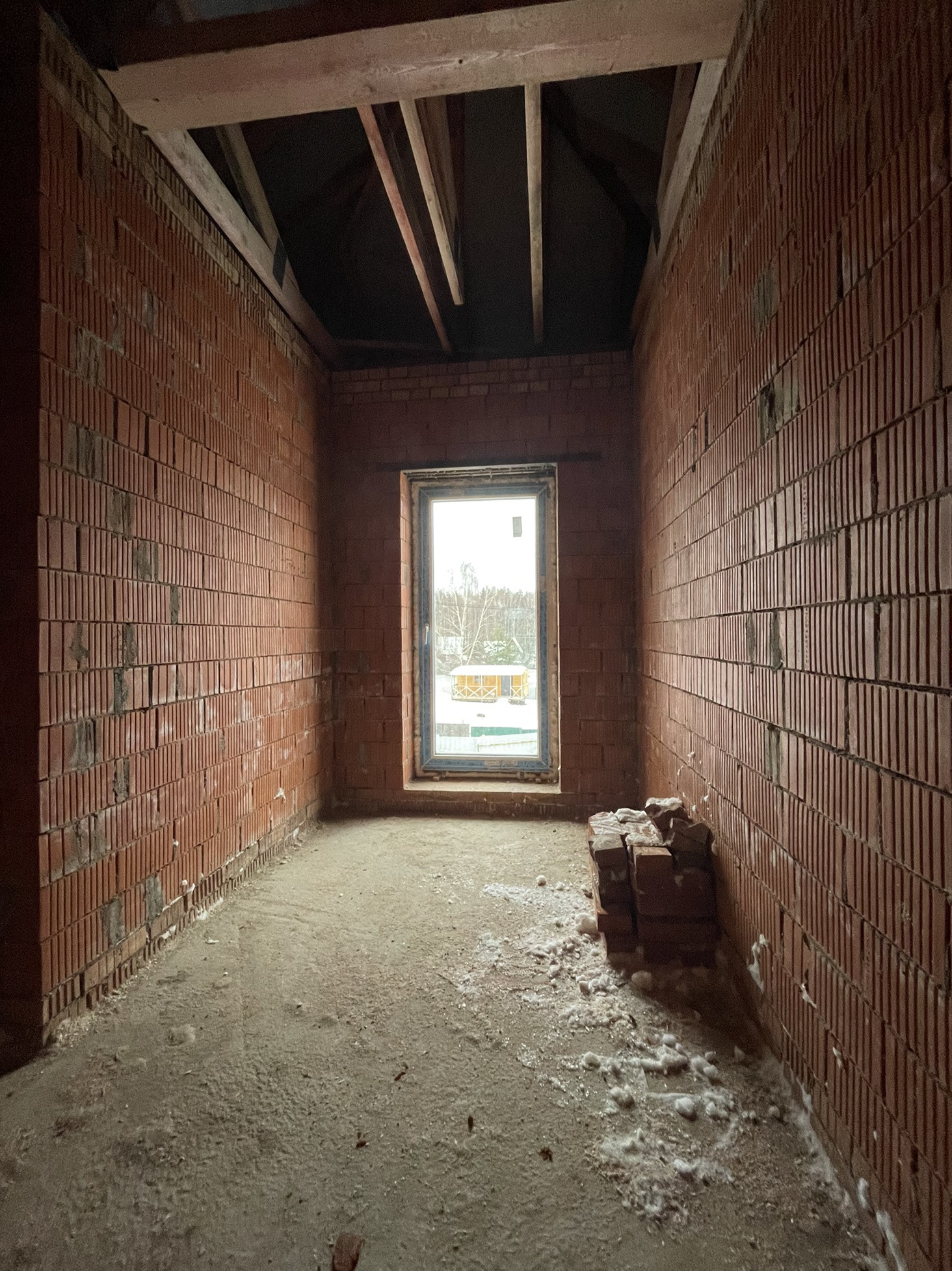 Дом стоит на тёплой плите, которая опирается на ростверк с забуренными сваями на 3 м, под плитой заведены и разведены коммуникации: вода, канализация и электричество (15 кВт) коробка сложена из керамического кирпича пустотелого ( протерм) 38 см, над окнами залиты несущие перемычки с усилением, меж этажное перекрытие - плита 22 см с усилениями и с предусмотренными тех отверстиями для коммуникаций и для дымохода будущего камина.