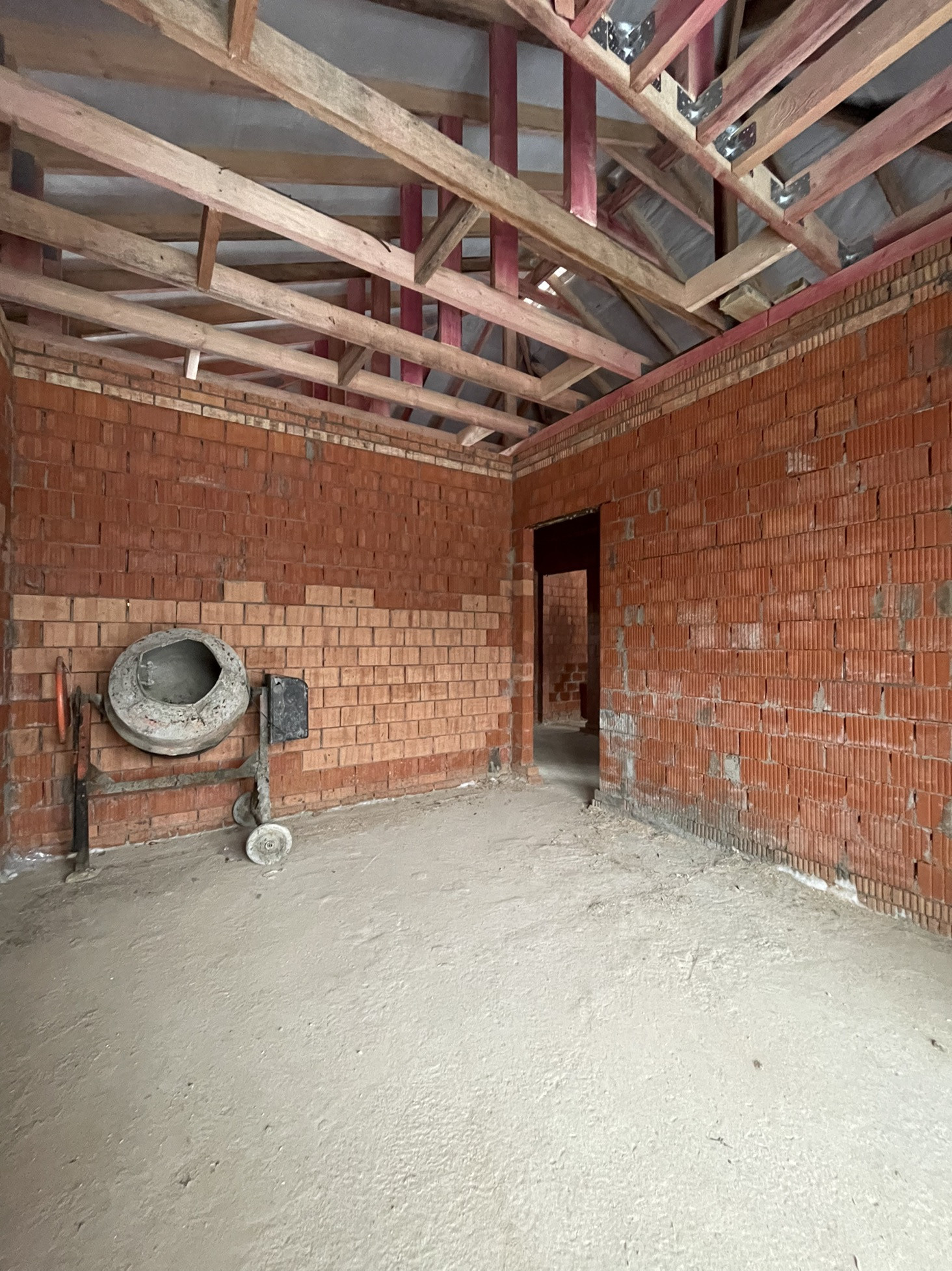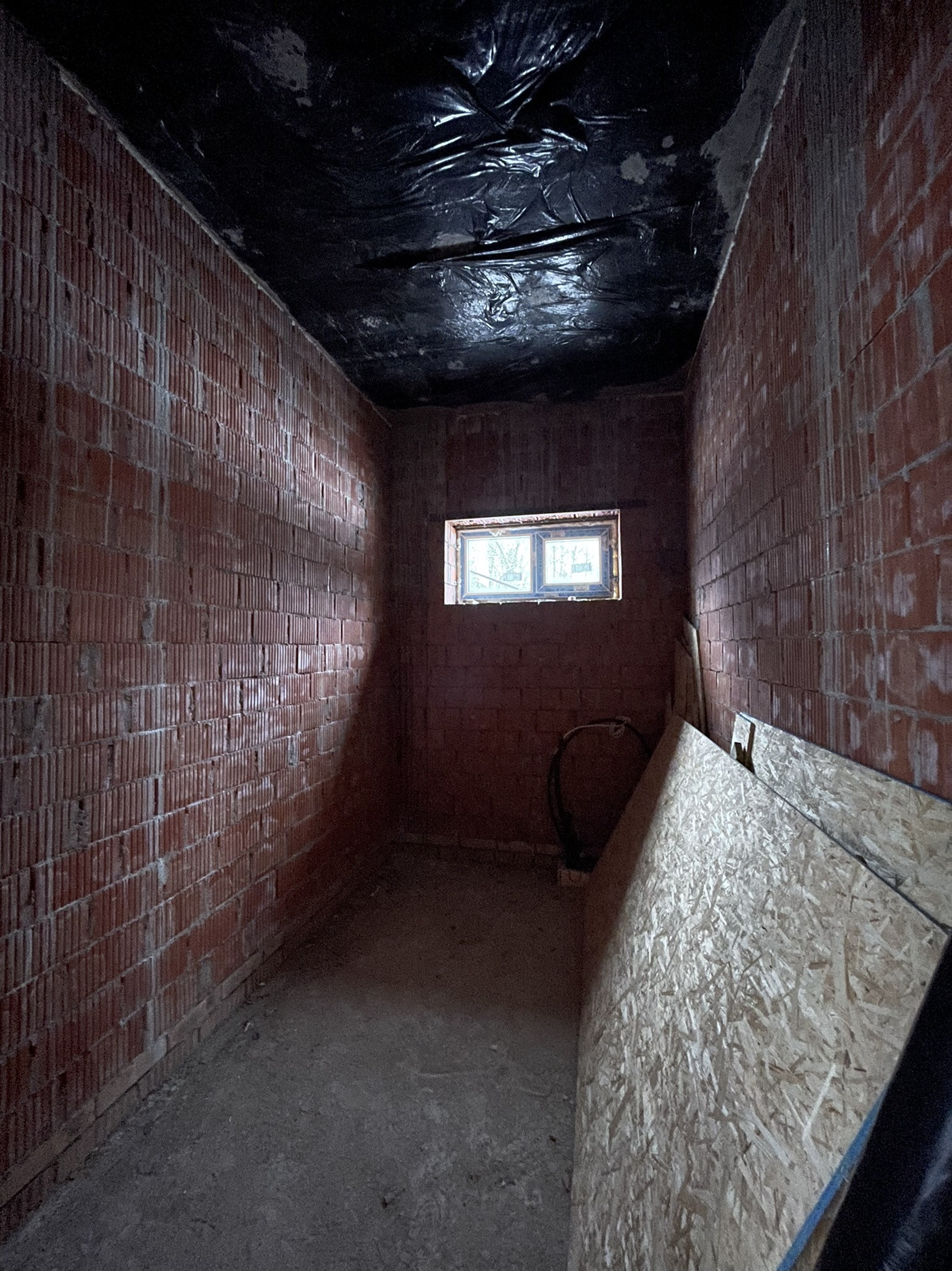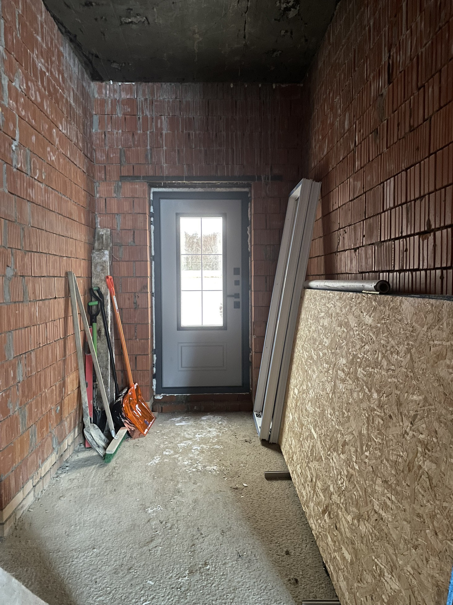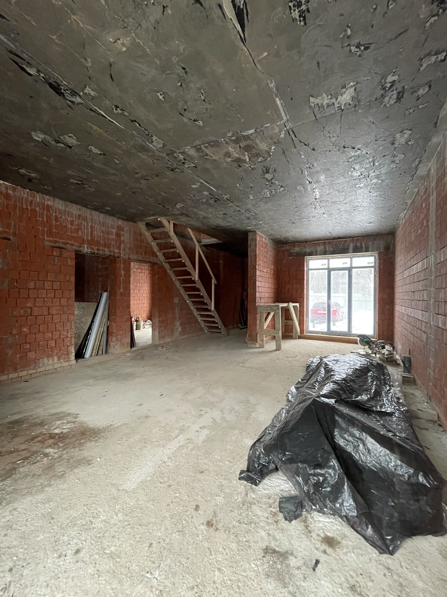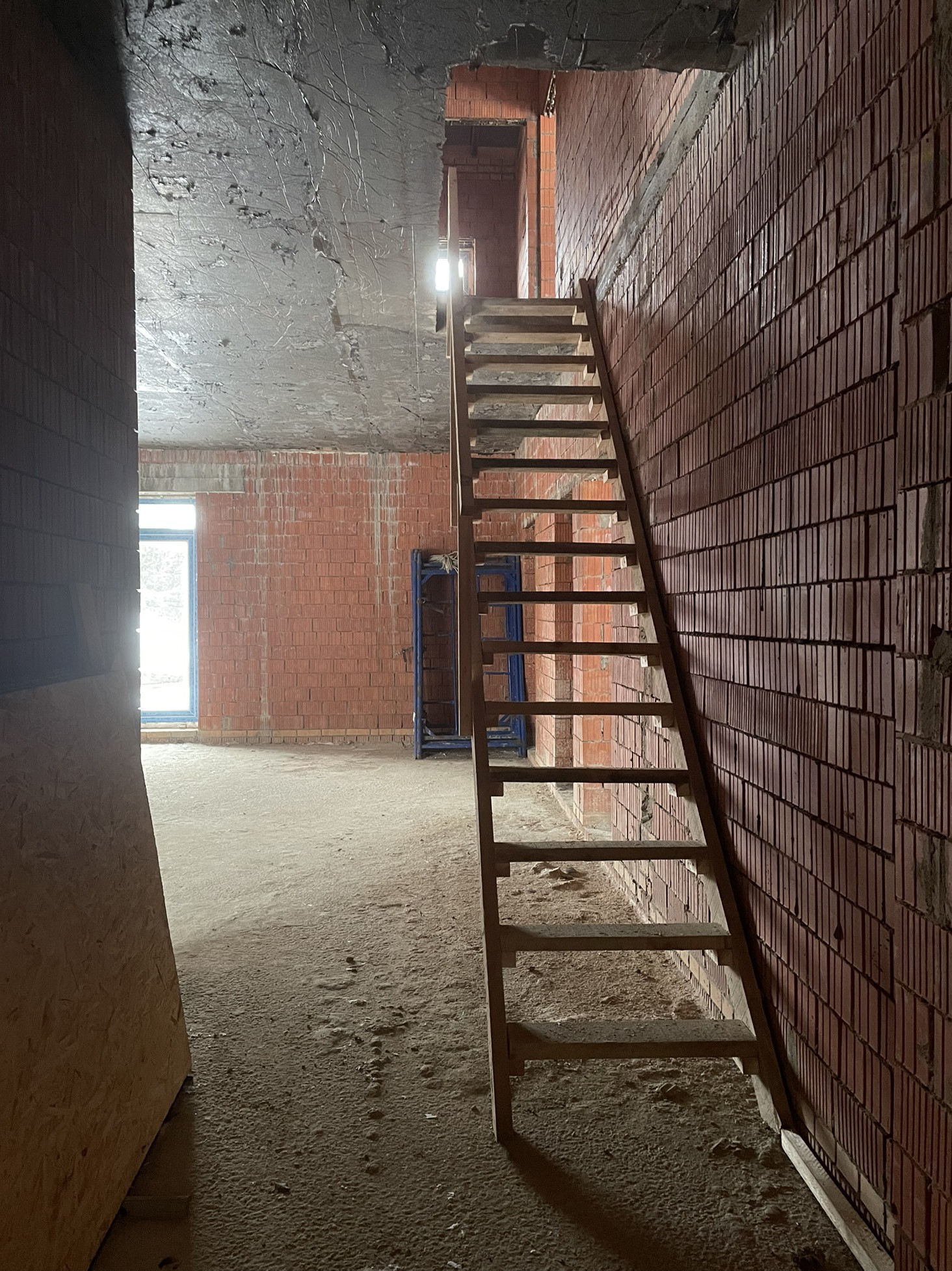 Дом стоит на тёплой плите, которая опирается на ростверк с забуренными сваями на 3 м, под плитой заведены и разведены коммуникации: вода, канализация и электричество (15 кВт) коробка сложена из керамического кирпича пустотелого ( протерм) 38 см, над окнами залиты несущие перемычки с усилением, меж этажное перекрытие - плита 22 см с усилениями и с предусмотренными тех отверстиями для коммуникаций и для дымохода будущего камина.