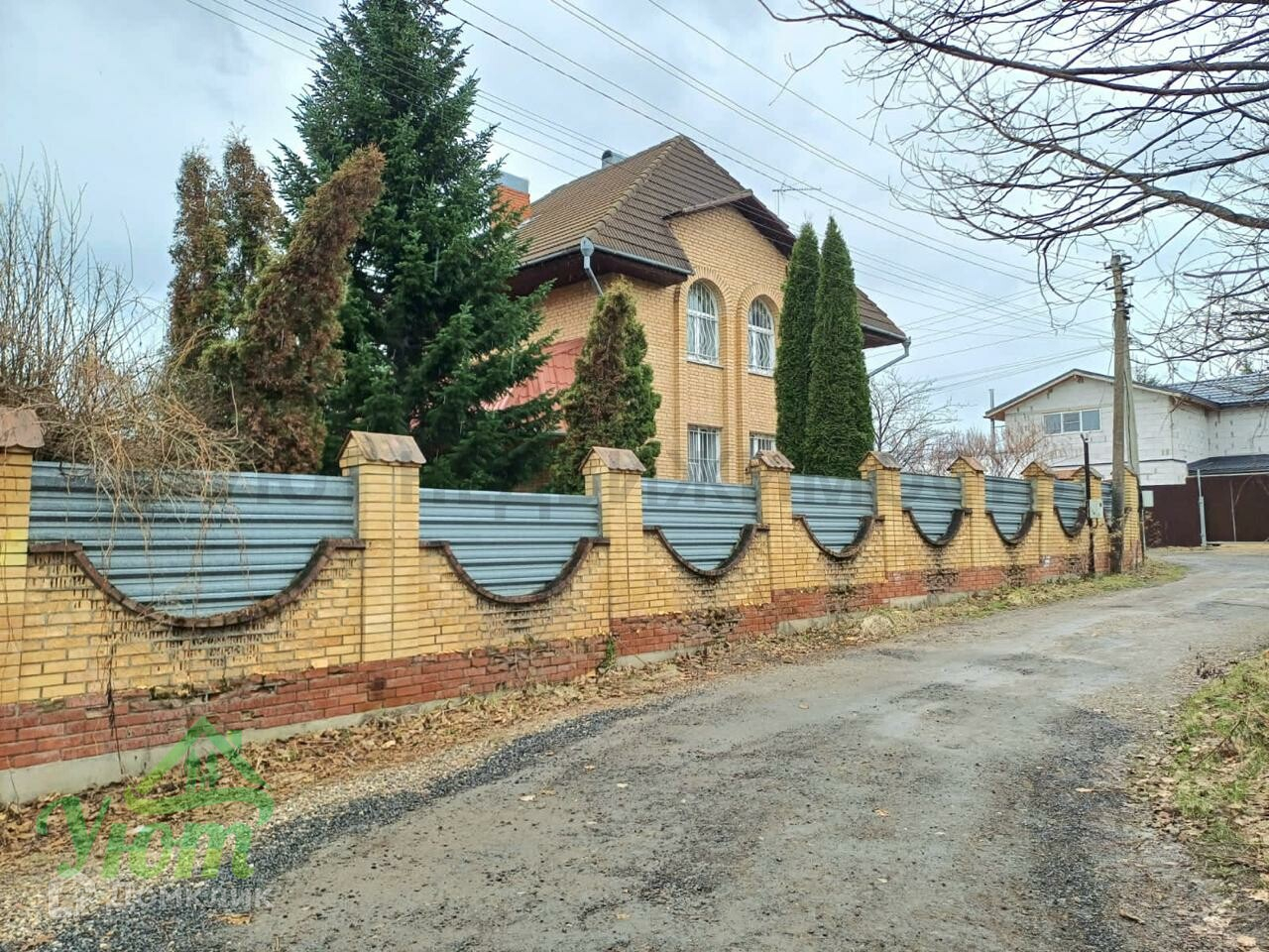 Участок общей площадью 6 соток, правильной прямоугольной формы, огорожен забором из кирпича, оборудована площадка на 2 машиноместа, имеются въездные ворота.