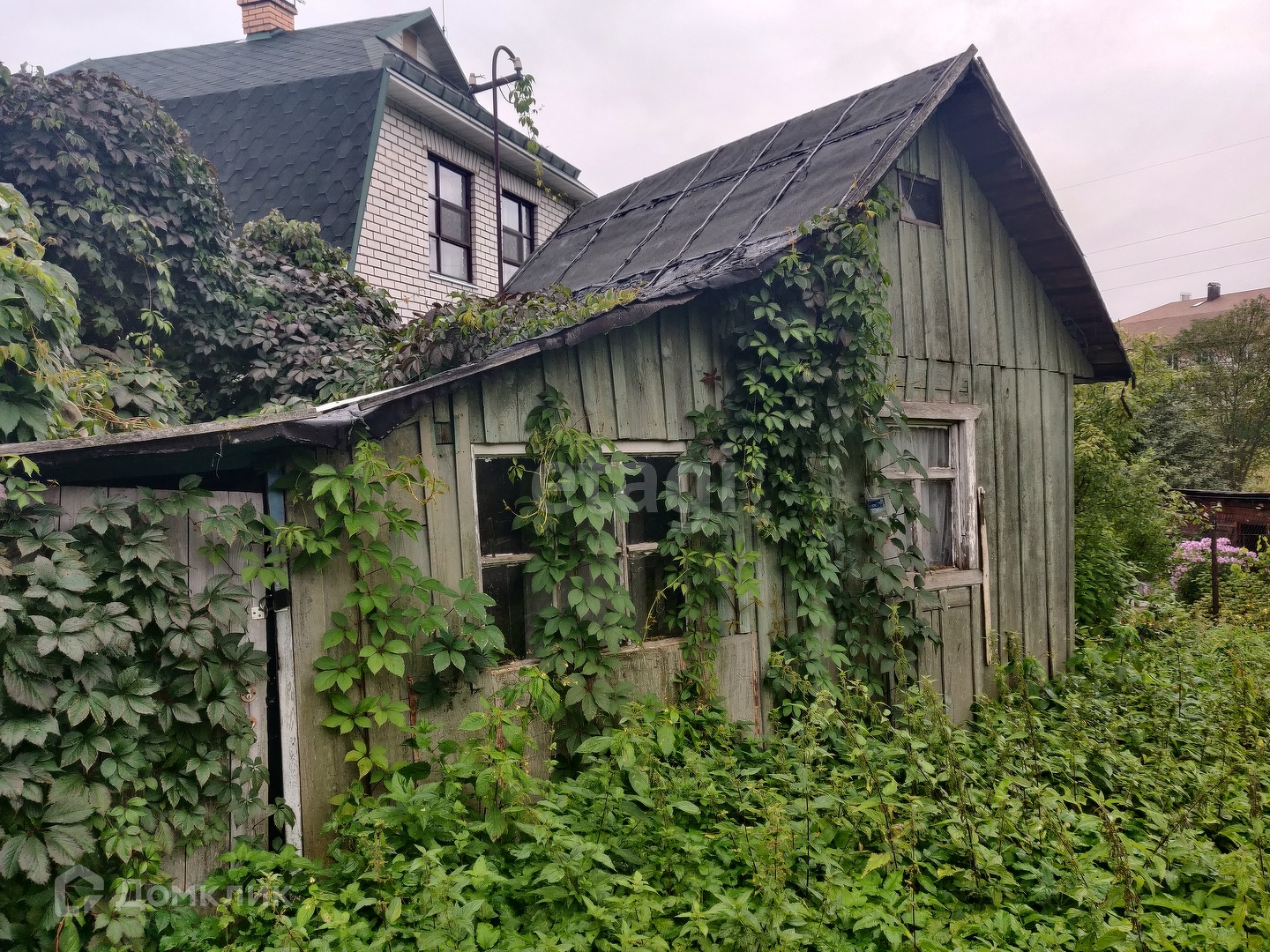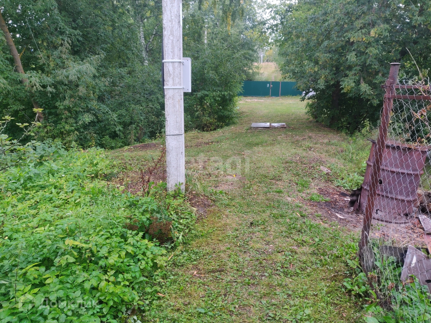 Есть старый домик под снос фактически - крыша уже течёт, всё покосилось. Можно лишь спрятаться от осадков и инструменты хранить. На участке есть вода (колодец), свет (380 кВт).