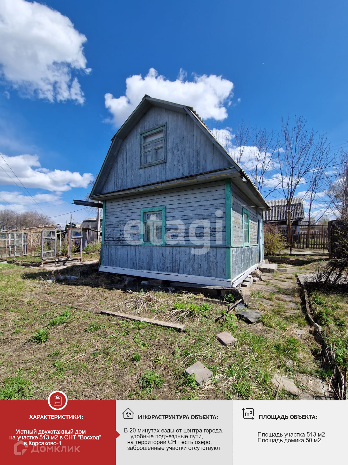 Продаю уютную дачу в СНТ ВОСХОД в районе Корсаково - 1, всего в 20 минутах езды от центра города. Это идеальное место для отдыха и уединения от городской суеты. Двухэтажный домик площадью 50 м2 станет прекрасным убежищем для вашей семьи. На втором этаже можно обустроить уютное детское пространство, а также есть 2 спальных места. В доме есть электричество, что обеспечит вам комфортное проживание. На участке выращивается жимолость, смородина, клубника и многое другое. Площадь участка 513 кв. м имеет правильную квадратную форму, что позволяет максимально рационально использовать пространство. Здесь вы сможете создать уютный сад или огород, где будете наслаждаться свежим воздухом. Не упустите возможность приобрести этот уникальный уголок природы всего в двадцати минутах от городской суеты! Номер в базе: 10927576. Район: СДТ Восход