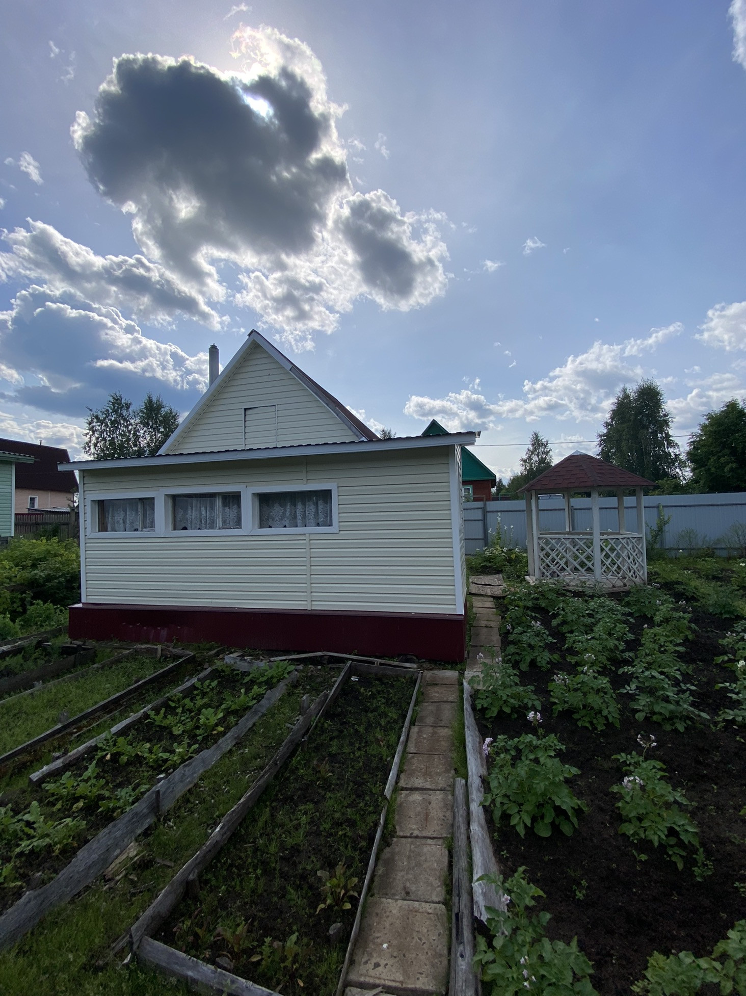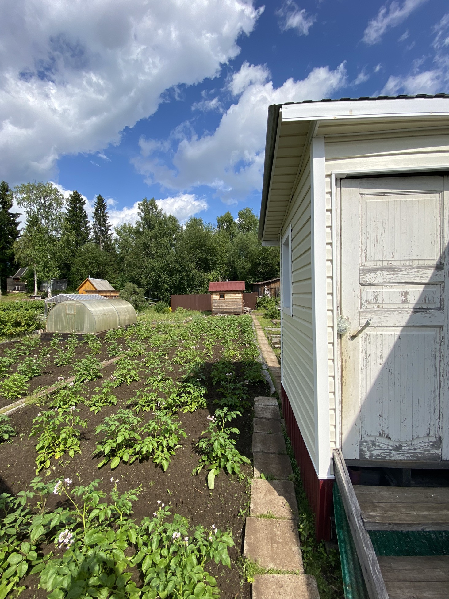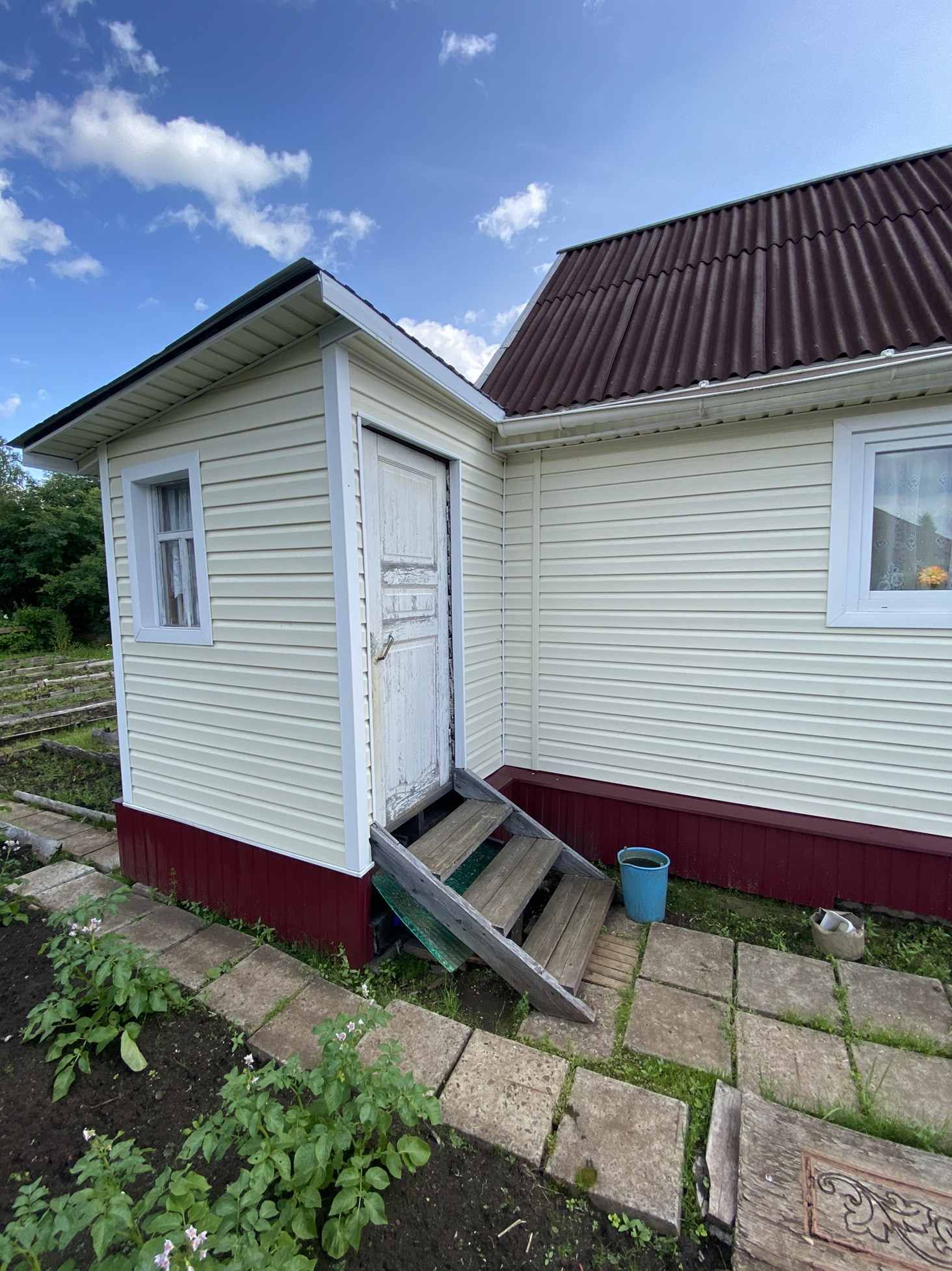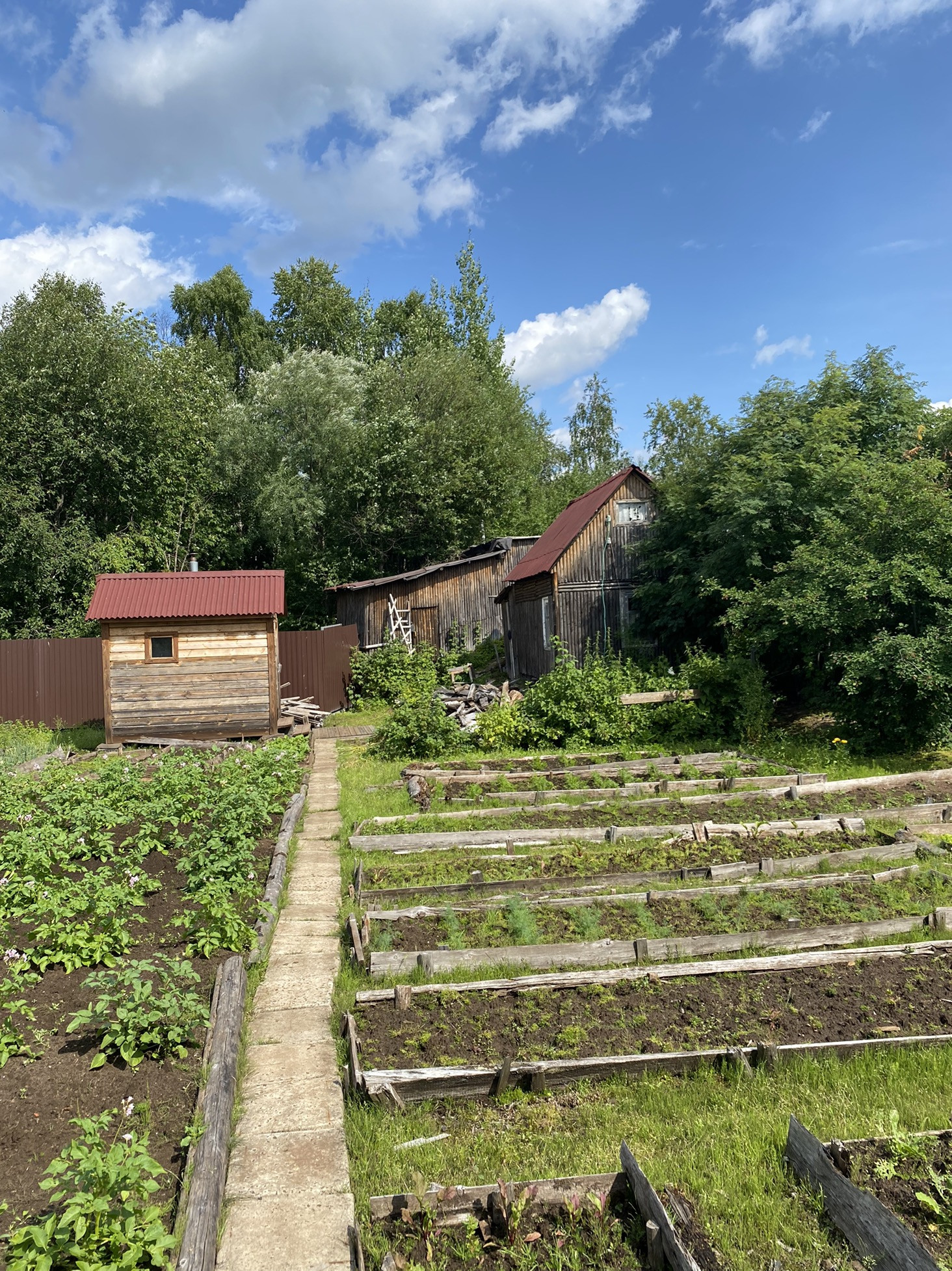 Новая летняя баня и бруса, беседка. Так же есть сарай для дров, погреб и старый дом.