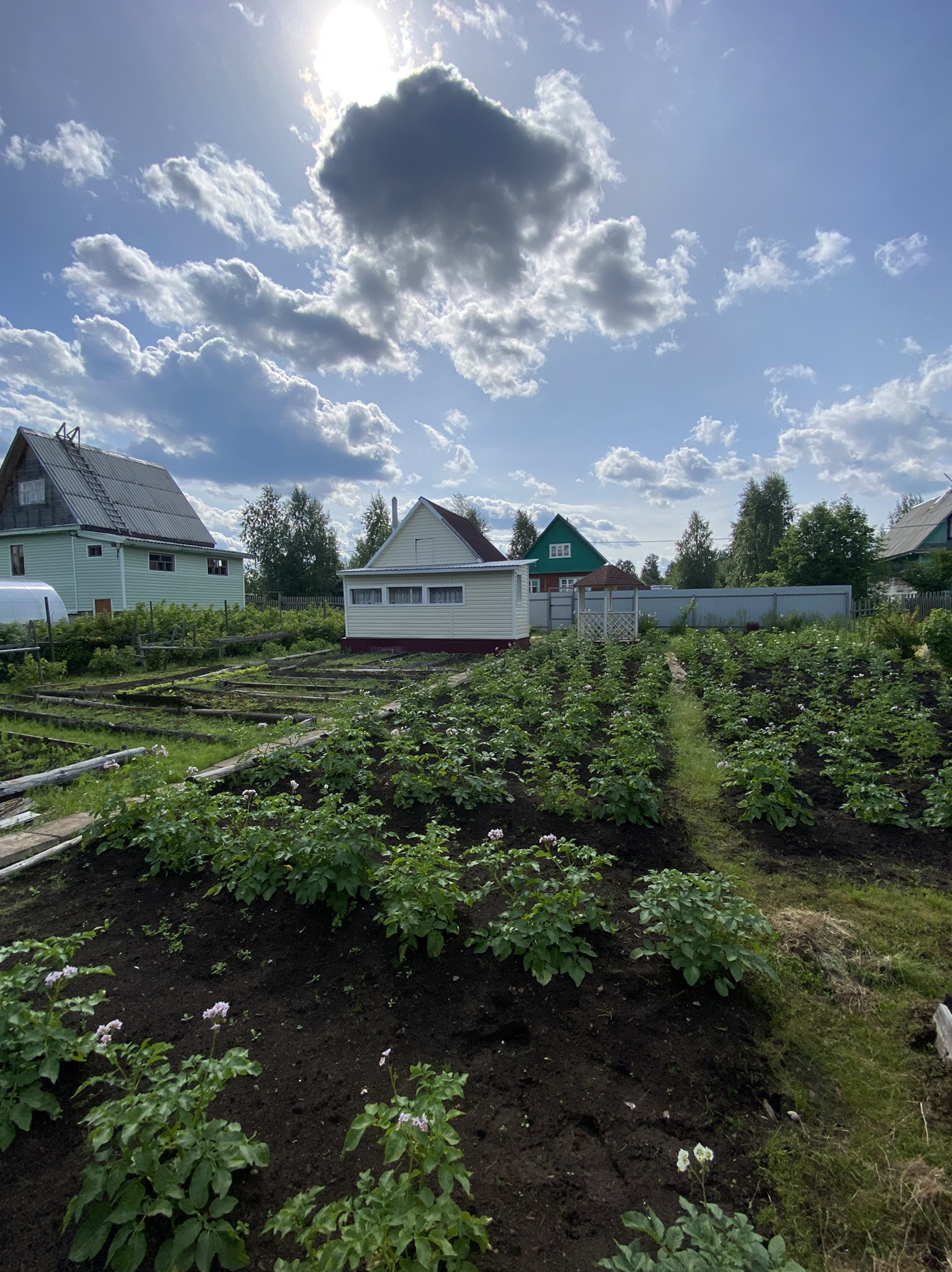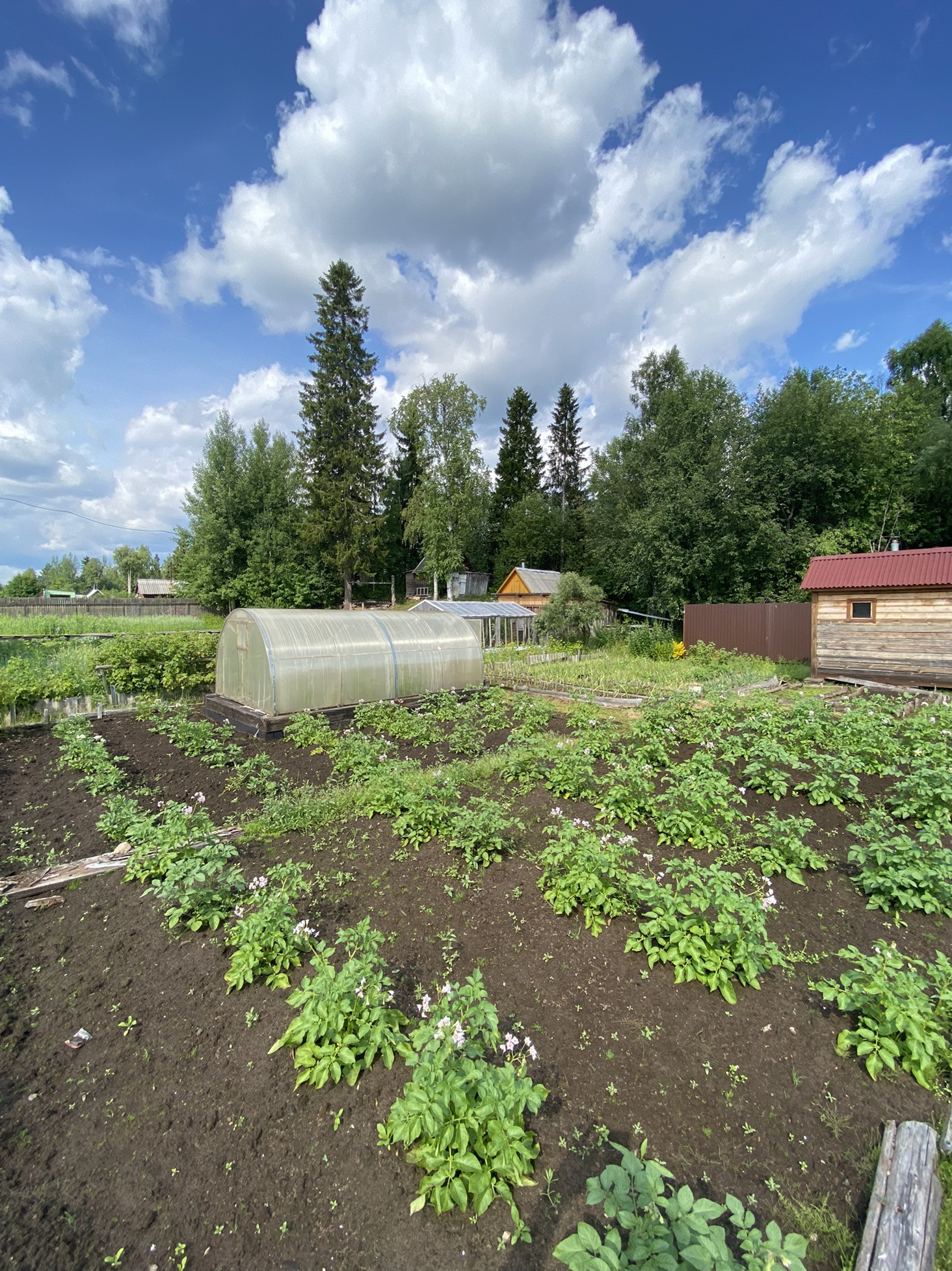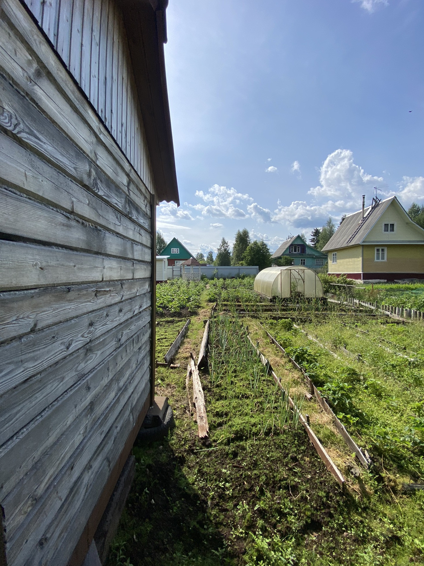 Новая летняя баня и бруса, беседка. Так же есть сарай для дров, погреб и старый дом.