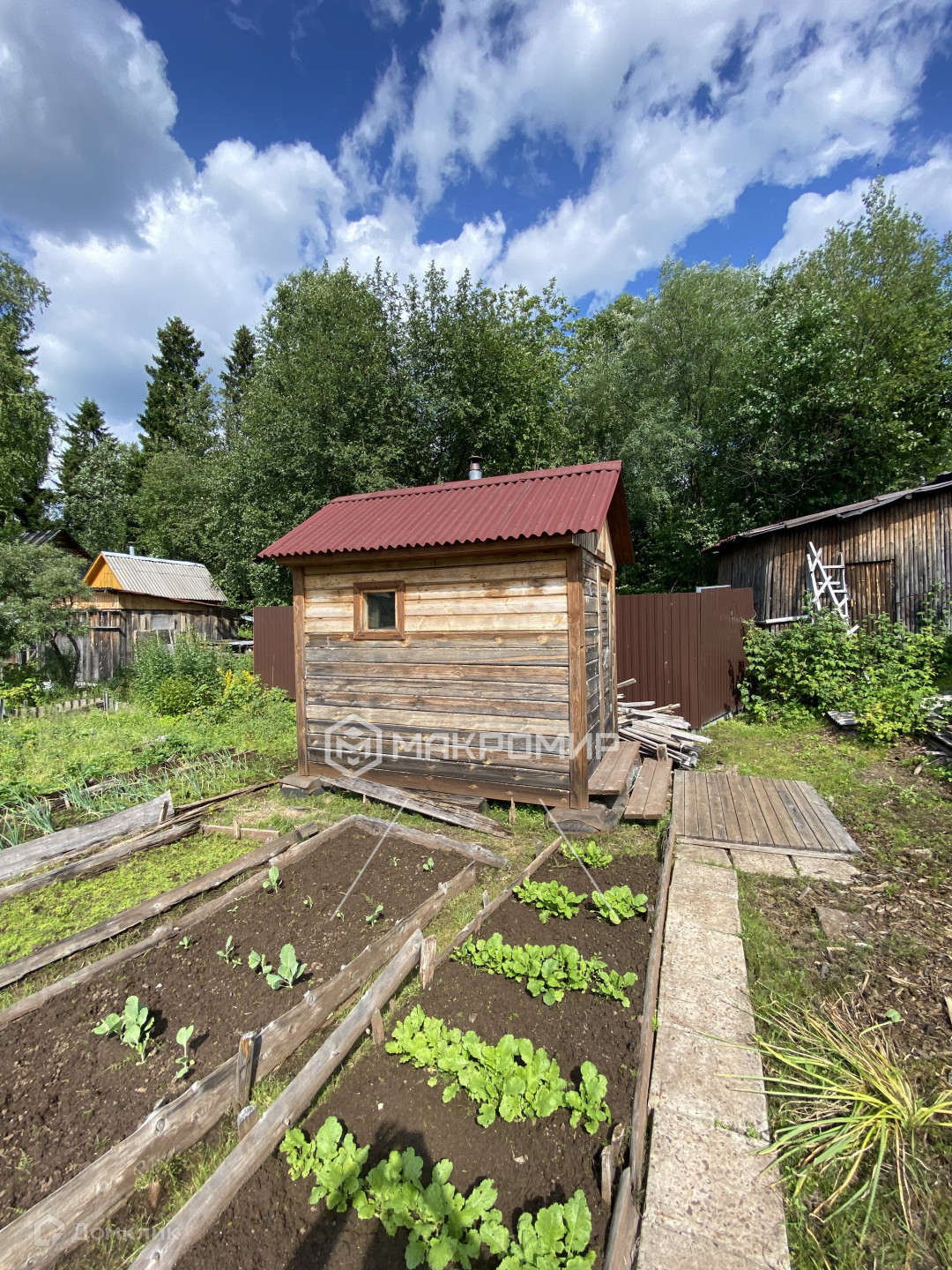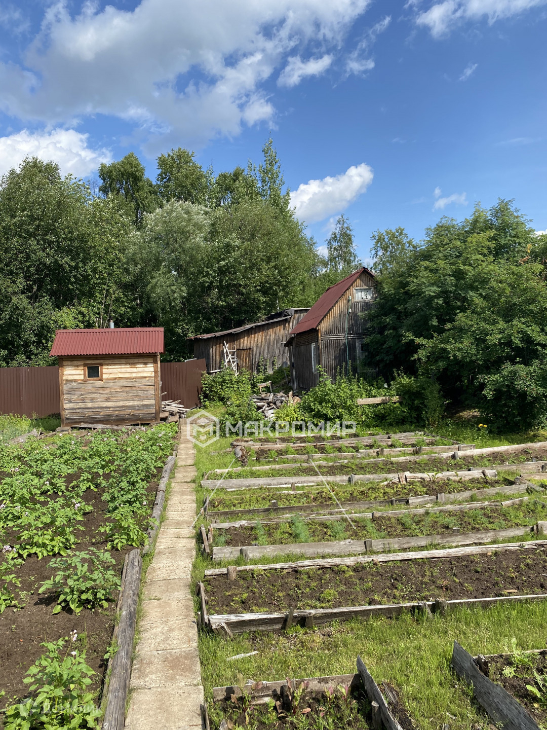 Новая летняя баня и бруса, беседка. Так же есть сарай для дров, погреб и старый дом.