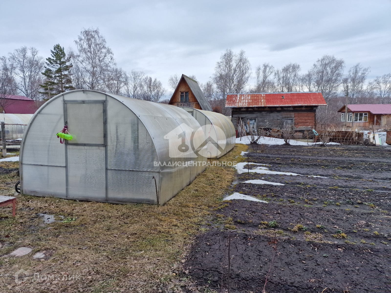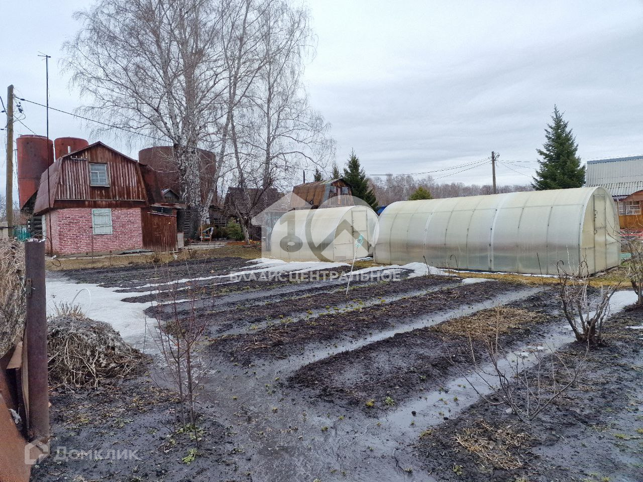 Огород с двумя теплицами. Бак для поливной воды.