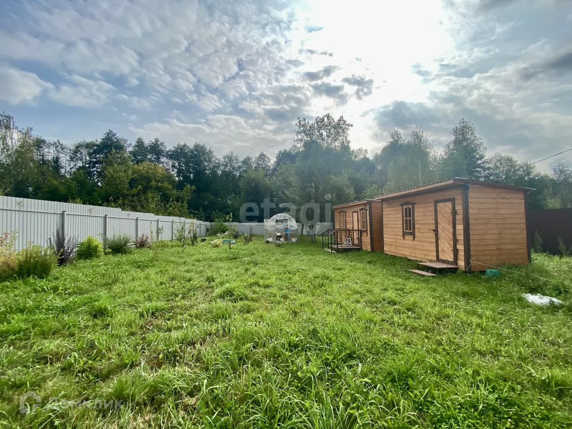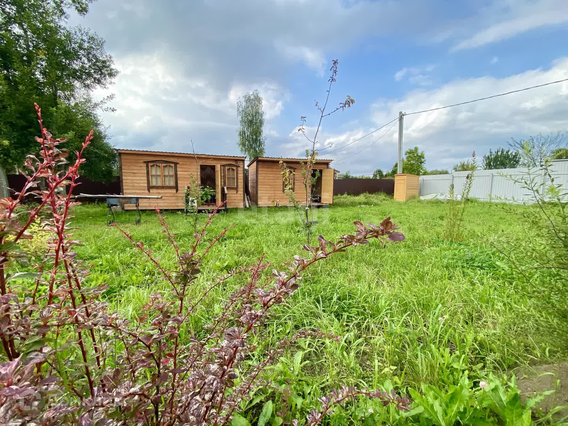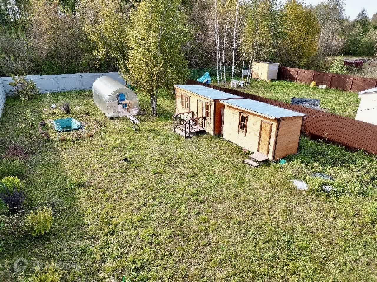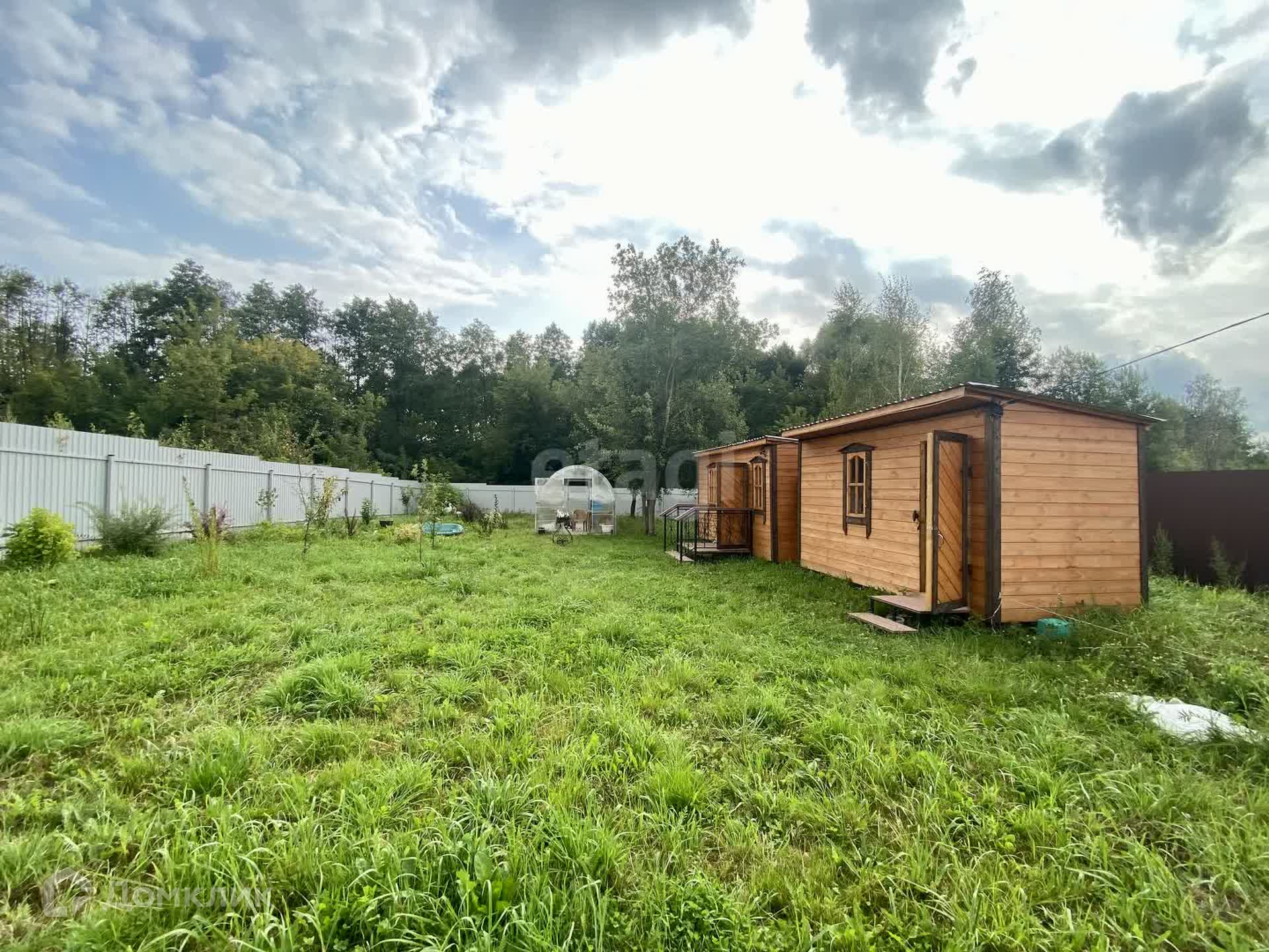 На территории находятся теплица с усиленным профилем и два уютных каркасных домика, отделанных вагонкой — идеальное место для отдыха на природе. Электричество подключено, так что вы сможете наслаждаться всеми современными удобствами.