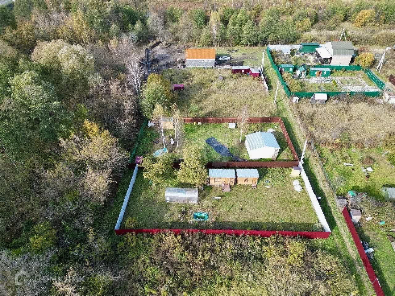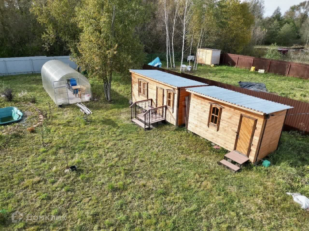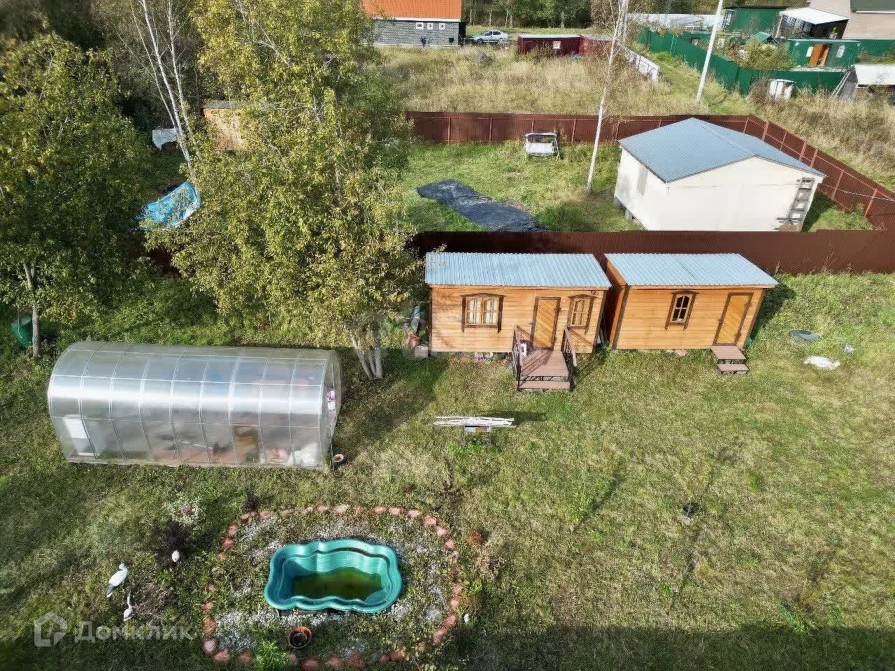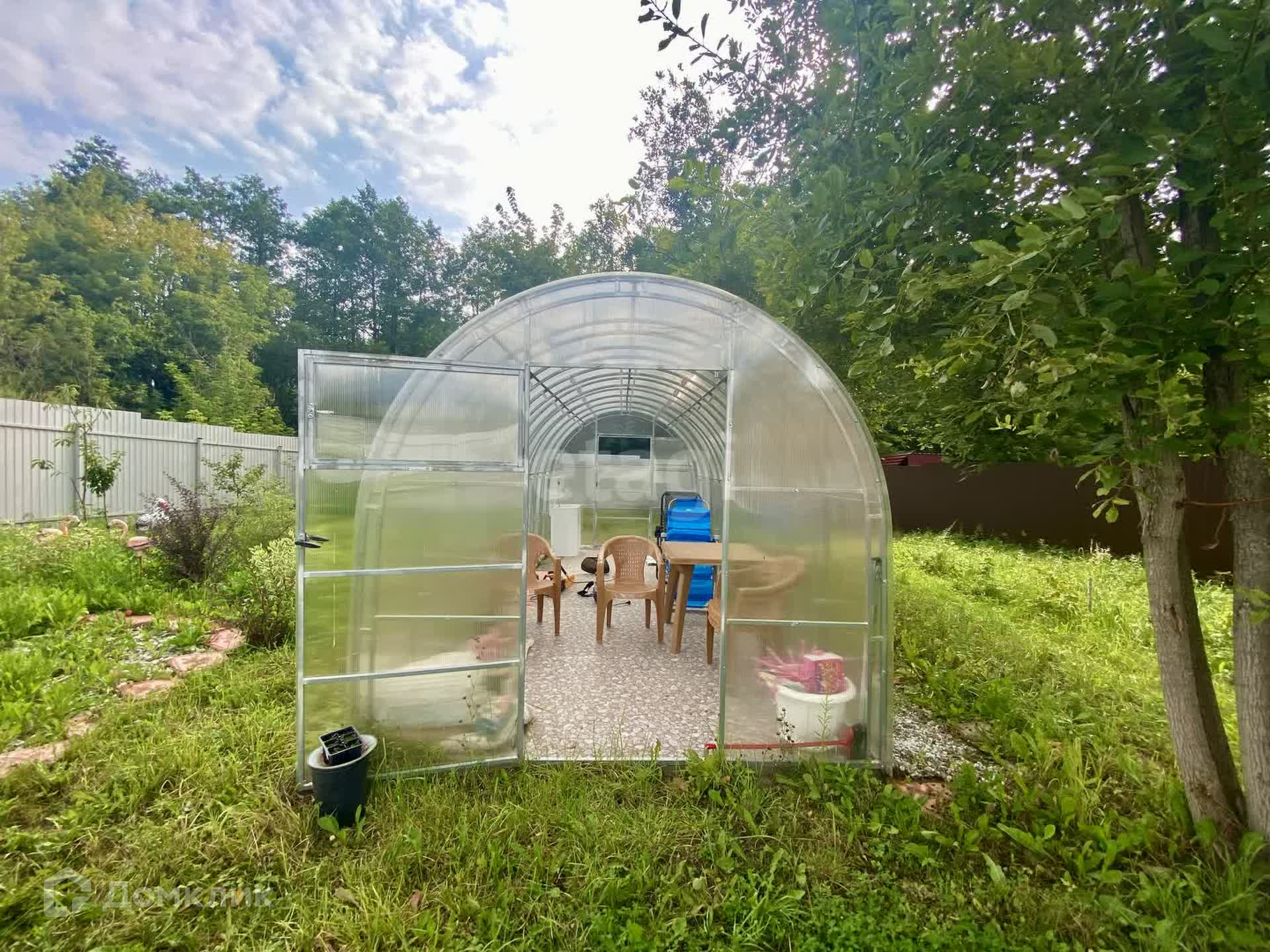 На территории находятся теплица с усиленным профилем и два уютных каркасных домика, отделанных вагонкой — идеальное место для отдыха на природе. Электричество подключено, так что вы сможете наслаждаться всеми современными удобствами.