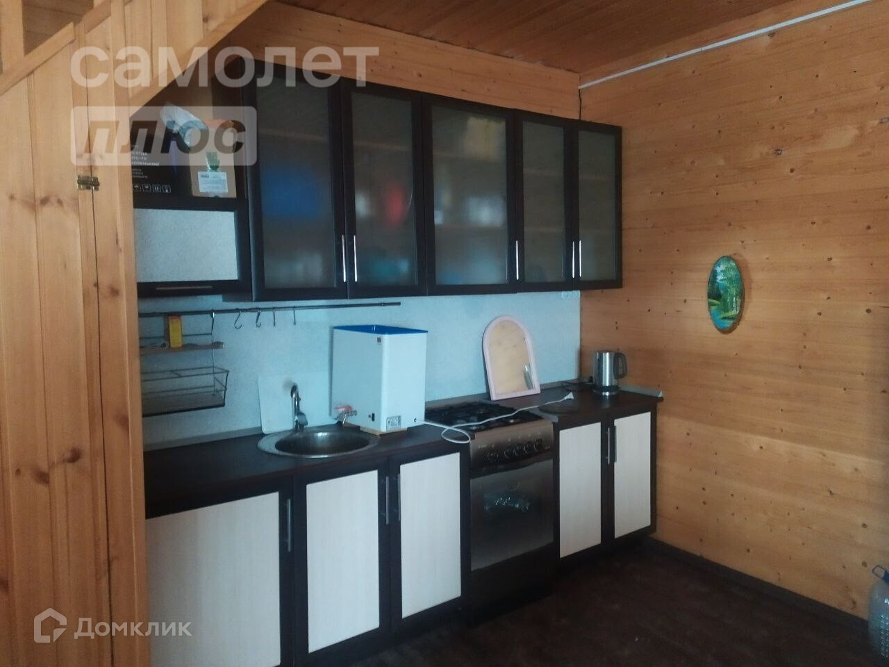 Коммуникации. Водоснабжение для кухни и бани централизованное. Для приготовления пищи установлена газовая плита, работающая от газового баллона. Встроенный кухонный гарнитур.