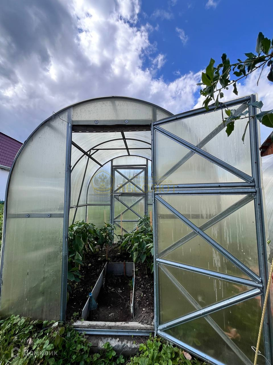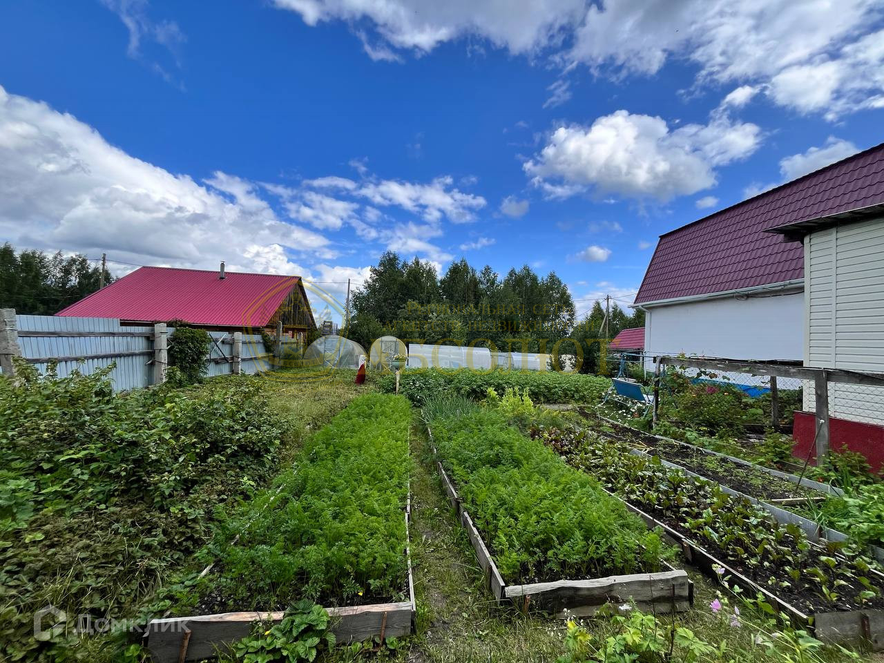 На участке 12 соток находятся 2 дома, гараж, баня, 2 бассейна, 3 теплицы, хоз. постройка для разведения кур, скважина 56 метров, множество плодово-ягодных насаждений: вишня, смородина, малина, виноград, ирга, слива, черноплодная рябина, участок ухожен, огорожен со всех сторон забором из проф настила.