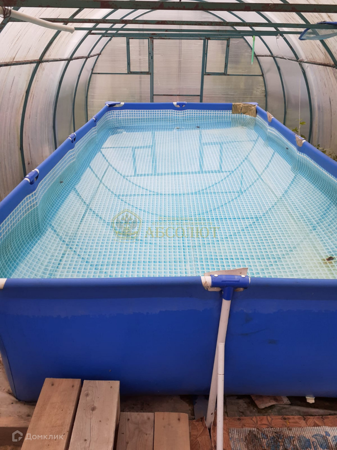 На участке просторная баня из бревна с предбанником, накопительным баком на 1 куб., рядом с которой располагаются 2 бассейна: первый бетонированный на открытом воздухе, глубина- 1,67 метров, второй бассейн каркасный в теплице, быстро нагревается на солнце и держит тепло.