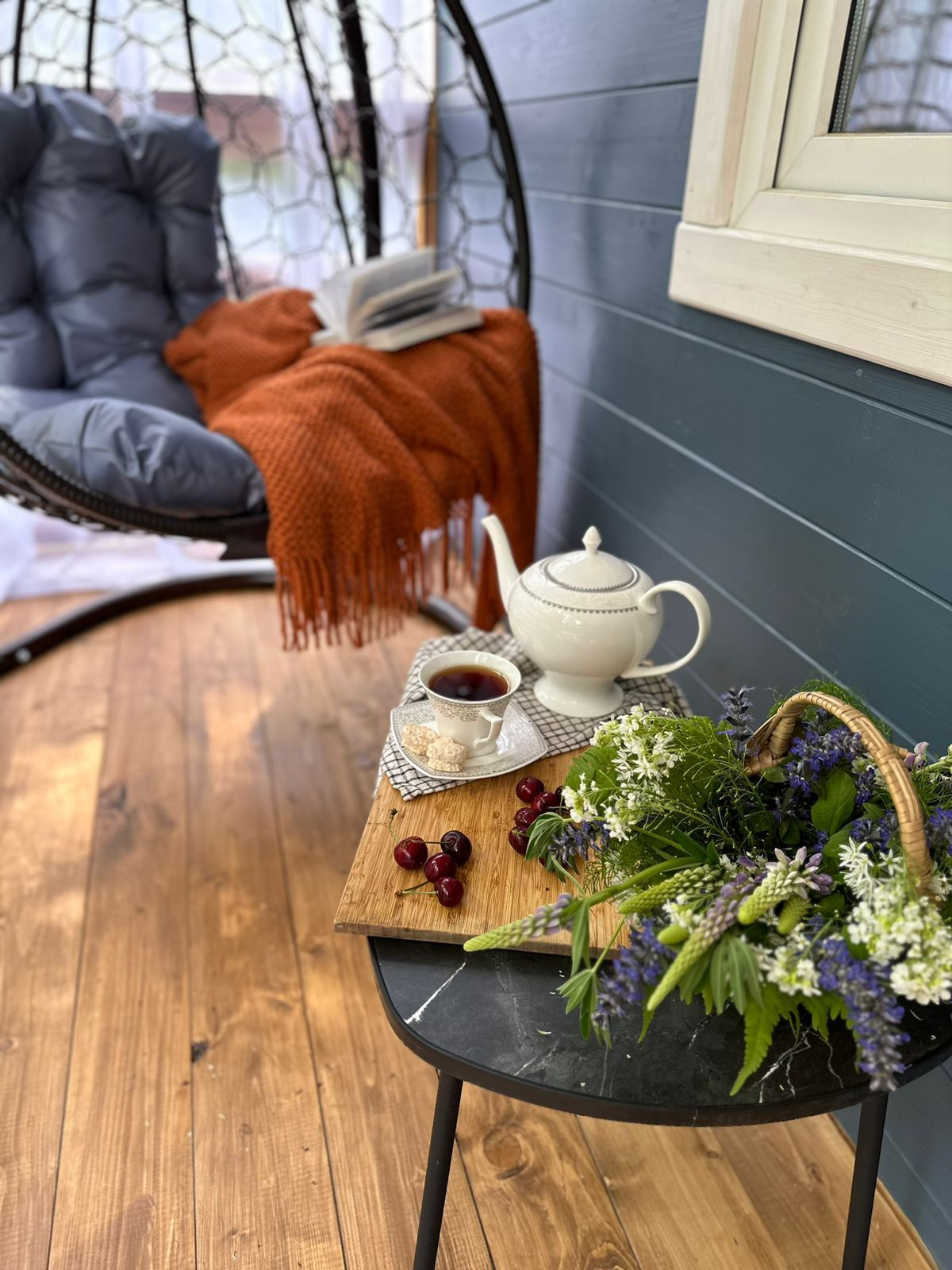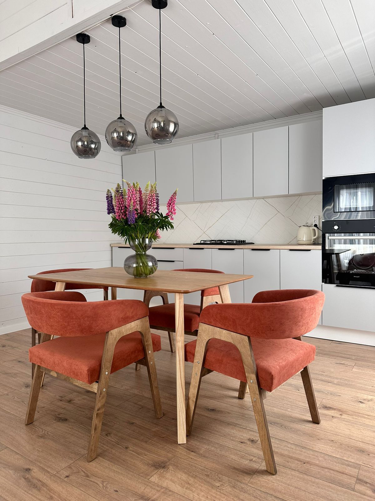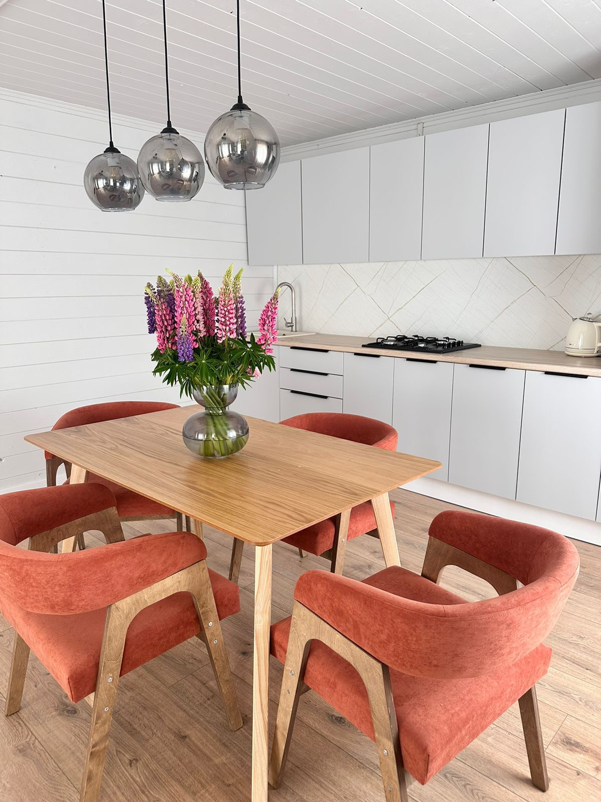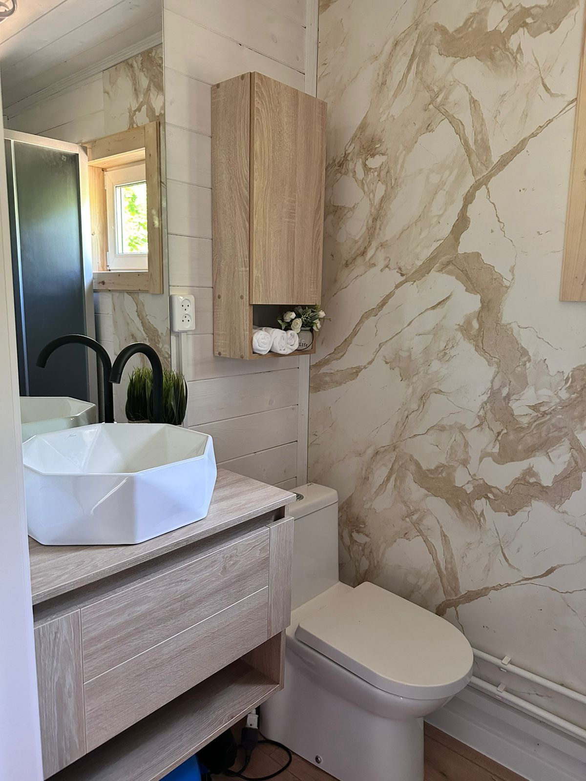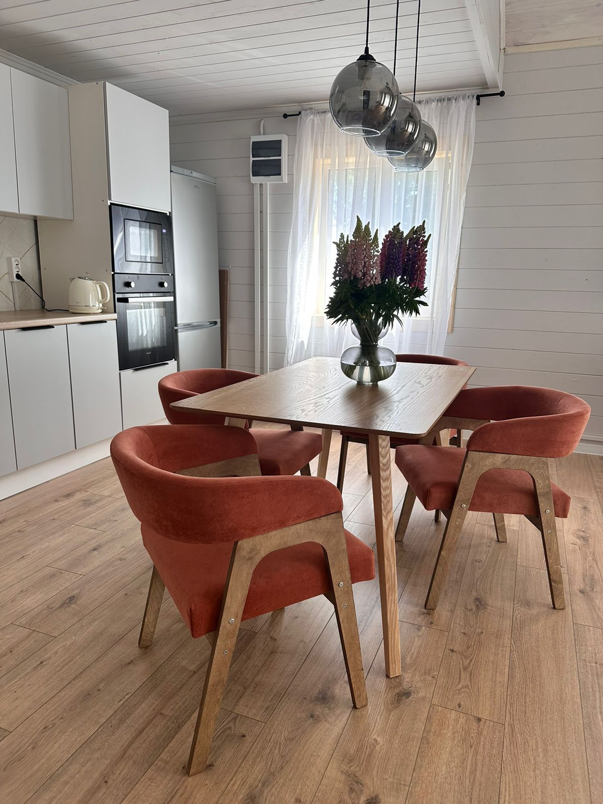 В доме 2 спальни, просторная кухня-гостиная с панорамным видом на лес,ванная комната, коридор, летняя веранда 9 кВ.м.