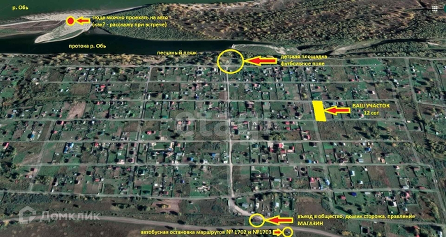 В продаже ровный участок под строительство дачи или загородного дома с возможностью круглогодичного проживания. На данном участке установлены столбы под забор и оплачено подключение электрической мощности 15 кВт! Живописное место на берегу р. Обь, где всегда можно отдохнуть от городской суеты. Общество очень развитое и дружное. Огорожено забором по всему периметру, въезд через шлагбаум, только собственникам - никаких посторонних! Есть круглогодичная охрана, магазин, собственная детская площадка, футбольное поле и песчаный пляж - все в обществе - не нужно ни куда ехать. На въезде остановка маршрутных автобусов - что позволяет добраться до дачи без автомобиля! Звоните, все расскажу, а так же свожу и покажу! Номер в базе: 7711098. Район: Заря НСТ.