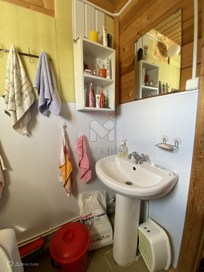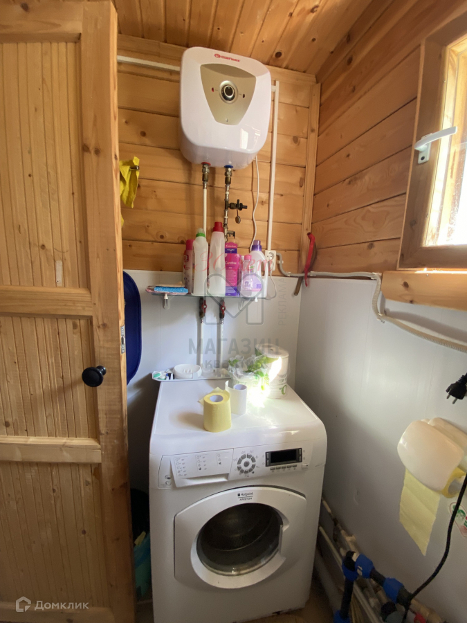 В доме на первом этаже находится санузел с подогревом проточной воды, стиральной машиной и унитазом.