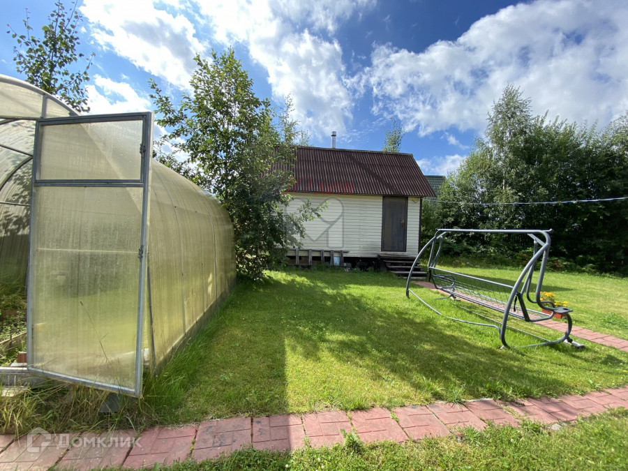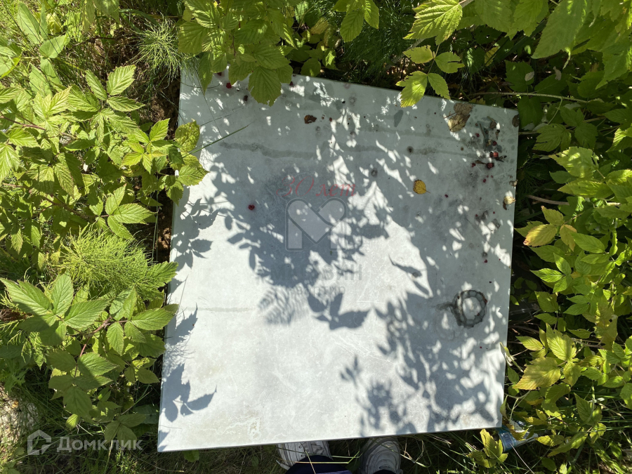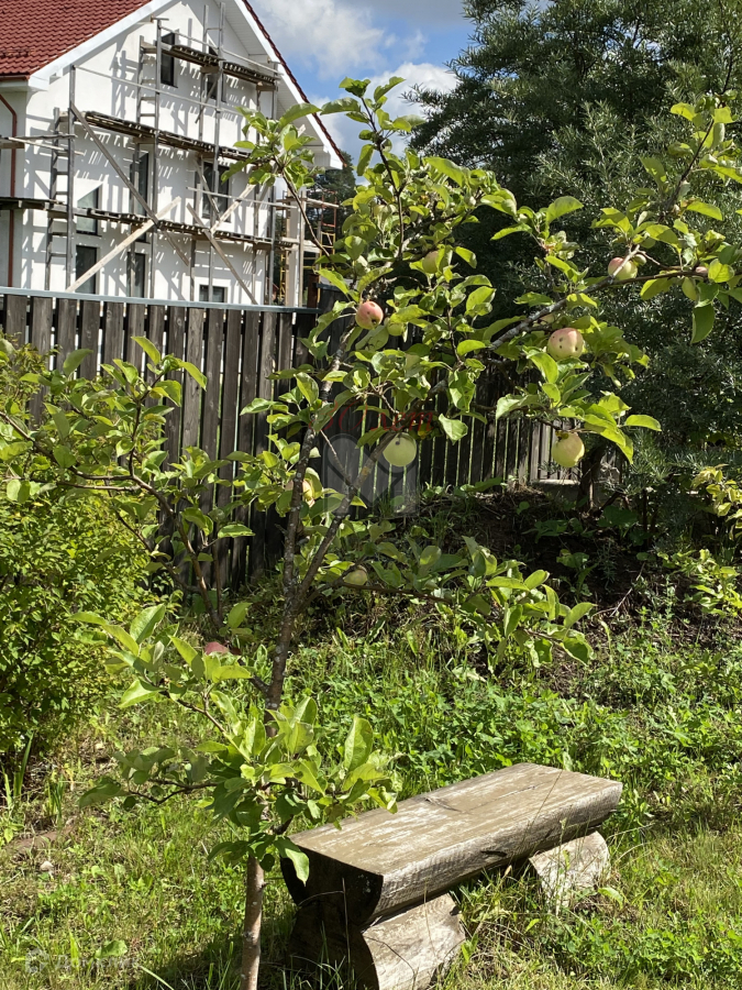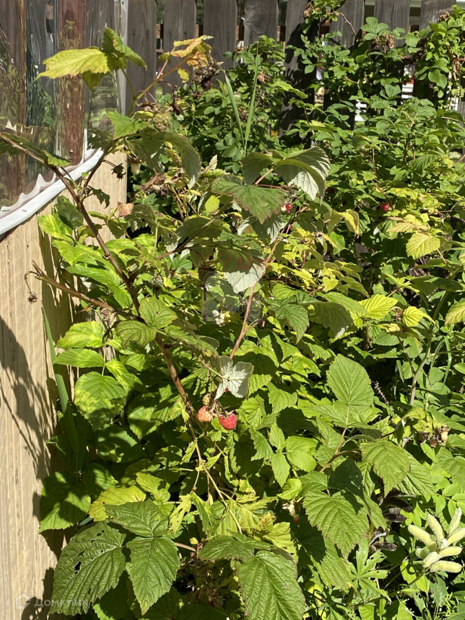 Растут несколько яблонь, три куста черной смородины, малина, грядки с клубникой. Есть теплица.