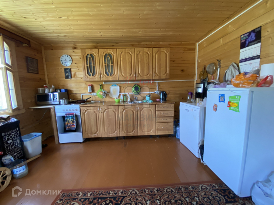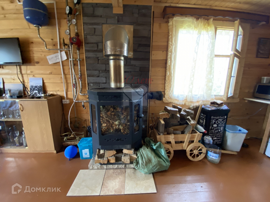 Большая уютная кухня-гостиная с посудомоечной машиной и печью, способной нагреть помещение за 20 минут до 20 градусов зимой в мороз. Подает тепло через систему отопления по батареям во все комнаты дома.