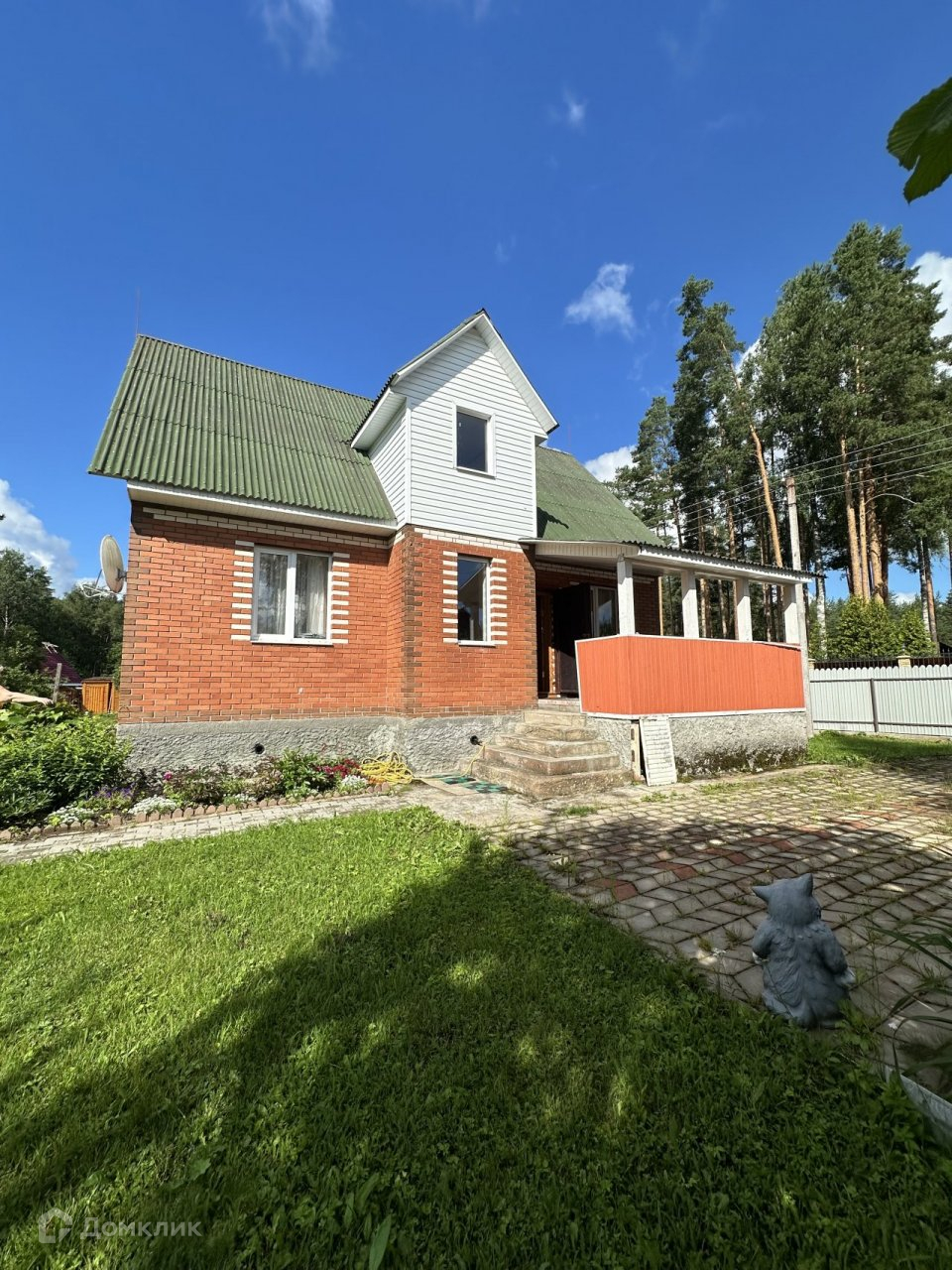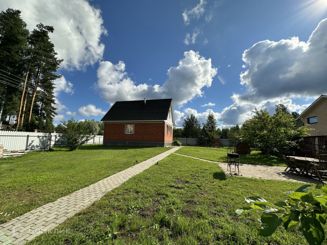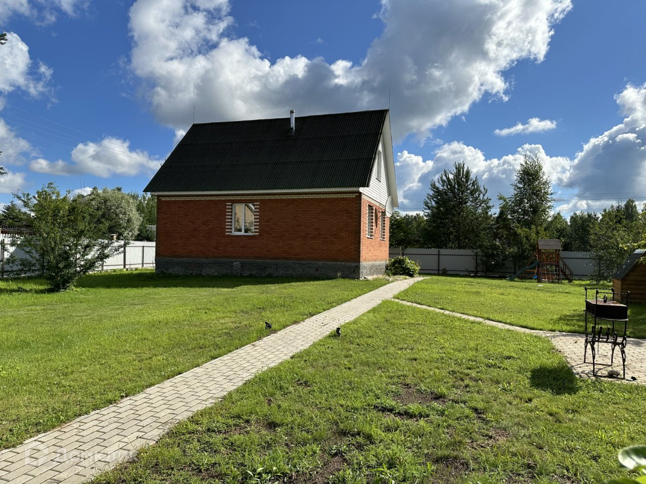 Участок. 10,08 соток, разработанный и ухоженный, огорожен забором из металлопрофиля. Въезд и дорожки на участке вымощены тротуарной плиткой, есть небольшая детская площадка, зона отдыха, газон и плодовые деревья. Участок расположен недалеко от выхода в лес и ручью, соседи с одной стороны.