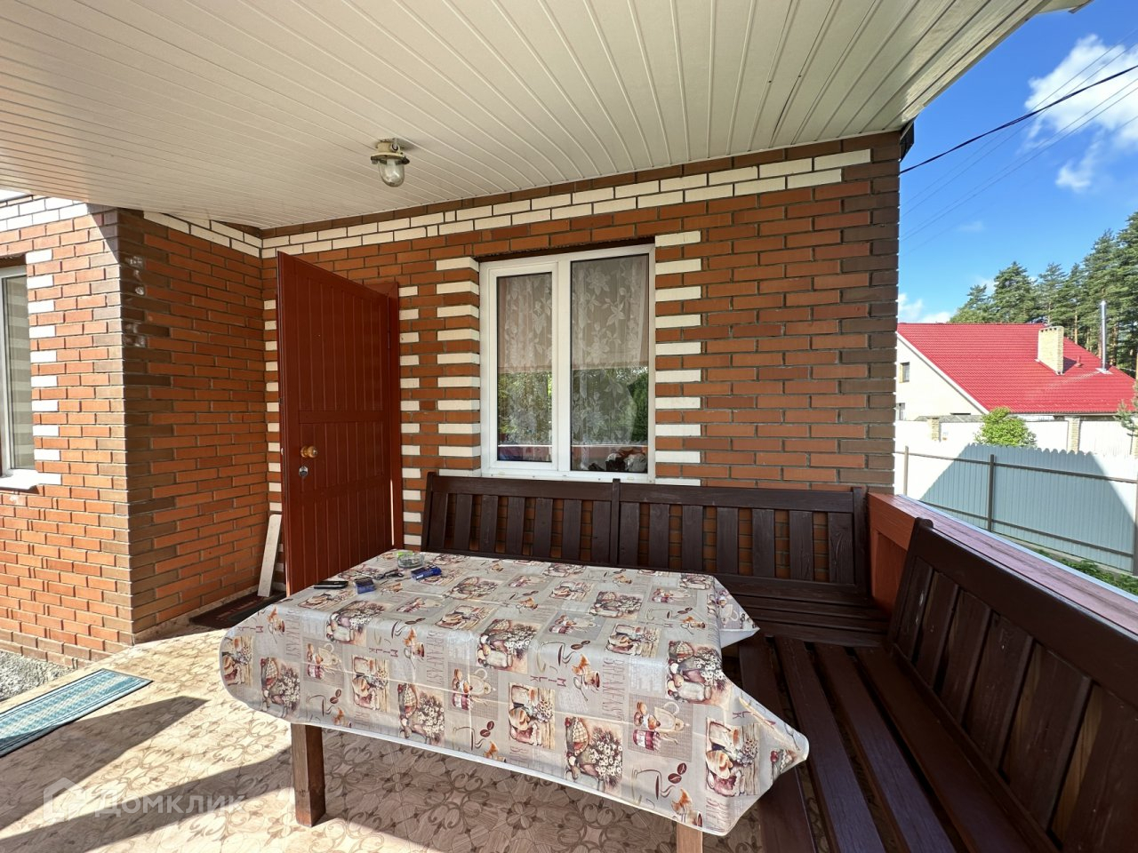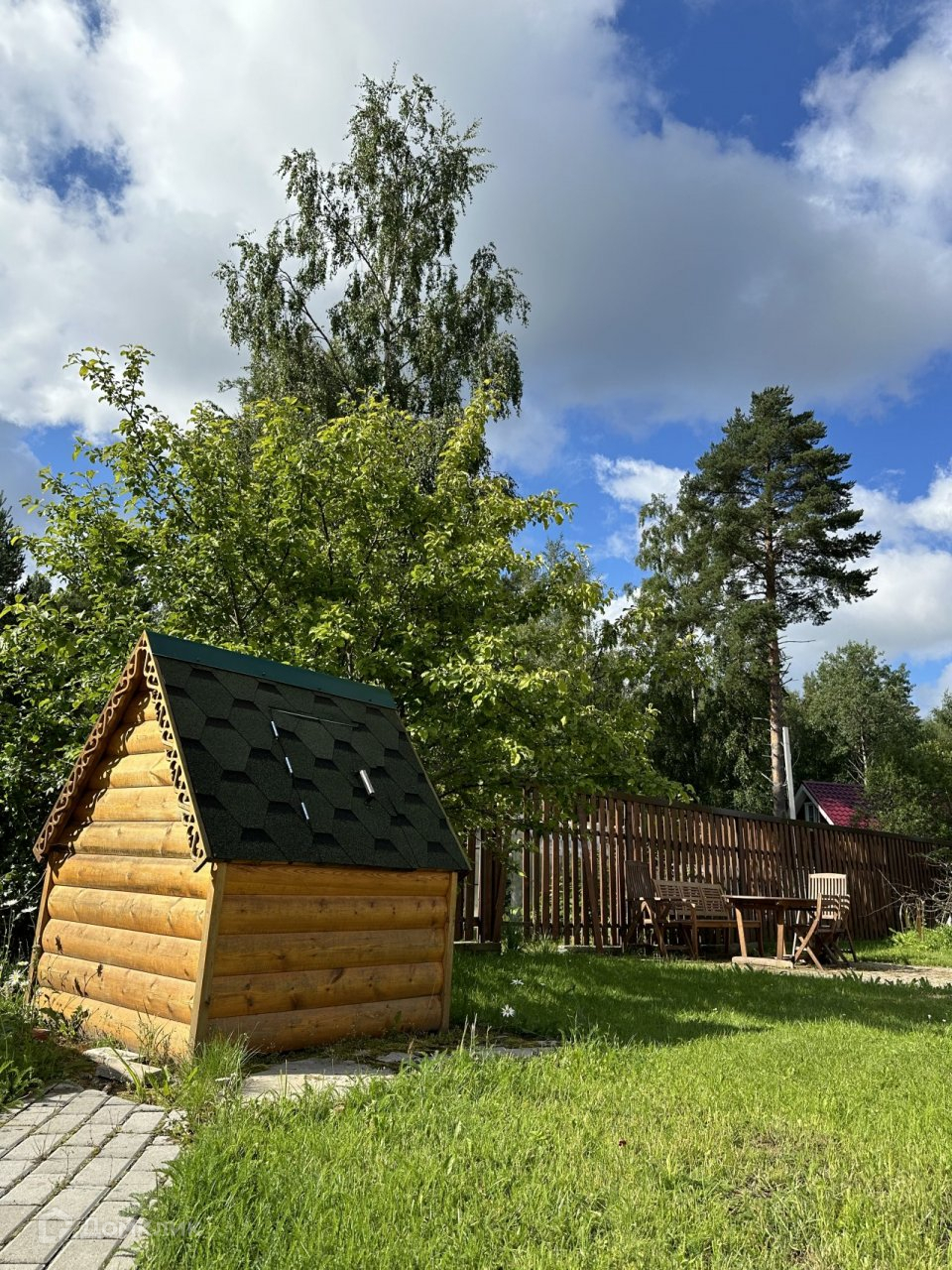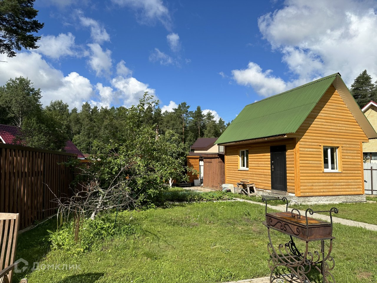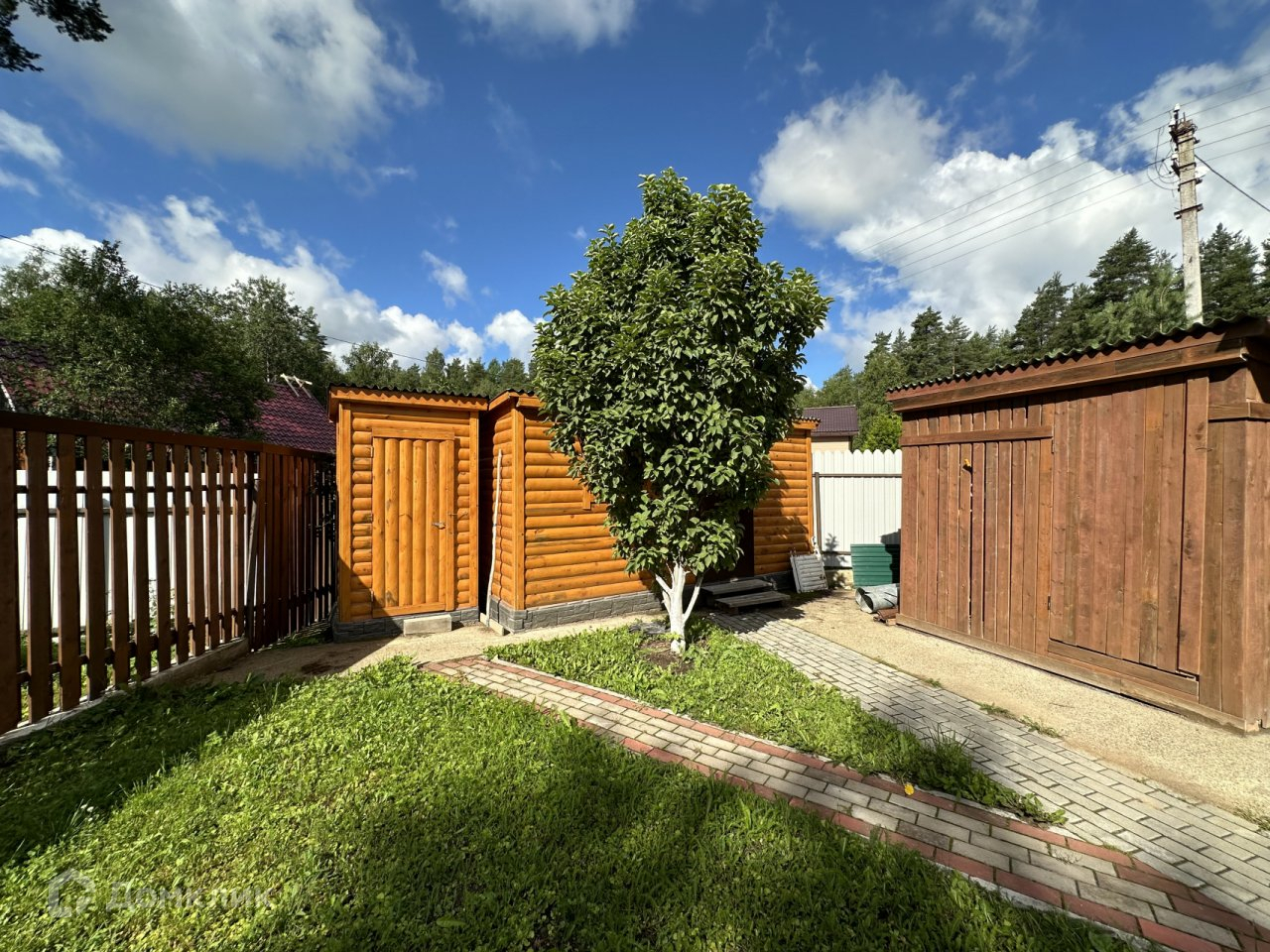 Участок. 10,08 соток, разработанный и ухоженный, огорожен забором из металлопрофиля. Въезд и дорожки на участке вымощены тротуарной плиткой, есть небольшая детская площадка, зона отдыха, газон и плодовые деревья. Участок расположен недалеко от выхода в лес и ручью, соседи с одной стороны.